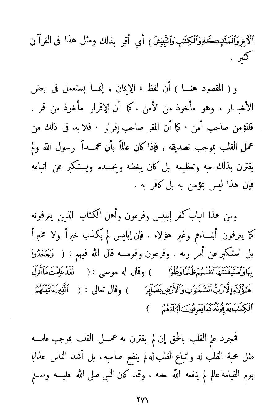 وَالْمَقْصُودُ هُنَا: أَنَّ لَفْظَ " الْإِيمَانِ " إنَّمَا يُسْتَعْمَلُ فِي بَعْضِ الْأَخْبَارِ وَهُوَ مَأْخُوذٌ مِنْ الْأَمْنِ كَمَا أَنَّ الْإِقْرَارَ مَأْخُوذٌ مِنْ قَرَّ فَالْمُؤْمِنُ صَاحِبُ أَمْنٍ كَمَا أَنَّ الْمُقِرَّ صَاحِبُ إقْرَارٍ فَلَا بُدَّ فِي ذَلِكَ مِنْ عَمَلِ الْقَلْبِ بِمُوجَبِ تَصْدِيقِهِ فَإِذَا كَانَ عَالِمًا بِأَنَّ مُحَمَّدًا رَسُولُ اللَّهِ وَلَمْ يَقْتَرِنْ بِذَلِكَ حُبُّهُ وَتَعْظِيمُهُ بَلْ كَانَ يُبْغِضُهُ وَيَحْسُدُهُ وَيَسْتَكْبِرُ عَنْ اتِّبَاعِهِ فَإِنَّ هَذَا لَيْسَ بِمُؤْمِنٍ بِهِ بَلْ كَافِرٌ بِهِ. وَمِنْ هَذَا الْبَابِ كُفْرُ إبْلِيسَ وَفِرْعَوْنَ وَأَهْلِ الْكِتَابِ الَّذِينَ يَعْرِفُونَهُ كَمَا يَعْرِفُونَ أَبْنَاءَهُمْ وَغَيْرِ هَؤُلَاءِ فَإِنَّ إبْلِيسَ لَمْ يُكَذِّبْ خَبَرًا وَلَا مُخْبِرًا بَلْ اسْتَكْبَرَ عَنْ أَمْرِ رَبِّهِ. وَفِرْعَوْنُ وَقَوْمُهُ قَالَ اللَّهُ فِيهِمْ: {وَجَحَدُوا بِهَا وَاسْتَيْقَنَتْهَا أَنْفُسُهُمْ ظُلْمًا وَعُلُوًّا} وَقَالَ لَهُ مُوسَى: {لَقَدْ عَلِمْتَ مَا أَنْزَلَ هَؤُلَاءِ إلَّا رَبُّ السَّمَاوَاتِ وَالْأَرْضِ بَصَائِرَ} وَقَالَ تَعَالَى: {الَّذِينَ آتَيْنَاهُمُ الْكِتَابَ يَعْرِفُونَهُ كَمَا يَعْرِفُونَ أَبْنَاءَهُمْ} فَمُجَرَّدُ عِلْمِ الْقَلْبِ بِالْحَقِّ إنْ لَمْ يَقْتَرِنْ بِهِ عَمَلُ الْقَلْبِ بِمُوجَبِ عِلْمِهِ مِثْلُ مَحَبَّةِ الْقَلْبِ لَهُ وَاتِّبَاعِ الْقَلْبِ لَهُ لَمْ يَنْفَعْ صَاحِبَهُ بَلْ أَشَدُّ النَّاسِ عَذَابًا يَوْمَ الْقِيَامَةِ عَالِمٌ لَمْ يَنْفَعْهُ اللَّهُ بِعِلْمِهِ وَقَدْ كَانَ النَّبِيُّ صَلَّى اللَّهُ عَلَيْهِ وَسَلَّمَ