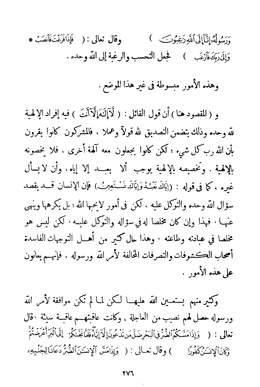 فَضْلِهِ وَرَسُولُهُ إنَّا إلَى اللَّهِ رَاغِبُونَ} وَقَالَ تَعَالَى: {فَإِذَا فَرَغْتَ فَانْصَبْ} {وَإِلَى رَبِّكَ فَارْغَبْ} فَجَعَلَ التَّحَسُّبَ وَالرَّغْبَةَ إلَى اللَّهِ وَحْدَهُ. وَهَذِهِ الْأُمُورُ مَبْسُوطَةٌ فِي غَيْرِ هَذَا الْمَوْضِعِ. وَ (الْمَقْصُودُ) هُنَا أَنَّ قَوْلَ الْقَائِلِ: {لَا إلَهَ إلَّا أَنْتَ} فِيهِ إفْرَادُ الْإِلَهِيَّةِ لِلَّهِ وَحْدَهُ وَذَلِكَ يَتَضَمَّنُ التَّصْدِيقَ لِلَّهِ قَوْلًا وَعَمَلًا فَالْمُشْرِكُونَ كَانُوا يُقِرُّونَ بِأَنَّ اللَّهَ رَبُّ كُلِّ شَيْءٍ؛ لَكِنْ كَانُوا يَجْعَلُونَ مَعَهُ آلِهَةً أُخْرَى فَلَا يَخُصُّونَهُ بِالْإِلَهِيَّةِ. وَتَخْصِيصُهُ بِالْإِلَهِيَّةِ يُوجِبُ أَلَّا يُعْبَدَ إلَّا إيَّاهُ وَأَنْ لَا يُسْأَلَ غَيْرُهُ كَمَا فِي قَوْلِهِ: {إيَّاكَ نَعْبُدُ وَإِيَّاكَ نَسْتَعِينُ} فَإِنَّ الْإِنْسَانَ قَدْ يَقْصِدُ سُؤَالَ اللَّهِ وَحْدَهُ وَالتَّوَكُّلَ عَلَيْهِ لَكِنْ فِي أُمُورٍ لَا يُحِبُّهَا اللَّهُ؛ بَلْ يَكْرَهُهَا وَيَنْهَى عَنْهَا فَهَذَا وَإِنْ كَانَ مُخْلِصًا لَهُ فِي سُؤَالِهِ وَالتَّوَكُّلِ عَلَيْهِ لَكِنْ لَيْسَ هُوَ مُخْلِصًا فِي عِبَادَتِهِ وَطَاعَتِهِ وَهَذَا حَالُ كَثِيرٍ مِنْ أَهْلِ التَّوَجُّهَاتِ الْفَاسِدَةِ أَصْحَابِ الْكُشُوفَاتِ وَالتَّصَرُّفَاتِ الْمُخَالِفَةِ لِأَمْرِ اللَّهِ وَرَسُولِهِ فَإِنَّهُمْ يُعَانُونَ عَلَى هَذِهِ الْأُمُورِ. وَكَثِيرٌ مِنْهُمْ يَسْتَعِينُ اللَّهَ عَلَيْهَا لَكِنْ لَمَّا لَمْ تَكُنْ مُوَافِقَةً لِأَمْرِ اللَّهِ وَرَسُولِهِ حَصَلَ لَهُمْ نَصِيبٌ مِنْ الْعَاجِلَةِ وَكَانَتْ عَاقِبَتُهُمْ عَاقِبَةً سَيِّئَةً قَالَ تَعَالَى: {وَإِذَا مَسَّكُمُ الضُّرُّ فِي الْبَحْرِ ضَلَّ مَنْ تَدْعُونَ إلَّا إيَّاهُ فَلَمَّا نَجَّاكُمْ إلَى الْبَرِّ أَعْرَضْتُمْ وَكَانَ الْإِنْسَانُ كَفُورًا} وَقَالَ تَعَالَى: {وَإِذَا مَسَّ الْإِنْسَانَ