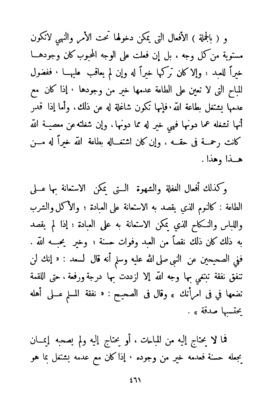 و (بِالْجُمْلَةِ الْأَفْعَالُ الَّتِي يُمْكِنُ دُخُولُهَا تَحْتَ الْأَمْرِ وَالنَّهْيِ لَا تَكُونُ مُسْتَوِيَةً مِنْ كُلِّ وَجْهٍ بَلْ إنْ فُعِلَتْ عَلَى الْوَجْهِ الْمَحْبُوبِ كَانَ وُجُودُهَا خَيْرًا لِلْعَبْدِ: وَإِلَّا كَانَ تَرْكُهَا خَيْرًا لَهُ وَإِنْ لَمْ يُعَاقَبْ عَلَيْهَا فَفُضُولُ الْمُبَاحِ الَّتِي لَا تُعِينُ عَلَى الطَّاعَةِ عَدَمُهَا خَيْرٌ مِنْ وُجُودِهَا إذَا كَانَ مَعَ عَدَمِهَا يَشْتَغِلُ بِطَاعَةِ اللَّهِ فَإِنَّهَا تَكُونُ شَاغِلَةً لَهُ عَنْ ذَلِكَ وَأَمَّا إذَا قُدِّرَ أَنَّهَا تَشْغَلُهُ عَمَّا دُونَهَا فَهِيَ خَيْرٌ لَهُ مِمَّا دُونَهَا وَإِنْ شَغَلَتْهُ عَنْ مَعْصِيَةِ اللَّهِ كَانَتْ رَحْمَةً فِي حَقِّهِ وَإِنْ كَانَ اشْتِغَالُهُ بِطَاعَةِ اللَّهِ خَيْرًا لَهُ مِنْ هَذَا وَهَذَا. وَكَذَلِكَ أَفْعَالُ الْغَفْلَةِ وَالشَّهْوَةِ الَّتِي يُمْكِنُ الِاسْتِعَانَةُ بِهَا عَلَى الطَّاعَةِ: كَالنَّوْمِ الَّذِي يُقْصَدُ بِهِ الِاسْتِعَانَةُ عَلَى الْعِبَادَةِ؛ وَالْأَكْلِ وَالشُّرْبِ وَاللِّبَاسِ وَالنِّكَاحِ الَّذِي يُمْكِنُ الِاسْتِعَانَةُ بِهِ عَلَى الْعِبَادَةِ؛ إذَا لَمْ يَقْصِدْ بِهِ ذَلِكَ كَانَ ذَلِكَ نَقْصًا مِنْ الْعَبْدِ وَفَوَاتَ حَسَنَةٍ؛ وَخَيْرٍ يُحِبُّهُ اللَّهُ. فَفِي الصَّحِيحَيْنِ عَنْ النَّبِيِّ صَلَّى اللَّهُ عَلَيْهِ وَسَلَّمَ {أَنَّهُ قَالَ لِسَعْدِ: إنَّك لَنْ تُنْفِقَ نَفَقَةً تَبْتَغِي بِهَا وَجْهَ اللَّهِ إلَّا ازْدَدْت بِهَا دَرَجَةً وَرِفْعَةً حَتَّى اللُّقْمَةُ تَضَعُهَا فِي فِي امْرَأَتِك} " وَقَالَ فِي الصَّحِيحِ: {نَفَقَةُ الْمُسْلِمِ عَلَى أَهْلِهِ يَحْتَسِبُهَا صَدَقَةً} ". فَمَا لَا يَحْتَاجُ إلَيْهِ مِنْ الْمُبَاحَاتِ أَوْ يَحْتَاجُ إلَيْهِ وَلَمْ يَصْحَبْهُ إيمَانٌ يَجْعَلُهُ حَسَنَةً فَعَدَمُهُ خَيْرٌ مِنْ وُجُودِهِ إذَا كَانَ مَعَ عَدَمِهِ يَشْتَغِلُ بِمَا هُوَ