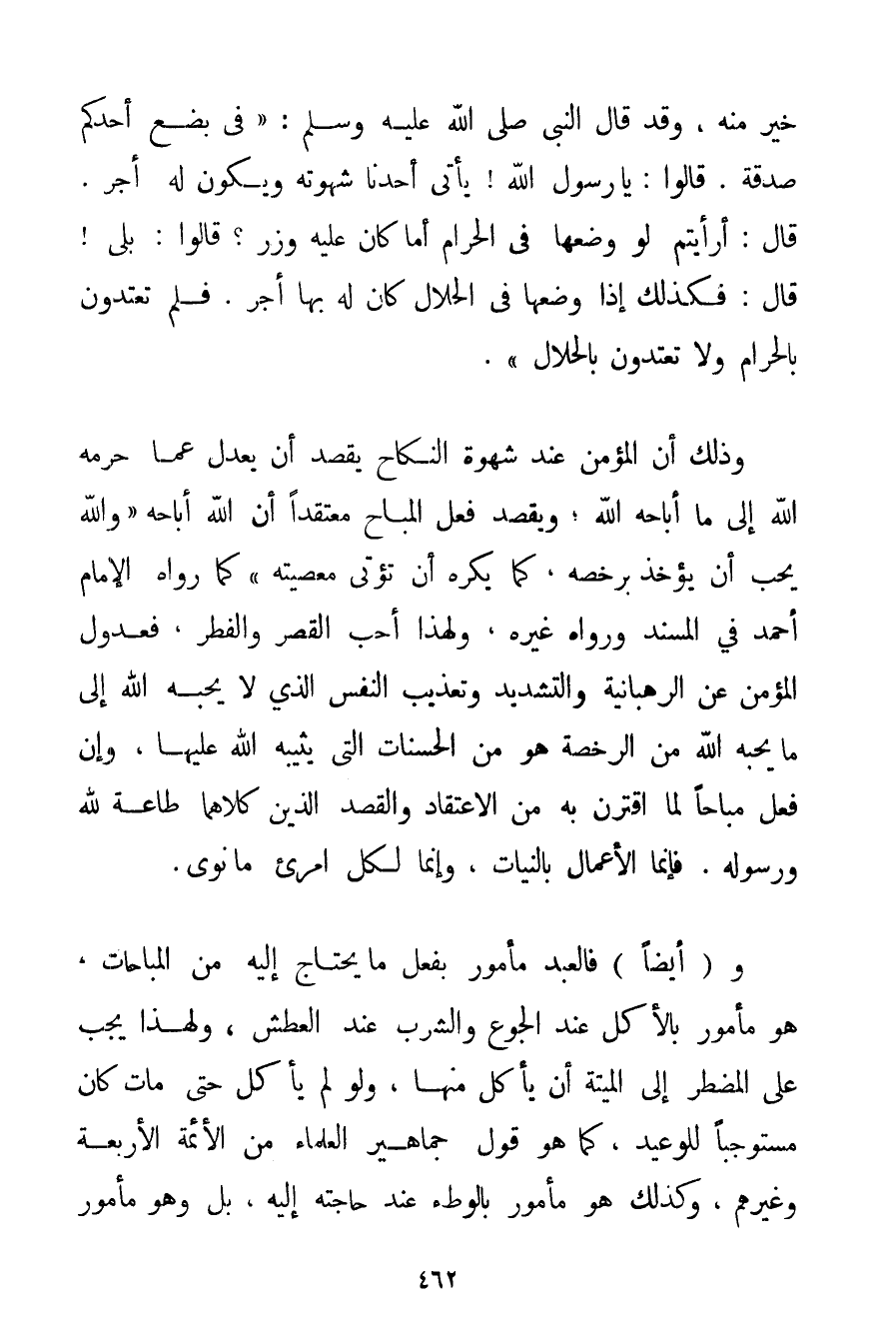 خَيْرٌ مِنْهُ. وَقَدْ قَالَ النَّبِيُّ صَلَّى اللَّهُ عَلَيْهِ وَسَلَّمَ " {فِي بُضْعِ أَحَدِكُمْ صَدَقَةٌ. قَالُوا: يَا رَسُولَ اللَّهِ يَأْتِي أَحَدُنَا شَهْوَتَهُ وَيَكُونُ لَهُ أَجْرٌ. قَالَ: أَرَأَيْتُمْ لَوْ وَضَعَهَا فِي الْحَرَامِ أَمَا كَانَ عَلَيْهِ وِزْرٌ؟ قَالُوا: بَلَى قَالَ: فَكَذَلِكَ إذَا وَضَعَهَا فِي الْحَلَالِ كَانَ لَهُ بِهَا أَجْرٌ. فَلِمَ تَعْتَدُّونَ بِالْحَرَامِ وَلَا تَعْتَدُّونَ بِالْحَلَالِ} ". وَذَلِكَ أَنَّ الْمُؤْمِنَ عِنْدَ شَهْوَةِ النِّكَاحِ يَقْصِدُ أَنْ يَعْدِلَ عَمَّا حَرَّمَهُ اللَّهُ إلَى مَا أَبَاحَهُ اللَّهُ؛ وَيَقْصِدُ فِعْلَ الْمُبَاحِ مُعْتَقِدًا أَنَّ اللَّهَ أَبَاحَهُ " {وَاَللَّهُ يُحِبُّ أَنْ يُؤْخَذَ بِرُخَصِهِ كَمَا يَكْرَهُ أَنْ تُؤْتَى مَعْصِيَتُهُ} " كَمَا رَوَاهُ الْإِمَامُ أَحْمَد فِي الْمُسْنَدِ وَرَوَاهُ غَيْرُهُ وَلِهَذَا أَحَبّ الْقَصْرَ وَالْفِطْرَ فَعُدُولُ الْمُؤْمِنِ عَنْ الرَّهْبَانِيَّةِ وَالتَّشْدِيدِ وَتَعْذِيبِ النَّفْسِ الَّذِي لَا يُحِبُّهُ اللَّهُ إلَى مَا يُحِبُّهُ اللَّهُ مِنْ الرُّخْصَةِ هُوَ مِنْ الْحَسَنَاتِ الَّتِي يُثِيبُهُ اللَّهُ عَلَيْهَا وَإِنْ فَعَلَ مُبَاحًا لَمَا اقْتَرَنَ بِهِ مِنْ الِاعْتِقَادِ وَالْقَصْدِ الَّذِينَ كِلَاهُمَا طَاعَةٌ لِلَّهِ وَرَسُولِهِ. فَإِنَّمَا الْأَعْمَالُ بِالنِّيَّاتِ وَإِنَّمَا لِكُلِّ امْرِئٍ مَا نَوَى. وَ (أَيْضًا فَالْعَبْدُ مَأْمُورٌ بِفِعْلِ مَا يَحْتَاجُ إلَيْهِ مِنْ الْمُبَاحَاتِ هُوَ مَأْمُورٌ بِالْأَكْلِ عِنْدَ الْجُوعِ وَالشُّرْبِ عِنْدَ الْعَطَشِ وَلِهَذَا يَجِبُ عَلَى الْمُضْطَرِّ إلَى الْمِيتَةِ أَنْ يَأْكُلَ مِنْهَا وَلَوْ لَمْ يَأْكُلْ حَتَّى مَاتَ كَانَ مُسْتَوْجِبًا لِلْوَعِيدِ كَمَا هُوَ قَوْلُ جَمَاهِيرِ الْعُلَمَاءِ مِنْ الْأَئِمَّةِ الْأَرْبَعَةِ وَغَيْرِهِمْ وَكَذَلِكَ هُوَ مَأْمُورٌ بِالْوَطْءِ عِنْدَ حَاجَتِهِ إلَيْهِ بَلْ وَهُوَ مَأْمُورٌ