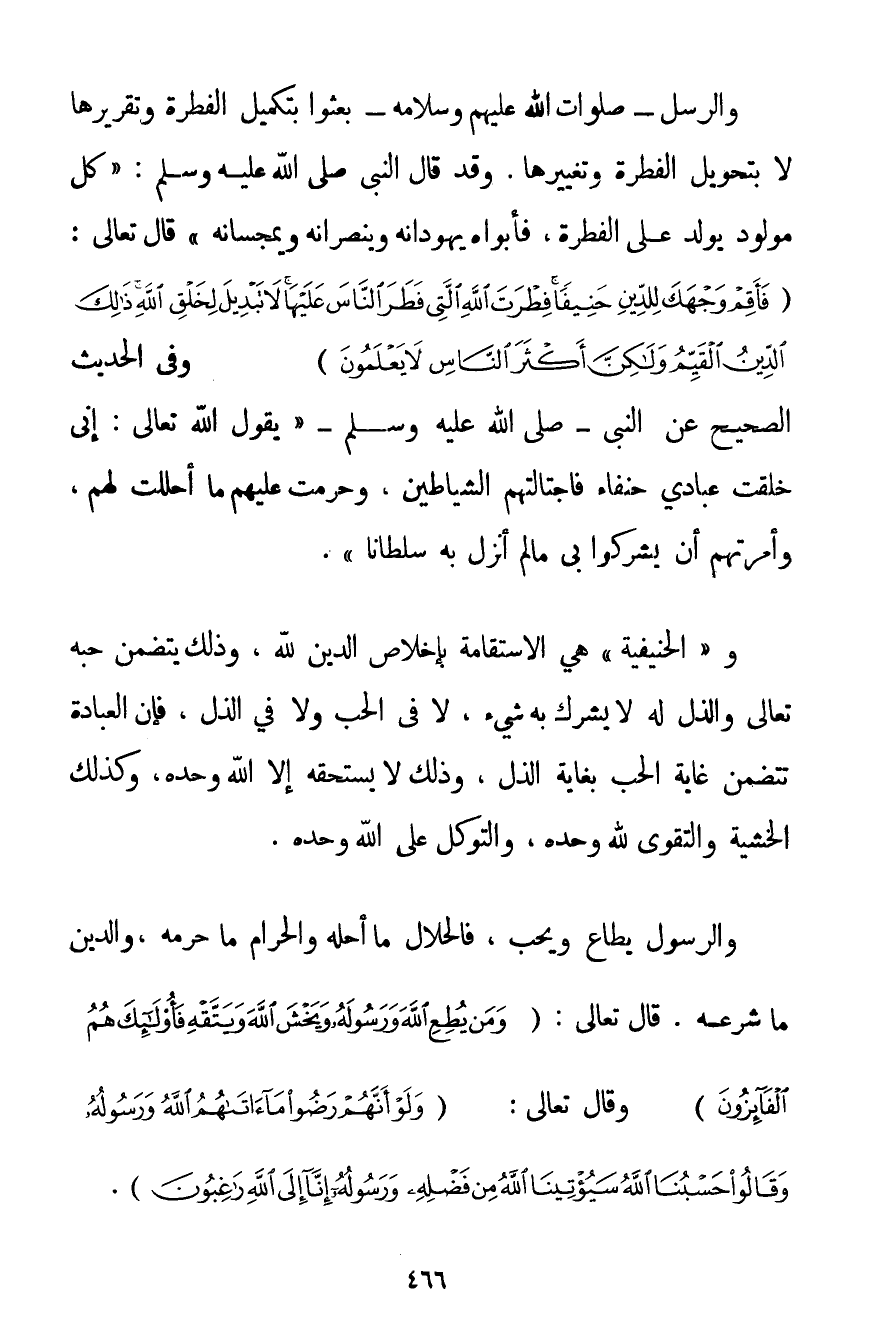 وَالرُّسُلُ - صَلَوَاتُ اللَّهِ عَلَيْهِمْ وَسَلَامُهُ - بُعِثُوا بِتَكْمِيلِ الْفِطْرَةِ وَتَقْرِيرِهَا لَا بِتَحْوِيلِ الْفِطْرَةِ وَتَغْيِيرِهَا. وَقَدْ قَالَ النَّبِيُّ صَلَّى اللَّهُ عَلَيْهِ وَسَلَّمَ " {كُلُّ مَوْلُودٍ يُولَدُ عَلَى الْفِطْرَةِ فَأَبَوَاهُ يُهَوِّدَانِهِ وَيُنَصِّرَانِهِ وَيُمَجِّسَانِهِ} " قَالَ تَعَالَى: {فَأَقِمْ وَجْهَكَ لِلدِّينِ حَنِيفًا فِطْرَةَ اللَّهِ الَّتِي فَطَرَ النَّاسَ عَلَيْهَا لَا تَبْدِيلَ لِخَلْقِ اللَّهِ ذَلِكَ الدِّينُ الْقَيِّمُ وَلَكِنَّ أَكْثَرَ النَّاسِ لَا يَعْلَمُونَ} وَفِي الْحَدِيثِ الصَّحِيحِ عَنْ النَّبِيِّ - صَلَّى اللَّهُ عَلَيْهِ وَسَلَّمَ - " {يَقُولُ اللَّهُ تَعَالَى: إنِّي خَلَقْت عِبَادِي حُنَفَاءَ فَاجْتَالَتْهُمْ الشَّيَاطِينُ وَحَرَّمَتْ عَلَيْهِمْ مَا أَحْلَلْت لَهُمْ وَأَمَرَتْهُمْ أَنْ يُشْرِكُوا بِي مَا لَمْ أُنَزِّلْ بِهِ سُلْطَانًا} ". وَ " الْحَنِيفِيَّةُ " هِيَ الِاسْتِقَامَةُ بِإِخْلَاصِ الدِّينِ لِلَّهِ وَذَلِكَ يَتَضَمَّنُ حُبَّهُ تَعَالَى وَالذُّلَّ لَهُ لَا يُشْرِكُ بِهِ شَيْئَا لَا فِي الْحُبِّ وَلَا فِي الذُّلِّ فَإِنَّ الْعِبَادَةَ تَتَضَمَّنُ غَايَةَ الْحُبِّ بِغَايَةِ الذُّلِّ وَذَلِكَ لَا يَسْتَحِقُّهُ إلَّا اللَّهُ وَحْدَهُ وَكَذَلِكَ الْخَشْيَةُ وَالتَّقْوَى لِلَّهِ وَحْدَهُ وَالتَّوَكُّلُ عَلَى اللَّهِ وَحْدَهُ.