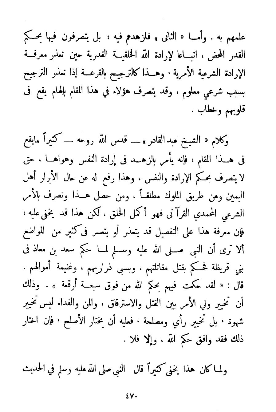عِلْمِهِمْ بِهِ. وَأَمَّا " الثَّانِي " فَلِزُهْدِهِمْ فِيهِ؛ بَلْ يَتَصَرَّفُونَ فِيهَا بِحُكْمِ الْقَدَرِ الْمَحْضِ اتِّبَاعًا لِإِرَادَةِ اللَّهِ الْخِلْقِيَّةِ الْقَدَرِيَّةِ حِينَ تَعَذَّرَ مَعْرِفَةُ الْإِرَادَةِ الشَّرْعِيَّةُ الْأَمْرِيَّةُ وَهَذَا كَالتَّرْجِيحِ بِالْقُرْعَةِ إذَا تَعَذَّرَ التَّرْجِيحُ بِسَبَبِ شَرْعِيٍّ مَعْلُومٍ وَقَدْ يَتَصَرَّفُ هَؤُلَاءِ فِي هَذَا الْمَقَامِ بِإِلْهَامِ يَقَعُ فِي قُلُوبِهِمْ وَخِطَابٍ. وَكَلَامُ " الشَّيْخِ عَبْدِ الْقَادِرِ " - قَدَّسَ اللَّهُ رُوحَهُ - كَثِيرًا مَا يَقَعُ فِي هَذَا الْمَقَامِ؛ فَإِنَّهُ يَأْمُرُ بِالزُّهْدِ فِي إرَادَةِ النَّفْسِ وَهَوَاهَا حَتَّى لَا يَتَصَرَّفَ بِحُكْمِ الْإِرَادَةِ وَالنَّفْسِ وَهَذَا رَفْعٌ لَهُ عَنْ حَالِ الْأَبْرَارِ أَهْلِ الْيَمِينِ وَعَنْ طَرِيقِ الْمُلُوكِ مُطْلَقًا وَمَنْ حَصَلَ هَذَا وَتَصَرَّفَ بِالْأَمْرِ الشَّرْعِيِّ الْمُحَمَّدِيِّ الْقُرْآنِيِّ فَهُوَ أَكْمَلُ الْخَلْقِ لَكِنَّ هَذَا قَدْ يَخْفَى عَلَيْهِ؛ فَإِنَّ مَعْرِفَةَ هَذَا عَلَى التَّفْصِيلِ قَدْ يَتَعَذَّرُ أَوْ يَتَعَسَّرُ فِي كَثِيرٍ مِنْ الْمَوَاضِعِ أَلَا تَرَى {أَنَّ النَّبِيَّ صَلَّى اللَّهُ عَلَيْهِ وَسَلَّمَ لَمَّا حَكَّمَ سَعْدَ بْنَ مُعَاذٍ فِي بَنِي قُرَيْظَةَ فَحَكَمَ بِقَتْلِ مُقَاتِلَتِهِمْ، وَبِسَبْيِ ذَرَارِيِّهِمْ وَغَنِيمَةِ أَمْوَالِهِمْ. قَالَ: لَقَدْ حَكَمْت فِيهِمْ بِحُكْمِ اللَّهِ مِنْ فَوْقِ سَبْعَةِ أَرْقِعَةٍ} ". وَذَلِكَ أَنَّ تَخْيِيرَ وَلِيِّ الْأَمْرِ بَيْنَ الْقَتْلِ وَالِاسْتِرْقَاقِ، وَالْمَنِّ وَالْفِدَاءِ لَيْسَ تَخْيِيرَ شَهْوَةٍ بَلْ تَخْيِيرَ رَأْيٍ وَمَصْلَحَةٍ فَعَلَيْهِ أَنْ يَخْتَارَ الْأَصْلَحَ، فَإِنْ اخْتَارَ ذَلِكَ فَقَدْ وَافَقَ حُكْمَ اللَّهِ وَإِلَّا فَلَا. وَلَمَّا كَانَ هَذَا يَخْفَى كَثِيرًا قَالَ النَّبِيُّ صَلَّى اللَّهُ عَلَيْهِ وَسَلَّمَ فِي الْحَدِيثِ