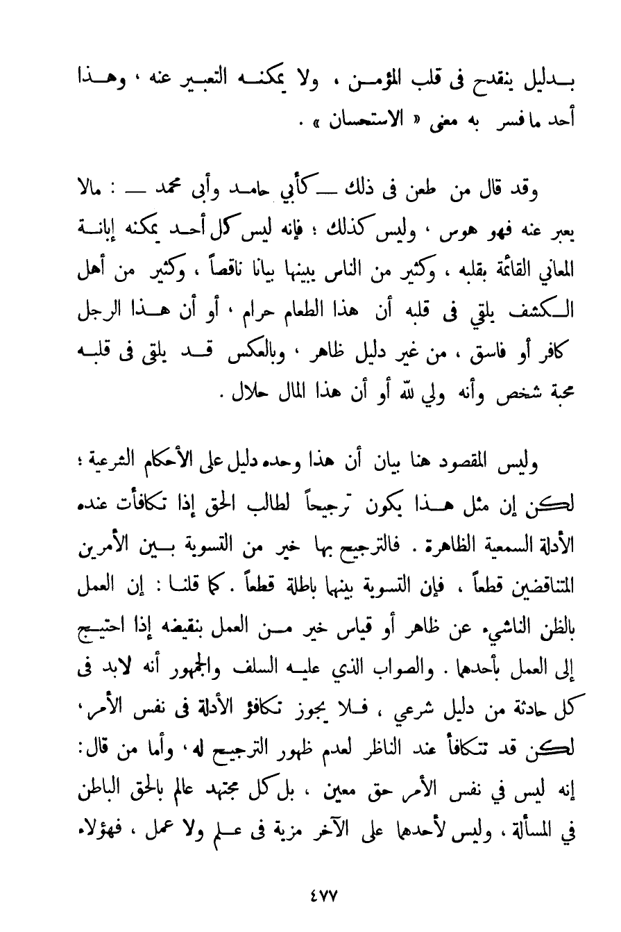 بِدَلِيلِ يَنْقَدِحُ فِي قَلْبِ الْمُؤْمِنِ وَلَا يُمْكِنُهُ التَّعْبِيرُ عَنْهُ وَهَذَا أَحَدُ مَا فُسِّرَ بِهِ مَعْنَى " الِاسْتِحْسَانِ ". وَقَدْ قَالَ مَنْ طَعَنَ فِي ذَلِكَ - كَأَبِي حَامِدٍ وَأَبِي مُحَمَّدٍ -: مَا لَا يُعَبِّرُ عَنْهُ فَهُوَ هَوَسٌ وَلَيْسَ كَذَلِكَ؛ فَإِنَّهُ لَيْسَ كُلُّ أَحَدٍ يُمْكِنُهُ إبَانَةَ الْمَعَانِي الْقَائِمَةِ بِقَلْبِهِ، وَكَثِيرٌ مِنْ النَّاسِ يُبَيِّنُهَا بَيَانًا نَاقِصًا وَكَثِيرٌ مِنْ أَهْلِ الْكَشْفِ يُلْقَى فِي قَلْبِهِ أَنَّ هَذَا الطَّعَامَ حَرَامٌ أَوْ أَنَّ هَذَا الرَّجُلَ كَافِرٌ أَوْ فَاسِقٌ مِنْ غَيْرِ دَلِيلٍ ظَاهِرٍ وَبِالْعَكْسِ قَدْ يُلْقَى فِي قَلْبِهِ مَحَبَّةُ شَخْصٍ وَأَنَّهُ وَلِيٌّ لِلَّهِ أَوْ أَنَّ هَذَا الْمَالَ حَلَالٌ. وَلَيْسَ الْمَقْصُودُ هُنَا بَيَانَ أَنَّ هَذَا وَحْدَهُ دَلِيلٌ عَلَى الْأَحْكَامِ الشَّرْعِيَّةِ؛ لَكِنْ إنَّ مِثْلَ هَذَا يَكُونُ تَرْجِيحًا لِطَالِبِ الْحَقِّ إذَا تَكَافَأَتْ عِنْدَهُ الْأَدِلَّةُ السَّمْعِيَّةُ الظَّاهِرَةُ. فَالتَّرْجِيحُ بِهَا خَيْرٌ مِنْ التَّسْوِيَةِ بَيْنَ الْأَمْرَيْنِ الْمُتَنَاقِضَيْنِ قَطْعًا فَإِنَّ التَّسْوِيَةَ بَيْنَهُمَا بَاطِلَةٌ قَطْعًا. كَمَا قُلْنَا: إنَّ الْعَمَلَ بِالظَّنِّ النَّاشِئِ عَنْ ظَاهِرٍ أَوْ قِيَاسٍ خَيْرٌ مِنْ الْعَمَلِ بِنَقِيضِهِ إذَا اُحْتِيجَ إلَى الْعَمَلِ بِأَحَدِهِمَا. وَالصَّوَابُ الَّذِي عَلَيْهِ السَّلَفُ وَالْجُمْهُورُ أَنَّهُ لَا بُدَّ فِي كُلِّ حَادِثَةٍ مِنْ دَلِيلٍ شَرْعِيٍّ فَلَا يَجُوزُ تَكَافُؤُ الْأَدِلَّةِ فِي نَفْسِ الْأَمْرِ لَكِنْ قَدْ تَتَكَافَأُ عِنْدَ النَّاظِرِ لِعَدَمِ ظُهُورِ التَّرْجِيحِ لَهُ وَأَمَّا مَنْ قَالَ: أَنَّهُ لَيْسَ فِي نَفْسِ الْأَمْرِ حَقٌّ مُعَيَّنٌ بَلْ كُلُّ مُجْتَهِدٍ عَالِمٍ بِالْحَقِّ الْبَاطِنِ فِي الْمَسْأَلَةِ وَلَيْسَ لِأَحَدِهِمَا عَلَى الْآخَرِ مَزِيَّةٌ فِي عِلْمٍ وَلَا عَمَلٍ فَهَؤُلَاءِ