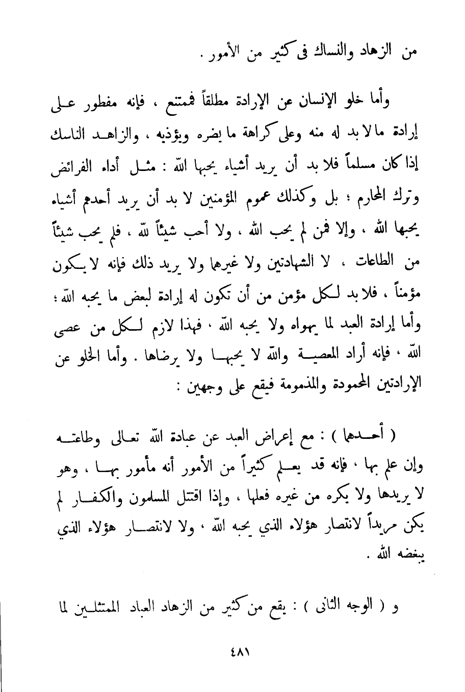 مِنْ الزُّهَّادِ وَالنُّسَّاكِ فِي كَثِيرٍ مِنْ الْأُمُورِ. وَأَمَّا خُلُوُّ الْإِنْسَانِ عَنْ الْإِرَادَةِ مُطْلَقًا فَمُمْتَنِعٌ فَإِنَّهُ مَفْطُورٌ عَلَى إرَادَةِ مَا لَا بُدَّ لَهُ مِنْهُ وَعَلَى كَرَاهَةِ مَا يَضُرُّهُ وَيُؤْذِيهِ وَالزَّاهِدُ النَّاسِكُ إذَا كَانَ مُسْلِمًا فَلَا بُدَّ أَنْ يُرِيدَ أَشْيَاءَ يُحِبُّهَا اللَّهُ: مِثْلُ أَدَاءِ الْفَرَائِضِ، وَتَرْكِ الْمَحَارِمِ؛ بَلْ وَكَذَلِكَ عُمُومُ الْمُؤْمِنِينَ لَا بُدَّ أَنْ يُرِيدَ أَحَدُهُمْ أَشْيَاءَ يُحِبُّهَا اللَّهُ وَإِلَّا فَمَنْ لَمْ يُحِبّ اللَّهَ وَلَا أَحَبّ شَيْئًا لِلَّهِ فَلَمْ يُحِبّ شَيْئًا مِنْ الطَّاعَاتِ لَا الشَّهَادَتَيْنِ وَلَا غَيْرِهِمَا، وَلَا يُرِيدُ ذَلِكَ فَإِنَّهُ لَا يَكُونُ مُؤْمِنًا فَلَا بُدَّ لِكُلِّ مُؤْمِنٍ مِنْ أَنْ تَكُونَ لَهُ إرَادَةٌ لِبَعْضِ مَا يُحِبُّهُ اللَّهُ؛ وَأَمَّا إرَادَةُ الْعَبْدِ لِمَا يَهْوَاهُ وَلَا يُحِبُّهُ اللَّهُ فَهَذَا لَازِمٌ لِكُلِّ مَنْ عَصَى اللَّهَ فَإِنَّهُ أَرَادَ الْمَعْصِيَةَ وَاَللَّهُ لَا يُحِبُّهَا وَلَا يَرْضَاهَا. وَأَمَّا الْخُلُوُّ عَنْ الْإِرَادَتَيْنِ الْمَحْمُودَةِ وَالْمَذْمُومَةِ فَيَقَعُ عَلَى وَجْهَيْنِ: (أَحَدُهُمَا) : مَعَ إعْرَاضِ الْعَبْدِ عَنْ عِبَادَةِ اللَّهِ تَعَالَى وَطَاعَتِهِ وَإِنْ عَلِمَ بِهَا فَإِنَّهُ قَدْ يَعْلَمُ كَثِيرًا مِنْ الْأُمُورِ أَنَّهُ مَأْمُورٌ بِهَا وَهُوَ لَا يُرِيدُهَا وَلَا يَكْرَهُ مِنْ غَيْرِهِ فِعْلَهَا وَإِذَا اقْتَتَلَ الْمُسْلِمُونَ وَالْكُفَّارُ لَمْ يَكُنْ مُرِيدًا لِانْتِصَارِ هَؤُلَاءِ الَّذِي يُحِبُّهُ اللَّهُ وَلَا لِانْتِصَارِ هَؤُلَاءِ الَّذِي يُبْغِضُهُ اللَّهُ. وَ (الْوَجْهُ الثَّانِي) : يَقَعُ مِنْ كَثِيرٍ مِنْ الزُّهَّادِ الْعُبَّادِ الْمُمْتَثِلِينَ لِمَا
