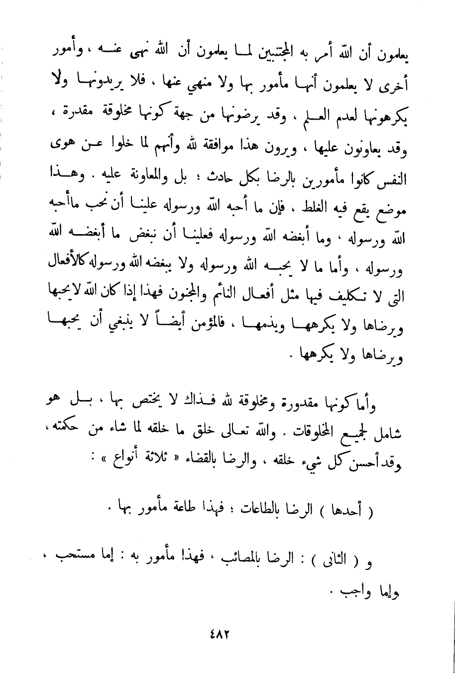 يَعْلَمُونَ أَنَّ اللَّهَ أَمَرَ بِهِ الْمُجْتَنِبِينَ لِمَا يَعْلَمُونَ أَنَّ اللَّهَ نَهَى عَنْهُ وَأُمُورٌ أُخْرَى لَا يَعْلَمُونَ أَنَّهَا مَأْمُورٌ بِهَا وَلَا مَنْهِيٌّ عَنْهَا فَلَا يُرِيدُونَهَا وَلَا يَكْرَهُونَهَا لِعَدَمِ الْعِلْمِ وَقَدْ يَرْضَوْنَهَا مِنْ جِهَةِ كَوْنِهَا مَخْلُوقَةً مُقَدَّرَةً وَقَدْ يُعَاوِنُونَ عَلَيْهَا وَيَرَوْنَ هَذَا مُوَافَقَةً لِلَّهِ وَأَنَّهُمْ لَمَّا خَلَوْا عَنْ هَوَى النَّفْسِ كَانُوا مَأْمُورِينَ بِالرِّضَا بِكُلِّ حَادِثٍ؛ بَلْ وَالْمُعَاوَنَةُ عَلَيْهِ. وَهَذَا مَوْضِعٌ يَقَعُ فِيهِ الْغَلَطُ فَإِنَّ مَا أَحَبَّهُ اللَّهُ وَرَسُولُهُ عَلَيْنَا أَنْ نُحِبَّ مَا أَحَبَّهُ اللَّهُ وَرَسُولُهُ وَمَا أَبْغَضَهُ اللَّهُ وَرَسُولُهُ فَعَلَيْنَا أَنْ نُبْغِضَ مَا أَبْغَضَهُ اللَّهُ وَرَسُولُهُ وَأَمَّا مَا لَا يُحِبُّهُ اللَّهُ وَرَسُولُهُ وَلَا يُبْغِضُهُ اللَّهُ وَرَسُولُهُ كَالْأَفْعَالِ الَّتِي لَا تَكْلِيفَ فِيهَا مِثْلُ أَفْعَالِ النَّائِمِ وَالْمَجْنُونِ فَهَذَا إذَا كَانَ اللَّهُ لَا يُحِبُّهَا وَيَرْضَاهَا وَلَا يَكْرَهُهَا وَيَذُمُّهَا فَالْمُؤْمِنُ أَيْضًا لَا يَنْبَغِي أَنْ يُحِبَّهَا وَيَرْضَاهَا وَلَا يَكْرَهَهَا. وَأَمَّا كَوْنُهَا مَقْدُورَةً وَمَخْلُوقَةً لِلَّهِ فَذَاكَ لَا يَخْتَصُّ بِهَا بَلْ هُوَ شَامِلٌ لِجَمِيعِ الْمَخْلُوقَاتِ وَاَللَّهُ تَعَالَى خَلَقَ مَا خَلَقَهُ لَمَّا شَاءَ مِنْ حِكْمَتِهِ وَقَدْ أَحْسَنَ كُلَّ شَيْءٍ خَلَقَهُ.