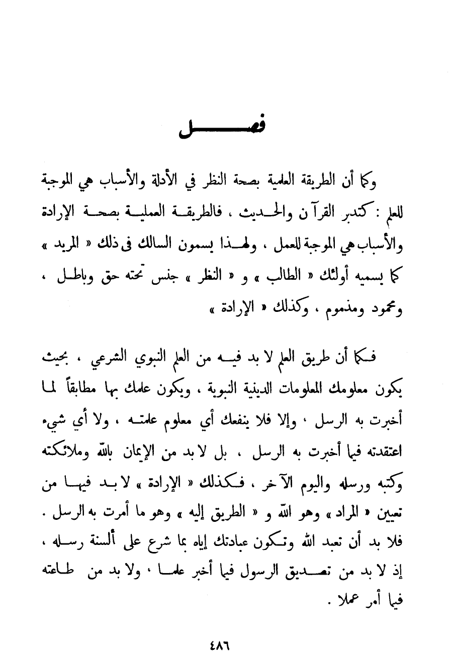 وَكَمَا أَنَّ الطَّرِيقَةَ الْعِلْمِيَّةَ بِصِحَّةِ النَّظَرِ فِي الْأَدِلَّةِ وَالْأَسْبَابِ هِيَ الْمُوجِبَةُ لِلْعِلْمِ: كَتَدَبُّرِ الْقُرْآنِ وَالْحَدِيثِ فَالطَّرِيقَةُ الْعَمَلِيَّةُ بِصِحَّةِ الْإِرَادَةِ وَالْأَسْبَابِ هِيَ الْمُوجِبَةُ لِلْعَمَلِ وَلِهَذَا يُسَمُّونَ السَّالِكَ فِي ذَلِكَ " الْمُرِيدَ " كَمَا يُسَمِّيهِ أُولَئِكَ " الطَّالِبَ " وَ " النَّظَرُ " جِنْسٌ تَحْتَهُ حُقٌّ وَبَاطِلٌ وَمَحْمُودٌ وَمَذْمُومٌ وَكَذَلِكَ " الْإِرَادَةُ " فَكَمَا أَنَّ طَرِيقَ الْعِلْمِ لَا بُدَّ فِيهِ مِنْ الْعِلْمِ النَّبَوِيِّ الشَّرْعِيِّ بِحَيْثُ يَكُونُ مَعْلُومُك الْمَعْلُومَاتِ الدِّينِيَّةَ النَّبَوِيَّةَ وَيَكُونُ عِلْمُك بِهَا مُطَابِقًا لِمَا أَخْبَرَتْ بِهِ الرُّسُلُ وَإِلَّا فَلَا يَنْفَعُك أَيُّ مَعْلُومٍ عَلِمْته وَلَا أَيُّ شَيْءٍ اعْتَقَدْته فِيمَا أَخْبَرَتْ بِهِ الرُّسُلُ بَلْ لَا بُدَّ مِنْ الْإِيمَانِ بِاَللَّهِ وَمَلَائِكَتِهِ وَكُتُبِهِ وَرُسُلِهِ وَالْيَوْمِ الْآخِرِ فَكَذَلِكَ " الْإِرَادَةُ " لَا بُدَّ فِيهَا مِنْ تَعْيِينِ " الْمُرَادِ " وَهُوَ اللَّهُ وَ " الطَّرِيقُ إلَيْهِ " وَهُوَ مَا أَمَرَتْ بِهِ الرُّسُلُ. فَلَا بُدَّ أَنْ تَعْبُدَ اللَّهَ، وَتَكُونَ عِبَادَتُك إيَّاهُ بِمَا شَرَعَ عَلَى أَلْسِنَةِ رُسُلِهِ إذْ لَا بُدَّ مِنْ تَصْدِيقِ الرَّسُولِ فِيمَا أَخْبَرَ عِلْمًا وَلَا بُدَّ مِنْ طَاعَتِهِ فِيمَا أَمَرَ عَمَلًا.