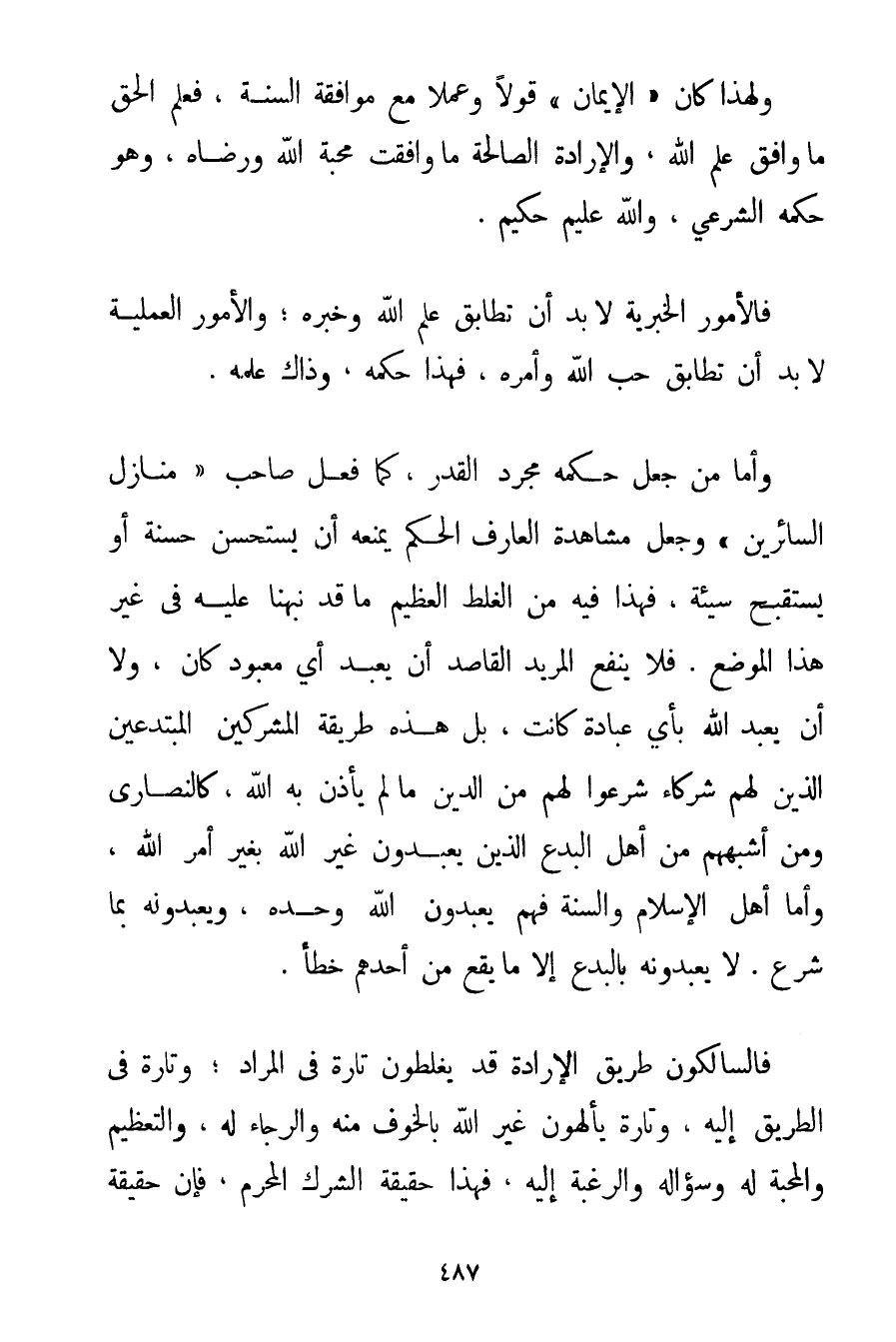 وَلِهَذَا كَانَ " الْإِيمَانُ " قَوْلًا وَعَمَلًا مَعَ مُوَافَقَةِ السُّنَّةِ فَعِلْمُ الْحَقِّ مَا وَافَقَ عِلْمَ اللَّهِ، وَالْإِرَادَةُ الصَّالِحَةُ مَا وَافَقَتْ مَحَبَّةَ اللَّهِ وَرِضَاهُ وَهُوَ حُكْمُهُ الشَّرْعِيُّ وَاَللَّهُ عَلِيمٌ حَكِيمٌ. فَالْأُمُورُ الْخَبَرِيَّةُ لَا بُدَّ أَنْ تُطَابِقَ عِلْمَ اللَّهِ وَخَبَرَهُ؛ وَالْأُمُورُ الْعَمَلِيَّةُ لَا بُدَّ أَنْ تُطَابِقَ حُبّ اللَّهِ وَأَمْرَهُ فَهَذَا حُكْمُهُ وَذَاكَ عِلْمُهُ. وَأَمَّا مَنْ جَعَلَ حُكْمَهُ مُجَرَّدَ الْقَدَرِ كَمَا فَعَلَ صَاحِبُ " مَنَازِلِ السَّائِرِينَ " وَجَعَلَ مُشَاهَدَةَ الْعَارِفِ الْحُكْمَ يَمْنَعُهُ أَنْ يَسْتَحْسِنَ حَسَنَةً أَوْ يَسْتَقْبِحَ سَيِّئَةً فَهَذَا فِيهِ مِنْ الْغَلَطِ الْعَظِيمِ مَا قَدْ نَبَّهْنَا عَلَيْهِ فِي غَيْرِ هَذَا الْمَوْضِعِ. فَلَا يَنْفَعُ الْمُرِيدُ الْقَاصِدُ أَنْ يَعْبُدَ أَيَّ مَعْبُودٍ كَانَ وَلَا أَنْ يَعْبُدَ اللَّهَ بِأَيِّ عِبَادَةٍ كانت بَلْ هَذِهِ طَرِيقَةُ الْمُشْرِكِينَ الْمُبْتَدِعِينَ الَّذِينَ لَهُمْ شُرَكَاءُ شَرَعُوا لَهُمْ مِنْ الدِّينِ مَا لَمْ يَأْذَنْ بِهِ اللَّهُ كَالنَّصَارَى وَمَنْ أَشْبَهَهُمْ مِنْ أَهْلِ الْبِدَعِ الَّذِينَ يَعْبُدُونَ غَيْرَ اللَّهِ بِغَيْرِ أَمْرِ اللَّهِ، وَأَمَّا أَهْلُ الْإِسْلَامِ وَالسُّنَّةِ فَهُمْ يَعْبُدُونَ اللَّهَ وَحْدَهُ وَيَعْبُدُونَهُ بِمَا شَرَعَ. لَا يَعْبُدُونَهُ بِالْبِدَعِ إلَّا مَا يَقَعُ مِنْ أَحَدِهِمْ خَطَأٌ. فَالسَّالِكُونَ طَرِيقَ الْإِرَادَةِ قَدْ يَغْلَطُونَ تَارَةً فِي الْمُرَادِ؛ وَتَارَةً فِي الطَّرِيقِ إلَيْهِ وَتَارَةً يألهون غَيْرَ اللَّهِ بِالْخَوْفِ مِنْهُ وَالرَّجَاءِ لَهُ وَالتَّعْظِيمِ وَالْمَحَبَّةِ لَهُ وَسُؤَالِهِ وَالرَّغْبَةِ إلَيْهِ فَهَذَا حَقِيقَةُ الشِّرْكِ الْمُحَرَّمِ فَإِنَّ حَقِيقَةَ
