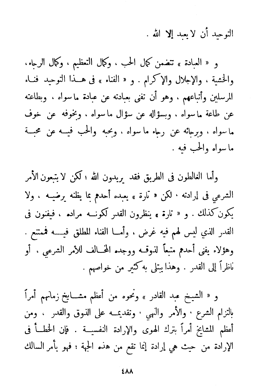 التَّوْحِيدِ أَنْ لَا يُعْبَدَ إلَّا اللَّهُ. وَ " الْعِبَادَةُ " تَتَضَمَّنُ كَمَالَ الْحُبِّ وَكَمَالَ التَّعْظِيمِ، وَكَمَالَ الرَّجَاءِ وَالْخَشْيَةِ وَالْإِجْلَالِ وَالْإِكْرَامِ. وَ " الْفَنَاءُ " فِي هَذَا التَّوْحِيدِ فَنَاءُ الْمُرْسَلِينَ وَأَتْبَاعِهِمْ وَهُوَ أَنْ تَفْنَى بِعِبَادَتِهِ عَنْ عِبَادَةِ مَا سِوَاهُ وَبِطَاعَتِهِ عَنْ طَاعَةِ مَا سِوَاهُ وَبِسُؤَالِهِ عَنْ سُؤَالِ مَا سِوَاهُ وَبِخَوْفِهِ عَنْ خَوْفِ مَا سِوَاهُ وَبِرَجَائِهِ عَنْ رَجَاءِ مَا سِوَاهُ وَبِحُبِّهِ، وَالْحُبِّ فِيهِ عَنْ مَحَبَّةِ مَا سِوَاهُ وَالْحُبِّ فِيهِ. وَأَمَّا الغالطون فِي الطَّرِيقِ فَقَدْ يُرِيدُونَ اللَّهَ؛ لَكِنْ لَا يَتَّبِعُونَ الْأَمْرَ الشَّرْعِيَّ فِي إرَادَتِهِ. لَكِنْ " تَارَةً " يَعْبُدُهُ أَحَدُهُمْ بِمَا يَظُنُّهُ يُرْضِيهِ وَلَا يَكُونُ كَذَلِكَ. وَ " تَارَةً " يَنْظُرُونَ الْقَدَرَ لِكَوْنِهِ مُرَادِهِ فَيَفْنَوْنَ فِي الْقَدَرِ الَّذِي لَيْسَ لَهُمْ فِيهِ غَرَضٌ وَأَمَّا الْفَنَاءُ الْمُطْلَقُ فِيهِ فَمُمْتَنِعٌ. وَهَؤُلَاءِ يَفْنَى أَحَدُهُمْ مُتَّبِعًا لِذَوْقِهِ وَوَجْدِهِ الْمُخَالِفِ لِلْأَمْرِ الشَّرْعِيِّ أَوْ نَاظِرًا إلَى الْقَدَرِ. وَهَذَا يُبْتَلَى بِهِ كَثِيرٌ مِنْ خَوَّاصِهِمْ. وَ " الشَّيْخُ عَبْدُ الْقَادِرِ " وَنَحْوُهُ مِنْ أَعْظَمِ مَشَايِخِ زَمَانِهِمْ أَمْرًا بِالْتِزَامِ الشَّرْعِ وَالْأَمْرِ وَالنَّهْيِ وَتَقْدِيمِهِ عَلَى الذَّوْقِ وَالْقَدَرِ، وَمِنْ أَعْظَمِ الْمَشَايِخِ أَمْرًا بِتَرْكِ الْهَوَى وَالْإِرَادَةِ النَّفْسِيَّةِ. فَإِنَّ الْخَطَأَ فِي الْإِرَادَةِ مِنْ حَيْثُ هِيَ إرَادَةٌ إنَّمَا تَقَعُ مِنْ هَذِهِ الْجِهَةِ؛ فَهُوَ يَأْمُرُ السَّالِكَ