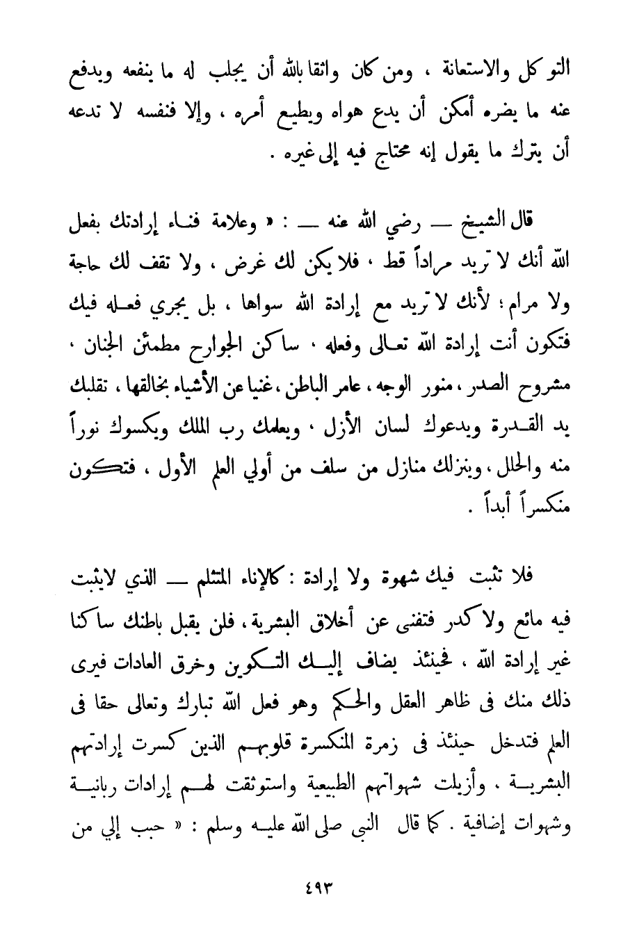 التَّوَكُّلِ وَالِاسْتِعَانَةِ وَمَنْ كَانَ وَاثِقًا بِاَللَّهِ أَنْ يَجْلِبَ لَهُ مَا يَنْفَعُهُ وَيَدْفَعُ عَنْهُ مَا يَضُرُّهُ أَمْكَنَ أَنْ يَدَعَ هَوَاهُ وَيُطِيعَ أَمْرَهُ وَإِلَّا فَنَفْسُهُ لَا تَدَعُهُ أَنْ يَتْرُكَ مَا يَقُولُ إنَّهُ مُحْتَاجٌ فِيهِ إلَى غَيْرِهِ. قَالَ الشَّيْخُ - رَضِيَ اللَّهُ عَنْهُ -: " وَعَلَامَةُ فَنَاءِ إرَادَتِك بِفِعْلِ اللَّهِ أَنَّك لَا تُرِيدُ مُرَادًا قَطُّ فَلَا يَكُنْ لَك غَرَضٌ وَلَا تَقِفُ لَك حَاجَةٌ وَلَا مَرَامٌ؛ لِأَنَّك لَا تُرِيدُ مَعَ إرَادَةِ اللَّهِ سِوَاهَا بَلْ يَجْرِي فِعْلُهُ فِيك فَتَكُونُ أَنْتَ إرَادَةَ اللَّهِ تَعَالَى وَفِعْلَهُ، سَاكِنَ الْجَوَارِحِ، مُطَمْئِنَ الْجَنَانِ، مَشْرُوحَ الصَّدْرِ، مُنَوَّرَ الْوَجْهِ، عَامِرَ الْبَاطِنِ، غَنِيًّا عَنْ الْأَشْيَاءِ بِخَالِقِهَا تقلبك يَدُ الْقُدْرَةِ، وَيَدْعُوك لِسَانُ الْأَزَلِ، وَيُعَلِّمُك رَبُّ الْمُلْكِ وَيَكْسُوَك نُورًا مِنْهُ وَالْحُلَلَ، وَيُنْزِلُك مَنَازِلَ مَنْ سَلَفَ مِنْ أُولِي الْعِلْمِ الْأَوَّلِ فَتَكُونُ مُنْكَسِرًا أَبَدًا. فَلَا تَثْبُتُ فِيك شَهْوَةٌ وَلَا إرَادَةٌ: كَالْإِنَاءِ الْمُتَثَلِّمِ - الَّذِي لَا يَثْبُتُ فِيهِ مَائِعٌ وَلَا كَدِرٌ فَتَفْنَى عَنْ أَخْلَاقِ الْبَشَرِيَّةِ فَلَنْ يَقْبَلَ بَاطِنُك سَاكِنًا غَيْرَ إرَادَةِ اللَّهِ فَحِينَئِذٍ يُضَافُ إلَيْك التَّكْوِينُ، وَخَرْقُ الْعَادَاتِ فَيُرَى ذَلِكَ مِنْك فِي ظَاهِرِ الْعَقْلِ وَالْحُكْمِ وَهُوَ فِعْلُ اللَّهِ تَبَارَكَ وَتَعَالَى حَقًّا فِي الْعِلْمِ فَتَدْخُلُ حِينَئِذٍ فِي زُمْرَةِ الْمُنْكَسِرَةِ قُلُوبُهُمْ الَّذِينَ كُسِرَتْ إرَادَتُهُمْ الْبَشَرِيَّةُ وَأُزِيلَتْ شَهَوَاتُهُمْ الطَّبِيعِيَّةُ وَاسْتَوْثَقَتْ لَهُمْ إرَادَاتٌ رَبَّانِيَّةٌ وَشَهَوَاتٌ إضَافِيَّةٌ. كَمَا قَالَ النَّبِيُّ صَلَّى اللَّهُ عَلَيْهِ وَسَلَّمَ " {حُبِّبَ إلَيَّ مِنْ