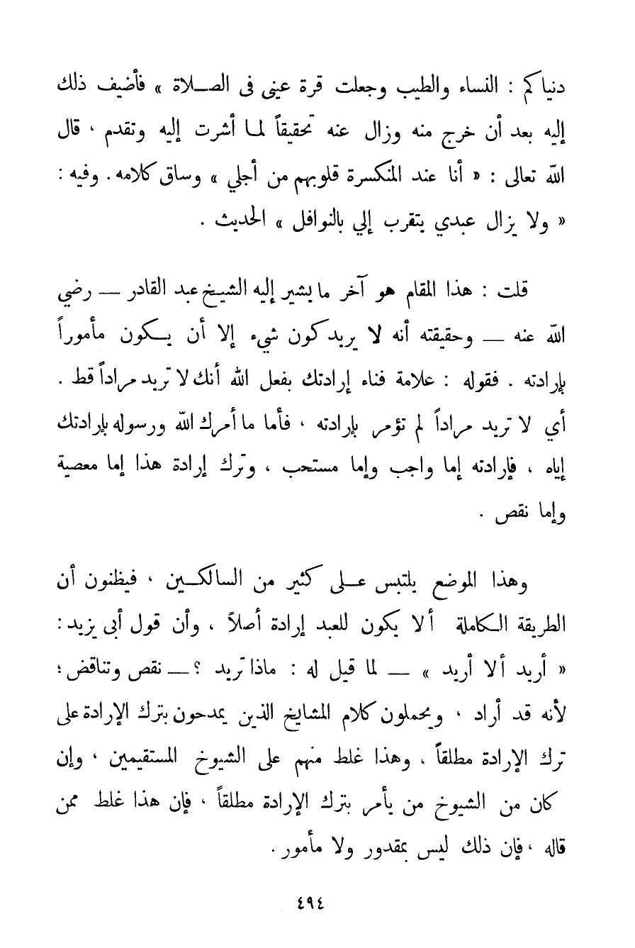دُنْيَاكُمْ: النِّسَاءُ وَالطِّيبُ وَجُعِلَتْ قُرَّةُ عَيْنِي فِي الصَّلَاةِ} " فَأُضِيفَ ذَلِكَ إلَيْهِ بَعْدَ أَنْ خَرَجَ مِنْهُ وَزَالَ عَنْهُ تَحْقِيقًا لِمَا أَشَرْت إلَيْهِ وَتَقَدَّمَ، قَالَ اللَّهُ تَعَالَى: " {أَنَا عِنْدَ الْمُنْكَسِرَةِ قُلُوبُهُمْ مِنْ أَجْلِي} " وَسَاقَ كَلَامَهُ. وَفِيهِ: " {وَلَا يَزَالُ عَبْدِي يَتَقَرَّبُ إلَيَّ بِالنَّوَافِلِ} " الْحَدِيثَ. قُلْت: هَذَا الْمَقَامُ هُوَ آخِرُ مَا يُشِيرُ إلَيْهِ الشَّيْخُ عَبْدُ الْقَادِرِ - رَضِيَ اللَّهُ عَنْهُ - وَحَقِيقَتُهُ أَنَّهُ لَا يُرِيدُ كَوْنَ شَيْءٍ إلَّا أَنْ يَكُونَ مَأْمُورًا بِإِرَادَتِهِ فَقَوْلُهُ: عَلَامَةُ فَنَاءِ إرَادَتِك بِفِعْلِ اللَّهِ أَنَّك لَا تُرِيدُ مُرَادًا قَطُّ. أَيْ لَا تُرِيدُ مُرَادًا لَمْ تُؤْمَرْ بِإِرَادَتِهِ فَأَمَّا مَا أَمَرَك اللَّهُ وَرَسُولُهُ بِإِرَادَتِك إيَّاهُ فَإِرَادَتُهُ إمَّا وَاجِبٌ وَإِمَّا مُسْتَحَبٌّ وَتَرْكُ إرَادَةِ هَذَا إمَّا مَعْصِيَةٌ وَإِمَّا نَقْصٌ. وَهَذَا الْمَوْضِعُ يَلْتَبِسُ عَلَى كَثِيرٍ مِنْ السَّالِكِينَ فَيَظُنُّونَ أَنَّ الطَّرِيقَةَ الْكَامِلَةَ أَلَّا يَكُونَ لِلْعَبْدِ إرَادَةٌ أَصْلًا وَأَنَّ قَوْلَ أَبِي يَزِيدَ: " أُرِيدُ أَلَّا أُرِيدَ " - لَمَّا قِيلَ لَهُ: مَاذَا تُرِيدُ؟ - نَقْصٌ وَتَنَاقُضٌ؛ لِأَنَّهُ قَدْ أَرَادَ، وَيَحْمِلُونَ كَلَامَ الْمَشَايِخِ الَّذِينَ يُمْدَحُونَ بِتَرْكِ الْإِرَادَةِ عَلَى تَرْكِ الْإِرَادَةِ مُطْلَقًا وَهَذَا غَلَطٌ مِنْهُمْ عَلَى الشُّيُوخِ الْمُسْتَقِيمِينَ وَإِنْ كَانَ مِنْ الشُّيُوخِ مَنْ يَأْمُرُ بِتَرْكِ الْإِرَادَةِ مُطْلَقًا فَإِنَّ هَذَا غَلَطٌ مِمَّنْ قَالَهُ فَإِنَّ ذَلِكَ لَيْسَ بِمَقْدُورِ وَلَا مَأْمُورٍ