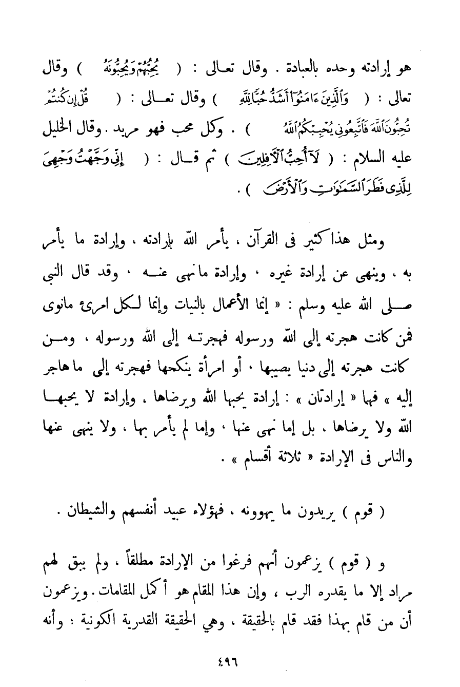 هُوَ إرَادَتُهُ وَحْدَهُ بِالْعِبَادَةِ. وَقَالَ تَعَالَى: {يُحِبُّهُمْ وَيُحِبُّونَهُ} وَقَالَ تَعَالَى: {وَالَّذِينَ آمَنُوا أَشَدُّ حُبًّا لِلَّهِ} وَقَالَ تَعَالَى: {قُلْ إنْ كُنْتُمْ تُحِبُّونَ اللَّهَ فَاتَّبِعُونِي يُحْبِبْكُمُ اللَّهُ} . وَكُلُّ مُحِبٍّ فَهُوَ مُرِيدٌ. وَقَالَ الْخَلِيلُ عَلَيْهِ السَّلَامُ {لَا أُحِبُّ الْآفِلِينَ} ثُمَّ قَالَ: {إنِّي وَجَّهْتُ وَجْهِيَ لِلَّذِي فَطَرَ السَّمَاوَاتِ وَالْأَرْضَ} . وَمِثْلُ هَذَا كَثِيرٌ فِي الْقُرْآنِ؛ يَأْمُرُ اللَّهُ بِإِرَادَتِهِ وَإِرَادَةِ مَا يَأْمُرُ بِهِ وَيَنْهَى عَنْ إرَادَةِ غَيْرِهِ وَإِرَادَةِ مَا نَهَى عَنْهُ وَقَدْ قَالَ النَّبِيُّ صَلَّى اللَّهُ عَلَيْهِ وَسَلَّمَ " {إنَّمَا الْأَعْمَالُ بِالنِّيَّاتِ وَإِنَّمَا لِكُلِّ امْرِئٍ مَا نَوَى فَمَنْ كَانَتْ هِجْرَتُهُ إلَى اللَّهِ وَرَسُولِهِ فَهِجْرَتُهُ إلَى اللَّهِ وَرَسُولِهِ وَمَنْ كَانَتْ هِجْرَتُهُ إلَى دُنْيَا يُصِيبُهَا أَوْ امْرَأَةٍ يَنْكِحُهَا فَهِجْرَتُهُ إلَى مَا هَاجَرَ إلَيْهِ} " فَهُمَا " إرَادَتَانِ ": إرَادَةٌ يُحِبُّهَا اللَّهُ وَيَرْضَاهَا وَإِرَادَةٌ لَا يُحِبُّهَا اللَّهُ وَلَا يَرْضَاهَا بَلْ إمَّا نَهَى عَنْهَا وَإِمَّا لَمْ يَأْمُرْ بِهَا وَلَا يَنْهَى عَنْهَا وَالنَّاسُ فِي الْإِرَادَةِ " ثَلَاثَةُ أَقْسَامٍ ". قَوْمٌ يُرِيدُونَ مَا يَهْوُونَهُ فَهَؤُلَاءِ عَبِيدُ أَنْفُسِهِمْ وَالشَّيْطَانِ. وَقَوْمٌ يَزْعُمُونَ أَنَّهُمْ فَرَغُوا مِنْ الْإِرَادَةِ مُطْلَقًا وَلَمْ يَبْقَ لَهُمْ مُرَادٌ إلَّا مَا يُقَدِّرُهُ الرَّبُّ وَإِنَّ هَذَا الْمَقَامَ هُوَ أَكْمَلُ الْمَقَامَاتِ. وَيَزْعُمُونَ أَنَّ مَنْ قَامَ بِهَذَا فَقَدْ قَامَ بِالْحَقِيقَةِ وَهِيَ الْحَقِيقَةُ الْقَدَرِيَّةُ الْكَوْنِيَّةُ؛ وَأَنَّهُ