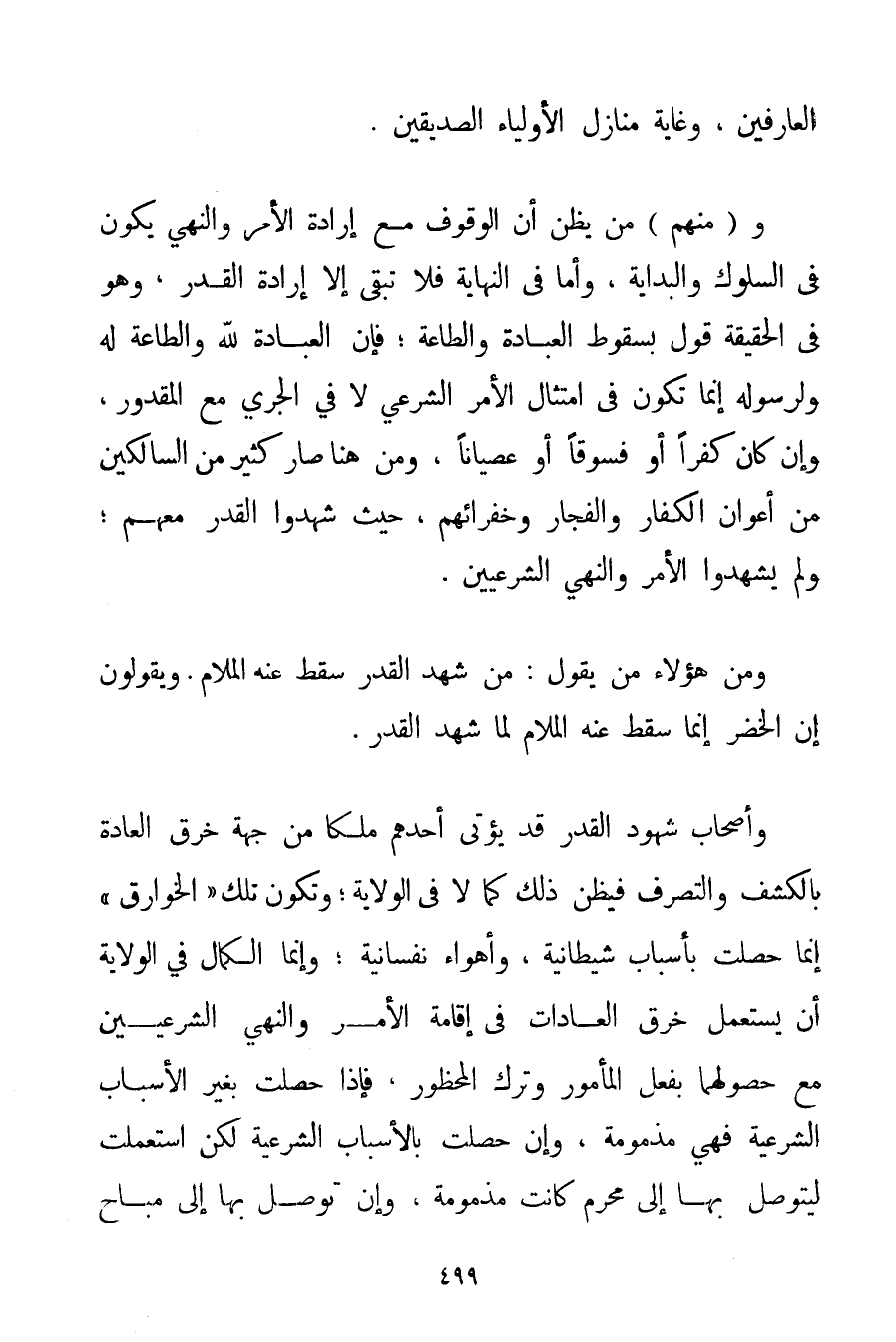 الْعَارِفِينَ وَغَايَةُ مَنَازِلِ الْأَوْلِيَاءِ الصِّدِّيقِينَ) . وَ (مِنْهُمْ مَنْ يَظُنُّ أَنَّ الْوُقُوفَ مَعَ إرَادَةِ الْأَمْرِ وَالنَّهْيِ يَكُونُ فِي السُّلُوكِ وَالْبِدَايَةِ وَأَمَّا فِي النِّهَايَةِ فَلَا تَبْقَى إلَّا إرَادَةُ الْقَدَرِ وَهُوَ فِي الْحَقِيقَةِ قَوْلٌ بِسُقُوطِ الْعِبَادَةِ وَالطَّاعَةِ؛ فَإِنَّ الْعِبَادَةَ لِلَّهِ وَالطَّاعَةَ لَهُ وَلِرَسُولِهِ إنَّمَا تَكُونُ فِي امْتِثَالِ الْأَمْرِ الشَّرْعِيِّ لَا فِي الْجَرْيِ مَعَ الْمَقْدُورِ وَإِنْ كَانَ كُفْرًا أَوْ فَسُوقًا أَوْ عِصْيَانًا وَمِنْ هُنَا صَارَ كَثِيرٌ مِنْ السَّالِكِينَ مِنْ أَعْوَانِ الْكُفَّارِ وَالْفُجَّارِ وَخُفَرَائِهِمْ حَيْثُ شَهِدُوا الْقَدَرَ مَعَهُمْ؛ وَلَمْ يَشْهَدُوا الْأَمْرَ وَالنَّهْيَ الشَّرْعِيَّيْنِ. وَمِنْ هَؤُلَاءِ مَنْ يَقُولُ: مَنْ شَهِدَ الْقَدَرَ سَقَطَ عَنْهُ الْمُلَامُ. وَيَقُولُونَ إنَّ الْخَضِرَ إنَّمَا سَقَطَ عَنْهُ الْمُلَامُ لَمَّا شَهِدَ الْقَدَرَ. وَأَصْحَابُ شُهُودِ الْقَدَرِ قَدْ يُؤْتَى أَحَدُهُمْ مُلْكًا مِنْ جِهَةِ خَرْقِ الْعَادَةِ بِالْكَشْفِ وَالتَّصَرُّفِ فَيَظُنُّ ذَلِكَ كَمَالًا فِي الْوِلَايَةِ؛ وَتَكُونُ تِلْكَ " الْخَوَارِقُ " إنَّمَا حَصَلَتْ بِأَسْبَابِ شَيْطَانِيَّةٍ وَأَهْوَاءٍ نَفْسَانِيَّةٍ؛ وَإِنَّمَا الْكَمَالُ فِي الْوِلَايَةِ أَنْ يُسْتَعْمَلَ خَرْقُ الْعَادَاتِ فِي إقَامَةِ الْأَمْرِ وَالنَّهْيِ الشَّرْعِيَّيْنِ مَعَ حُصُولِهِمَا بِفِعْلِ الْمَأْمُورِ وَتَرْكِ الْمَحْظُورِ فَإِذَا حَصَلَتْ بِغَيْرِ الْأَسْبَابِ الشَّرْعِيَّةِ فَهِيَ مَذْمُومَةٌ وَإِنْ حَصَلَتْ بِالْأَسْبَابِ الشَّرْعِيَّةِ لَكِنْ اُسْتُعْمِلَتْ لِيُتَوَصَّلَ بِهَا إلَى مُحَرَّمٍ كانت مَذْمُومَةً وَإِنْ تَوَصَّلَ بِهَا إلَى مُبَاحٍ