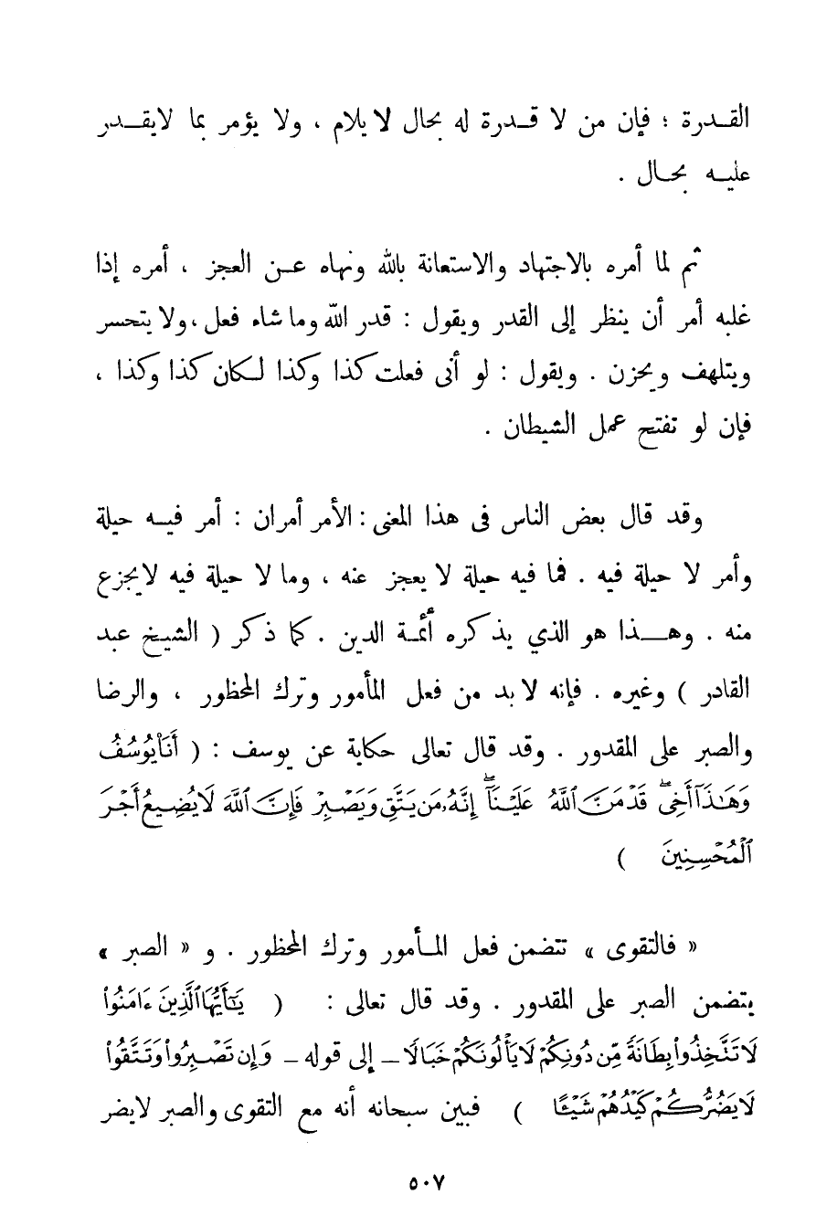 الْقُدْرَةَ؛ فَإِنَّ مَنْ لَا قُدْرَةَ لَهُ بِحَالِ لَا يُلَامُ وَلَا يُؤْمَرُ بِمَا لَا يَقْدِرُ عَلَيْهِ بِحَالِ. ثُمَّ لَمَّا أَمَرَهُ بِالِاجْتِهَادِ وَالِاسْتِعَانَةِ بِاَللَّهِ وَنَهَاهُ عَنْ الْعَجْزِ أَمَرَهُ إذَا غَلَبَهُ أَمْرٌ أَنْ يَنْظُرَ إلَى الْقَدَرِ، وَيَقُولَ: قَدَّرَ اللَّهُ وَمَا شَاءَ فَعَلَ وَلَا يَتَحَسَّرُ وَيَتَلَهَّفُ وَيَحْزَنُ. وَيَقُولُ: لَوْ أَنِّي فَعَلْت كَذَا وَكَذَا لَكَانَ كَذَا وَكَذَا فَإِنَّ لَوْ تَفْتَحُ عَمَلَ الشَّيْطَانِ. وَقَدْ قَالَ بَعْضُ النَّاسِ فِي هَذَا الْمَعْنَى: الْأَمْرُ أَمْرَانِ: أَمْرٌ فِيهِ حِيلَةٌ وَأَمْرٌ لَا حِيلَةَ فِيهِ. فَمَا فِيهِ حِيلَةٌ لَا يَعْجِزُ عَنْهُ وَمَا لَا حِيلَةَ فِيهِ لَا يَجْزَعُ مِنْهُ. وَهَذَا هُوَ الَّذِي يَذْكُرُهُ أَئِمَّةُ الدِّينِ. كَمَا ذَكَرَ (الشَّيْخُ عَبْدُ الْقَادِرِ وَغَيْرُهُ. فَإِنَّهُ لَا بُدَّ مِنْ فِعْلِ الْمَأْمُورِ وَتَرْكِ الْمَحْظُورِ وَالرِّضَا وَالصَّبْرِ عَلَى الْمَقْدُورِ. وَقَدْ قَالَ تَعَالَى حِكَايَةً عَنْ يُوسُفَ: {أَنَا يُوسُفُ وَهَذَا أَخِي قَدْ مَنَّ اللَّهُ عَلَيْنَا إنَّهُ مَنْ يَتَّقِ وَيَصْبِرْ فَإِنَّ اللَّهَ لَا يُضِيعُ أَجْرَ الْمُحْسِنِينَ} " فَالتَّقْوَى " تَتَضَمَّنُ فِعْلَ الْمَأْمُورِ وَتَرْكَ الْمَحْظُورِ. وَ " الصَّبْرُ " يَتَضَمَّنُ الصَّبْرَ عَلَى الْمَقْدُورِ. وَقَدْ قَالَ تَعَالَى: {يَا أَيُّهَا الَّذِينَ آمَنُوا لَا تَتَّخِذُوا بِطَانَةً مِنْ دُونِكُمْ لَا يَأْلُونَكُمْ خَبَالًا} - إلَى قَوْلِهِ - {وَإِنْ تَصْبِرُوا وَتَتَّقُوا لَا يَضُرُّكُمْ كَيْدُهُمْ شَيْئًا} فَبَيَّنَ سُبْحَانَهُ أَنَّهُ مَعَ التَّقْوَى وَالصَّبْرِ لَا يَضُرُّ