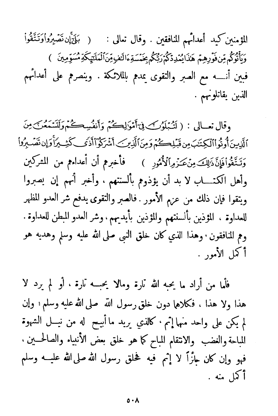 الْمُؤْمِنِينَ كَيْدُ أَعْدَائِهِمْ الْمُنَافِقِينَ. وَقَالَ تَعَالَى: {بَلَى إنْ تَصْبِرُوا وَتَتَّقُوا وَيَأْتُوكُمْ مِنْ فَوْرِهِمْ هَذَا يُمْدِدْكُمْ رَبُّكُمْ بِخَمْسَةِ آلَافٍ مِنَ الْمَلَائِكَةِ مُسَوِّمِينَ} فَبَيَّنَ أَنَّهُ مَعَ الصَّبْرِ وَالتَّقْوَى يَمُدُّهُمْ بِالْمَلَائِكَةِ. وَيَنْصُرُهُمْ عَلَى أَعْدَائِهِمْ الَّذِينَ يُقَاتِلُونَهُمْ. وَقَالَ تَعَالَى: {لَتُبْلَوُنَّ فِي أَمْوَالِكُمْ وَأَنْفُسِكُمْ وَلَتَسْمَعُنَّ مِنَ الَّذِينَ أُوتُوا الْكِتَابَ مِنْ قَبْلِكُمْ وَمِنَ الَّذِينَ أَشْرَكُوا أَذًى كَثِيرًا وَإِنْ تَصْبِرُوا وَتَتَّقُوا فَإِنَّ ذَلِكَ مِنْ عَزْمِ الْأُمُورِ} فَأَخْبَرَهُمْ أَنَّ أَعْدَاءَهُمْ مِنْ الْمُشْرِكِينَ، وَأَهْلِ الْكِتَابِ لَا بُدَّ أَنْ يُؤْذُوهُمْ بِأَلْسِنَتِهِمْ وَأَخْبَرَ أَنَّهُمْ إنْ يَصْبِرُوا وَيَتَّقُوا فَإِنَّ ذَلِكَ مِنْ عَزْمِ الْأُمُورِ. فَالصَّبْرُ وَالتَّقْوَى يَدْفَعُ شَرَّ الْعَدُوِّ الْمُظْهِرِ لِلْعَدَاوَةِ الْمُؤْذِينَ بِأَلْسِنَتِهِمْ وَالْمُؤْذِينَ بِأَيْدِيهِمْ وَشَرُّ الْعَدُوِّ الْمُبْطِنُ لِلْعَدَاوَةِ. وَهُمْ الْمُنَافِقُونَ وَهَذَا الَّذِي كَانَ خُلُقُ النَّبِيِّ صَلَّى اللَّهُ عَلَيْهِ وَسَلَّمَ وَهَدْيُهُ هُوَ أَكْمَلُ الْأُمُورِ.
