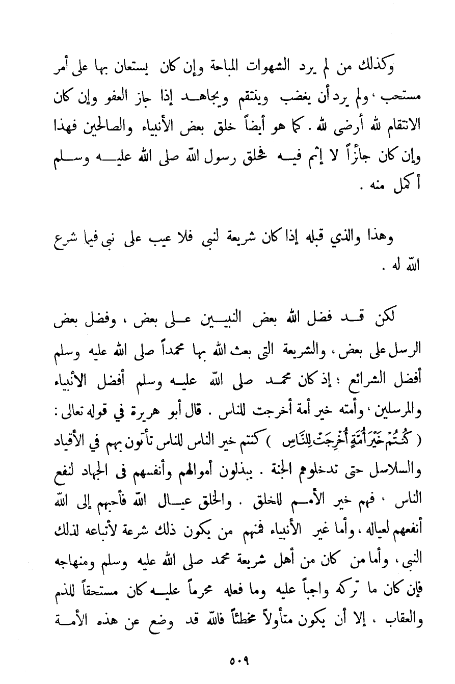 وَكَذَلِكَ مَنْ لَمْ يُرِدْ الشَّهَوَاتِ الْمُبَاحَةَ وَإِنْ كَانَ يُسْتَعَانُ بِهَا عَلَى أَمْرٍ مُسْتَحَبٍّ وَلَمْ يُرِدْ أَنْ يَغْضَبَ وَيَنْتَقِمَ وَيُجَاهِدَ إذَا جَازَ الْعَفْوُ وَإِنْ كَانَ الِانْتِقَامُ لِلَّهِ أَرْضَى لِلَّهِ. كَمَا هُوَ أَيْضًا خُلُقُ بَعْضِ الْأَنْبِيَاءِ وَالصَّالِحِينَ فَهَذَا وَإِنْ كَانَ جَائِزًا لَا إثْمَ فِيهِ فَخُلُقُ رَسُولِ اللَّهِ صَلَّى اللَّهُ عَلَيْهِ وَسَلَّمَ أَكْمَلُ مِنْهُ. وَهَذَا وَاَلَّذِي قَبْلَهُ إذَا كَانَ شَرِيعَةً لِنَبِيِّ فَلَا عَيْبَ عَلَى نَبِيٍّ فِيمَا شَرَعَ اللَّهُ لَهُ. لَكِنْ قَدْ فَضَّلَ اللَّهُ بَعْضَ النَّبِيِّينَ عَلَى بَعْضٍ، وَفَضَّلَ بَعْضَ الرُّسُلِ عَلَى بَعْضٍ، وَالشَّرِيعَةُ الَّتِي بَعَثَ اللَّهُ بِهَا مُحَمَّدًا صَلَّى اللَّهُ عَلَيْهِ وَسَلَّمَ أَفْضَلُ الشَّرَائِعِ؛ إذْ كَانَ مُحَمَّدٌ صَلَّى اللَّهُ عَلَيْهِ وَسَلَّمَ أَفْضَلَ الْأَنْبِيَاءِ وَالْمُرْسَلِينَ وَأُمَّتُهُ خَيْرُ أُمَّةٍ أُخْرِجَتْ لِلنَّاسِ. قَالَ أَبُو هُرَيْرَةَ فِي قَوْله تَعَالَى {كُنْتُمْ خَيْرَ أُمَّةٍ أُخْرِجَتْ لِلنَّاسِ} كُنْتُمْ خَيْرَ النَّاسِ لِلنَّاسِ تَأْتُونَ بِهِمْ فِي الْأَقْيَادِ وَالسَّلَاسِلِ حَتَّى تُدْخِلُوهُمْ الْجَنَّةَ. يَبْذُلُونَ أَمْوَالَهُمْ وَأَنْفُسَهُمْ فِي الْجِهَادِ لِنَفْعِ النَّاسِ فَهُمْ خَيْرُ الْأُمَمِ لِلْخَلْقِ. وَالْخَلْقُ عِيَالُ اللَّهِ فَأَحَبُّهُمْ إلَى اللَّهِ أَنْفَعُهُمْ لِعِيَالِهِ، وَأَمَّا غَيْرُ الْأَنْبِيَاءِ فَمِنْهُمْ مَنْ يَكُونُ ذَلِكَ شِرْعَةً لِاتِّبَاعِهِ لِذَلِكَ النَّبِيِّ وَأَمَّا مَنْ كَانَ مِنْ أَهْلِ شَرِيعَةِ مُحَمَّدٍ صَلَّى اللَّهُ عَلَيْهِ وَسَلَّمَ وَمِنْهَاجِهِ فَإِنْ كَانَ مَا تَرَكَهُ وَاجِبًا عَلَيْهِ وَمَا فَعَلَهُ مُحَرَّمًا عَلَيْهِ كَانَ مُسْتَحِقًّا لِلذَّمِّ وَالْعِقَابِ إلَّا أَنْ يَكُونَ مُتَأَوِّلًا مُخْطِئًا فَاَللَّهُ قَدْ وَضَعَ عَنْ هَذِهِ الْأُمَّةِ