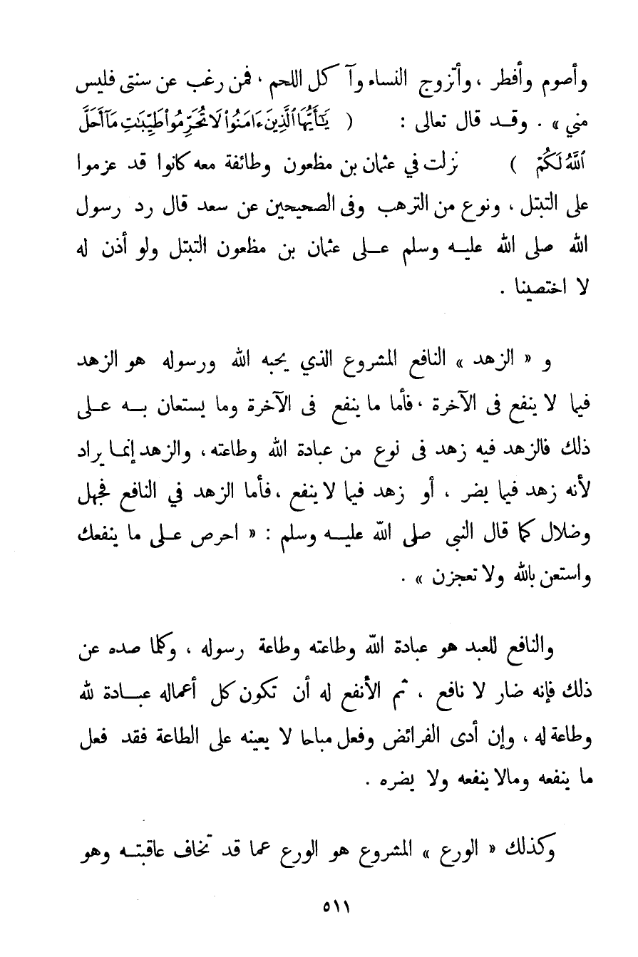 وَأَصُومُ وأفطر وَأَتَزَوَّجُ النِّسَاءَ وَآكُلُ اللَّحْمَ فَمَنْ رَغِبَ عَنْ سُنَّتِي فَلَيْسَ مِنِّي} ". وَقَدْ قَالَ تَعَالَى: {يَا أَيُّهَا الَّذِينَ آمَنُوا لَا تُحَرِّمُوا طَيِّبَاتِ مَا أَحَلَّ اللَّهُ لَكُمْ} نَزَلَتْ فِي عُثْمَانَ بْنِ مَظْعُونٍ وَطَائِفَةٍ مَعَهُ كَانُوا قَدْ عَزَمُوا عَلَى التَّبَتُّلِ وَنَوْعٍ مِنْ التَّرَهُّبِ، وَفِي الصَّحِيحَيْنِ {عَنْ سَعْدٍ قَالَ رَدَّ رَسُولُ اللَّهِ صَلَّى اللَّهُ عَلَيْهِ وَسَلَّمَ عَلَى عُثْمَانَ بْنِ مَظْعُونٍ التَّبَتُّلَ وَلَوْ أَذِنَ لَهُ لَاخْتَصَيْنَا} . وَ " الزُّهْدُ " النَّافِعُ الْمَشْرُوعُ الَّذِي يُحِبُّهُ اللَّهُ وَرَسُولُهُ هُوَ الزُّهْدُ فِيمَا لَا يَنْفَعُ فِي الْآخِرَةِ فَأَمَّا مَا يَنْفَعُ فِي الْآخِرَةِ وَمَا يُسْتَعَانُ بِهِ عَلَى ذَلِكَ فَالزُّهْدُ فِيهِ زُهْدٌ فِي نَوْعٍ مِنْ عِبَادَةِ اللَّهِ وَطَاعَتِهِ وَالزُّهْدُ إنَّمَا يُرَادُ لِأَنَّهُ زُهْدٌ فِيمَا يَضُرُّ أَوْ زُهْدٌ فِيمَا لَا يَنْفَعُ فَأَمَّا الزُّهْدُ فِي النَّافِعِ فَجَهْلٌ وَضَلَالٌ كَمَا قَالَ النَّبِيُّ صَلَّى اللَّهُ عَلَيْهِ وَسَلَّمَ " {احْرِصْ عَلَى مَا يَنْفَعُك وَاسْتَعِنْ بِاَللَّهِ وَلَا تَعْجِزَنَّ} ". وَالنَّافِعُ لِلْعَبْدِ هُوَ عِبَادَةُ اللَّهِ وَطَاعَتُهُ وَطَاعَةُ رَسُولِهِ وَكُلَّمَا صَدَّهُ عَنْ ذَلِكَ فَإِنَّهُ ضَارٌّ لَا نَافِعَ ثُمَّ الْأَنْفَعُ لَهُ أَنْ تَكُونَ كُلُّ أَعْمَالِهِ عِبَادَةً لِلَّهِ وَطَاعَةً لَهُ وَإِنْ أَدَّى الْفَرَائِضَ وَفَعَلَ مُبَاحًا لَا يُعِينُهُ عَلَى الطَّاعَةِ فَقَدْ فَعَلَ مَا يَنْفَعُهُ وَمَا لَا يَنْفَعُهُ وَلَا يَضُرُّهُ. وَكَذَلِكَ " الْوَرَعُ " الْمَشْرُوعُ هُوَ الْوَرَعُ عَمَّا قَدْ تُخَافُ عَاقِبَتُهُ وَهُوَ