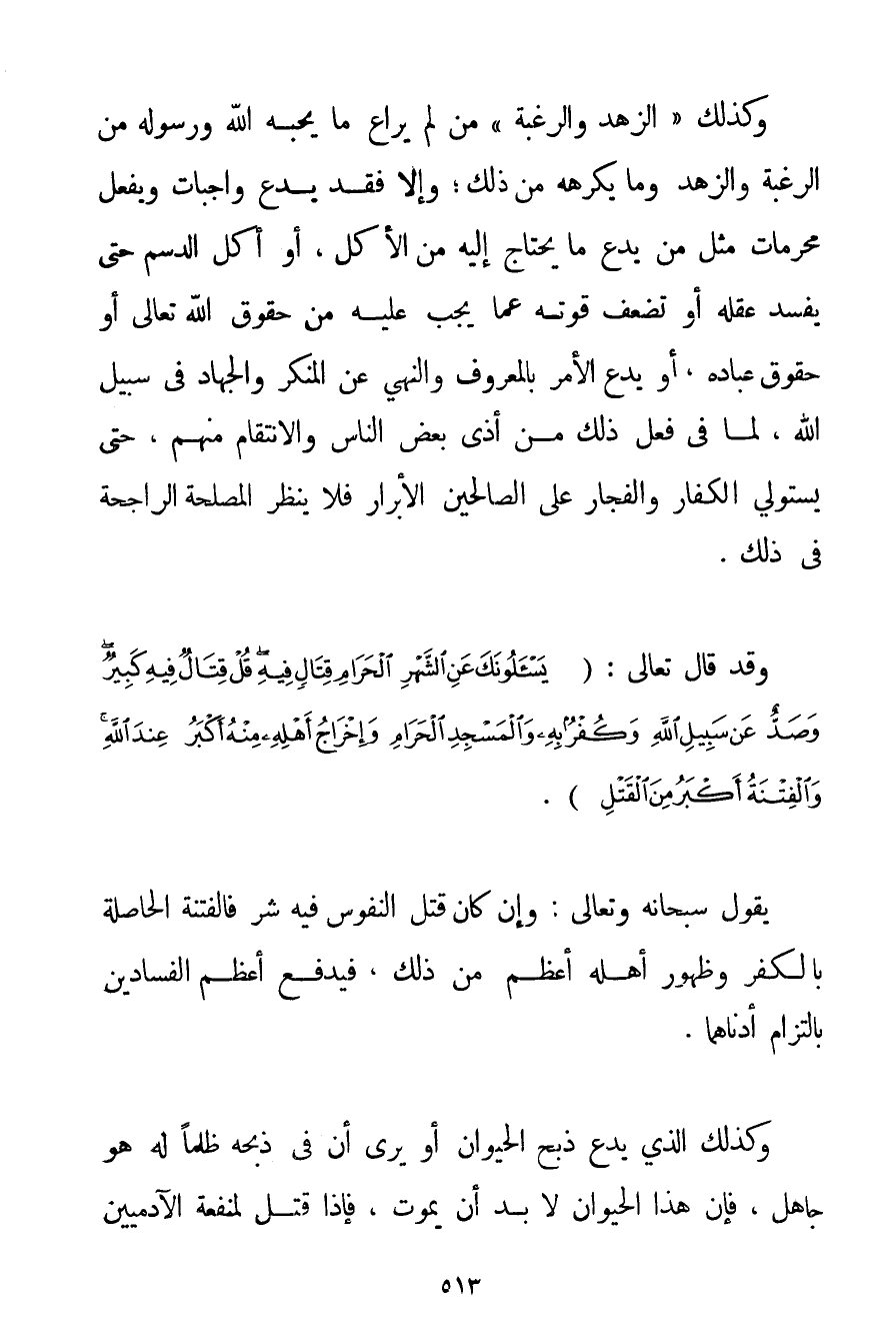 وَكَذَلِكَ " الزُّهْدُ وَالرَّغْبَةُ " مَنْ لَمْ يُرَاعِ مَا يُحِبُّهُ اللَّهُ وَرَسُولُهُ مِنْ الرَّغْبَةِ وَالزُّهْدِ وَمَا يَكْرَهُهُ مِنْ ذَلِكَ؛ وَإِلَّا فَقَدَ يَدَعُ وَاجِبَاتٍ وَيَفْعَلُ مُحَرَّمَاتٍ مِثْلُ مَنْ يَدْعُ مَا يَحْتَاجُ إلَيْهِ مِنْ الْأَكْلِ أَوْ أَكْلِ الدَّسِمِ حَتَّى يَفْسُدُ عَقْلُهُ أَوْ تَضْعُفَ قُوَّتُهُ عَمَّا يَجِبُ عَلَيْهِ مِنْ حُقُوقِ اللَّهِ تَعَالَى أَوْ حُقُوقِ عِبَادِهِ أَوْ يَدَعُ الْأَمْرَ بِالْمَعْرُوفِ وَالنَّهْيَ عَنْ الْمُنْكَرِ وَالْجِهَادَ فِي سَبِيلِ اللَّهِ لِمَا فِي فِعْلِ ذَلِكَ مِنْ أَذَى بَعْضِ النَّاسِ وَالِانْتِقَامِ مِنْهُمْ حَتَّى يَسْتَوْلِيَ الْكُفَّارُ وَالْفُجَّارُ عَلَى الصَّالِحِينَ الْأَبْرَارِ فَلَا يَنْظُرُ الْمَصْلَحَةَ الرَّاجِحَةَ فِي ذَلِكَ. وَقَدْ قَالَ تَعَالَى: {يَسْأَلُونَكَ عَنِ الشَّهْرِ الْحَرَامِ قِتَالٍ فِيهِ قُلْ قِتَالٌ فِيهِ كَبِيرٌ وَصَدٌّ عَنْ سَبِيلِ اللَّهِ وَكُفْرٌ بِهِ وَالْمَسْجِدِ الْحَرَامِ وَإِخْرَاجُ أَهْلِهِ مِنْهُ أَكْبَرُ عِنْدَ اللَّهِ وَالْفِتْنَةُ أَكْبَرُ مِنَ الْقَتْلِ} . يَقُولُ سُبْحَانَهُ وَتَعَالَى: وَإِنْ كَانَ قَتْلُ النُّفُوسِ فِيهِ شَرٌّ فَالْفِتْنَةُ الْحَاصِلَةُ بِالْكُفْرِ، وَظُهُورُ أَهْلِهِ أَعْظَمُ مِنْ ذَلِكَ فَيَدْفَعُ أَعْظَمَ الفسادين بِالْتِزَامِ أَدْنَاهُمَا. وَكَذَلِكَ الَّذِي يَدَعُ ذَبْحَ الْحَيَوَانِ أَوْ يَرَى أَنَّ فِي ذَبْحِهِ ظُلْمًا لَهُ هُوَ جَاهِلٌ فَإِنَّ هَذَا الْحَيَوَانَ لَا بُدَّ أَنْ يَمُوتَ فَإِذَا قُتِلَ لِمَنْفَعَةِ الْآدَمِيِّينَ