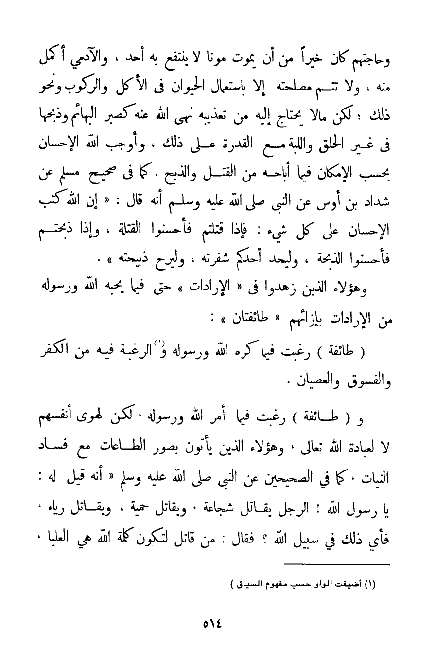 وَحَاجَتِهِمْ كَانَ خَيْرًا مِنْ أَنْ يَمُوتَ مَوْتًا لَا يَنْتَفِعُ بِهِ أَحَدٌ وَالْآدَمِيُّ أَكْمَلُ مِنْهُ وَلَا تَتِمُّ مَصْلَحَتُهُ إلَّا بِاسْتِعْمَالِ الْحَيَوَانِ فِي الْأَكْلِ وَالرُّكُوبِ وَنَحْوِ ذَلِكَ؛ لَكِنْ مَا لَا يَحْتَاجُ إلَيْهِ مِنْ تَعْذِيبِهِ نَهَى اللَّهُ عَنْهُ كَصَبْرِ الْبَهَائِمِ وَذَبْحِهَا فِي غَيْرِ الْحَلْقِ واللبة مَعَ الْقُدْرَةِ عَلَى ذَلِكَ وَأَوْجَبَ اللَّهُ الْإِحْسَانَ بِحَسَبِ الْإِمْكَانِ فِيمَا أَبَاحَهُ مِنْ الْقَتْلِ وَالذَّبْحِ. كَمَا فِي صَحِيحِ مُسْلِمٍ عَنْ شَدَّادِ بْنِ أَوْسٍ عَنْ النَّبِيِّ صَلَّى اللَّهُ عَلَيْهِ وَسَلَّمَ أَنَّهُ قَالَ: " {إنَّ اللَّهَ كَتَبَ الْإِحْسَانَ عَلَى كُلِّ شَيْءٍ: فَإِذَا قَتَلْتُمْ فَأُحْسِنُوا الْقِتْلَةَ وَإِذَا ذَبَحْتُمْ فَأُحْسِنُوا الذِّبْحَةَ وَلْيُحِدَّ أَحَدُكُمْ شَفْرَتَهُ وَلْيُرِحْ ذَبِيحَتَهُ} ". وَهَؤُلَاءِ الَّذِينَ زَهِدُوا فِي " الْإِرَادَاتِ " حَتَّى فِيمَا يُحِبُّهُ اللَّهُ وَرَسُولُهُ مِنْ الْإِرَادَاتِ بِإِزَائِهِمْ " طَائِفَتَانِ ": (طَائِفَةٌ رَغِبَتْ فِيمَا كَرِهَ اللَّهُ وَرَسُولُهُ وَالرَّغْبَةُ فِيهِ مِنْ الْكُفْرِ وَالْفُسُوقِ وَالْعِصْيَانِ. وَ (طَائِفَةٌ رَغِبَتْ فِيمَا أَمَرَ اللَّهُ وَرَسُولُهُ لَكِنْ لِهَوَى أَنْفُسِهِمْ لَا لِعِبَادَةِ اللَّهِ تَعَالَى وَهَؤُلَاءِ الَّذِينَ يَأْتُونَ بِصُوَرِ الطَّاعَاتِ مَعَ فَسَادِ النِّيَّاتِ كَمَا فِي الصَّحِيحَيْنِ عَنْ النَّبِيِّ صَلَّى اللَّهُ عَلَيْهِ وَسَلَّمَ " {أَنَّهُ قِيلَ لَهُ: يَا رَسُولَ اللَّهِ الرَّجُلُ يُقَاتِلُ شَجَاعَةً وَيُقَاتِلُ حَمِيَّةً وَيُقَاتِلُ رِيَاءً فَأَيُّ ذَلِكَ فِي سَبِيلِ اللَّهِ؟ فَقَالَ: مَنْ قَاتَلَ لِتَكُونَ كَلِمَةُ اللَّهِ هِيَ الْعُلْيَا