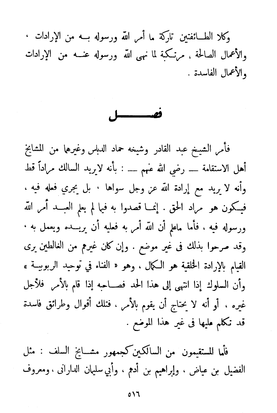 فَأَمَرَ الشَّيْخُ عَبْدُ الْقَادِرِ وَشَيْخُهُ حَمَّادٌ الدباس وَغَيْرُهُمَا مِنْ الْمَشَايِخِ أَهْلَ الِاسْتِقَامَةِ - رَضِيَ اللَّهُ عَنْهُمْ -: بِأَنَّهُ لَا يُرِيدُ السَّالِكُ مُرَادًا قَطُّ وَأَنَّهُ لَا يُرِيدُ مَعَ إرَادَةِ اللَّهِ عَزَّ وَجَلَّ سِوَاهَا بَلْ يَجْرِي فِعْلُهُ فِيهِ فَيَكُونُ هُوَ مُرَادُ الْحَقِّ. إنَّمَا قَصَدُوا بِهِ فِيمَا لَمْ يَعْلَمْ الْعَبْدُ أَمْرَ اللَّهِ وَرَسُولِهِ فِيهِ فَأَمَّا مَا عَلِمَ أَنَّ اللَّهَ أَمَرَ بِهِ فَعَلَيْهِ أَنْ يُرِيدَهُ وَيَعْمَلَ بِهِ وَقَدْ صَرَّحُوا بِذَلِكَ فِي غَيْرِ مَوْضِعٍ. وَإِنْ كَانَ غَيْرُهُمْ مِنْ الغالطين يَرَى الْقِيَامَ بِالْإِرَادَةِ الْخِلْقِيَّةِ هُوَ الْكَمَالُ وَهُوَ " الْفَنَاءُ فِي تَوْحِيدِ الرُّبُوبِيَّةِ " وَأَنَّ السُّلُوكَ إذَا انْتَهَى إلَى هَذَا الْحَدِّ فَصَاحِبُهُ إذَا قَامَ بِالْأَمْرِ فَلِأَجْلِ غَيْرِهِ أَوْ أَنَّهُ لَا يَحْتَاجُ أَنْ يَقُومَ بِالْأَمْرِ فَتِلْكَ أَقْوَالٌ وَطَرَائِقُ فَاسِدَةٌ قَدْ تُكُلِّمَ عَلَيْهَا فِي غَيْرِ هَذَا الْمَوْضِعِ. فَأَمَّا الْمُسْتَقِيمُونَ مِنْ السَّالِكِينَ كَجُمْهُورِ مَشَايِخِ السَّلَفِ: مِثْلِ الْفُضَيْل بْنِ عِيَاضِ وَإِبْرَاهِيمَ بْنِ أَدْهَمَ وَأَبِي سُلَيْمَانَ الداراني وَمَعْرُوفٍ
