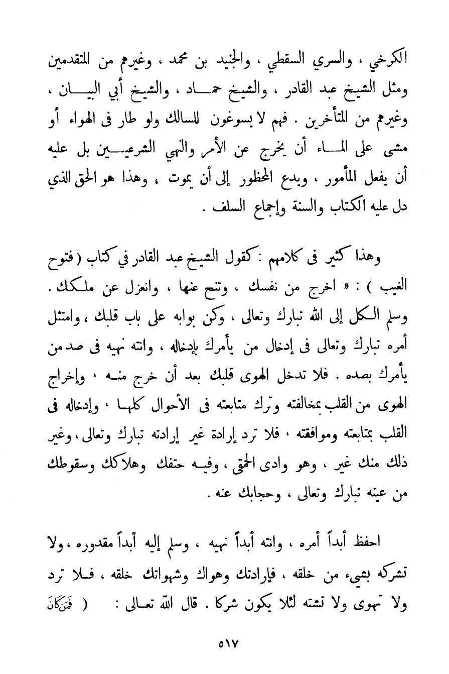 الْكَرْخِي وَالسَّرِيِّ السقطي والْجُنَيْد بْنِ مُحَمَّدٍ وَغَيْرِهِمْ مِنْ الْمُتَقَدِّمِينَ، وَمِثْلِ الشَّيْخِ عَبْدِ الْقَادِرِ وَالشَّيْخِ حَمَّادٍ وَالشَّيْخِ أَبِي الْبَيَانِ وَغَيْرِهِمْ مِنْ الْمُتَأَخِّرِينَ. فَهُمْ لَا يُسَوِّغُونَ لِلسَّالِكِ وَلَوْ طَارَ فِي الْهَوَاءِ أَوْ مَشَى عَلَى الْمَاءِ أَنْ يَخْرُجَ عَنْ الْأَمْرِ وَالنَّهْيِ الشَّرْعِيَّيْنِ بَلْ عَلَيْهِ أَنْ يَفْعَلَ الْمَأْمُورَ وَيَدَعَ الْمَحْظُورَ إلَى أَنْ يَمُوتَ وَهَذَا هُوَ الْحَقُّ الَّذِي دَلَّ عَلَيْهِ الْكِتَابُ وَالسُّنَّةُ وَإِجْمَاعُ السَّلَفِ. وَهَذَا كَثِيرٌ فِي كَلَامِهِمْ: كَقَوْلِ الشَّيْخِ عَبْدِ الْقَادِرِ فِي كِتَابِ (فُتُوحِ الْغَيْبِ: " اُخْرُجْ مِنْ نَفْسِك وَتَنَحَّ عَنْهَا وَانْعَزِلْ عَنْ مُلْكِك. وَسَلِّمْ الْكُلَّ إلَى اللَّهِ - تَبَارَكَ وَتَعَالَى - وَكُنْ بَوَّابَهُ عَلَى بَابِ قَلْبِك، وَامْتَثِلْ أَمْرَهُ - تَبَارَكَ وَتَعَالَى - فِي إدْخَالِ مَنْ يَأْمُرُك بِإِدْخَالِهِ وَانْتَهِ نَهْيَهُ فِي صَدِّ مَنْ يَأْمُرُك بِصَدِّهِ. فَلَا تُدْخِلْ الْهَوَى قَلْبَك بَعْدَ أَنْ خَرَجَ مِنْهُ وَإِخْرَاجُ الْهَوَى مِنْ الْقَلْبِ بِمُخَالَفَتِهِ، وَتَرْكِ مُتَابَعَتِهِ فِي الْأَحْوَالِ كُلِّهَا وَإِدْخَالُهُ فِي الْقَلْبِ بِمُتَابَعَتِهِ وَمُوَافَقَتِهِ فَلَا تُرَدْ إرَادَةٌ غَيْرُ إرَادَتِهِ - تَبَارَكَ وَتَعَالَى - وَغَيْرُ ذَلِكَ مِنْك غَيْرٌ وَهُوَ وَادِي الْحَمْقَى وَفِيهِ حَتْفُك وَهَلَاكُك وَسُقُوطُك مِنْ عَيْنِهِ - تَبَارَكَ وَتَعَالَى - وَحِجَابُك عَنْهُ. احْفَظْ أَبَدًا أَمْرَهُ وَانْتَهِ أَبَدًا نَهْيَهُ وَسَلِّمْ إلَيْهِ أَبَدًا مَقْدُورَهُ وَلَا تُشْرِكْهُ بِشَيْءِ مِنْ خَلْقِهِ فَإِرَادَتُك وَهَوَاك وَشَهَوَاتُك خَلْقُهُ فَلَا تَرُدَّ وَلَا تَهْوَى وَلَا تَشْتَهِ لِئَلَّا يَكُونَ شِرْكًا. قَالَ اللَّهُ تَعَالَى: {فَمَنْ كَانَ