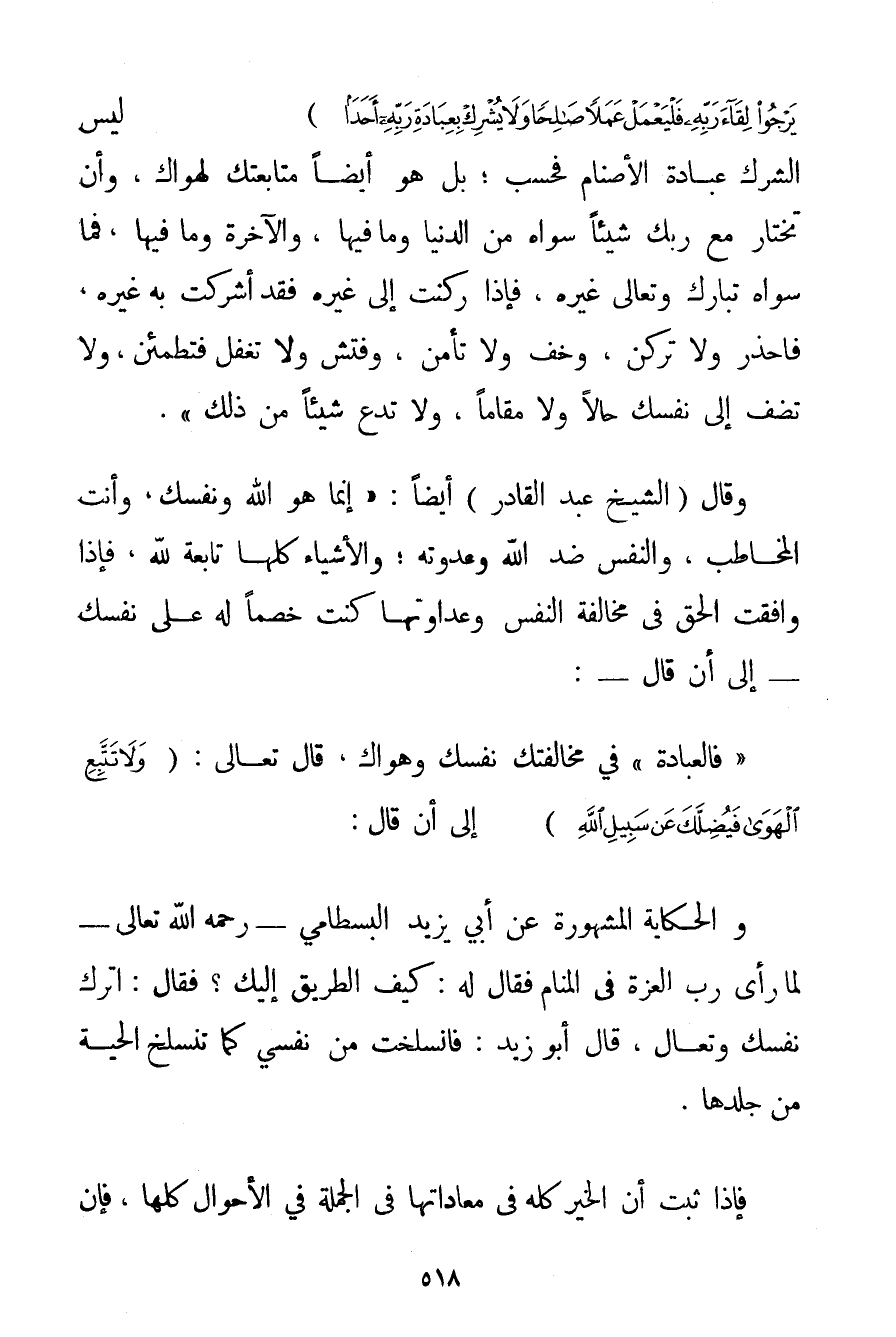 يَرْجُوا لِقَاءَ رَبِّهِ فَلْيَعْمَلْ عَمَلًا صَالِحًا وَلَا يُشْرِكْ بِعِبَادَةِ رَبِّهِ أَحَدًا} لَيْسَ الشِّرْكُ عِبَادَةَ الْأَصْنَامِ فَحَسْبُ؛ بَلْ هُوَ أَيْضًا مُتَابَعَتُك لِهَوَاك وَأَنْ تَخْتَارَ مَعَ رَبِّك شَيْئًا سِوَاهُ مِنْ الدُّنْيَا وَمَا فِيهَا وَالْآخِرَةِ وَمَا فِيهَا فَمَا سِوَاهُ - تَبَارَكَ وَتَعَالَى - غَيْرُهُ فَإِذَا رَكَنْت إلَى غَيْرِهِ فَقَدْ أَشْرَكْت بِهِ غَيْرَهُ فَاحْذَرْ وَلَا تَرْكَنْ وَخَفْ وَلَا تَأْمَنْ وَفَتِّشْ وَلَا تَغْفُلْ فَتَطْمَئِنَّ وَلَا تُضِفْ إلَى نَفْسِك حَالًا وَلَا مَقَامًا وَلَا تَدَعْ شَيْئًا مِنْ ذَلِكَ ". وَقَالَ (الشَّيْخُ عَبْدُ الْقَادِرِ أَيْضًا: " إنَّمَا هُوَ اللَّهُ وَنَفْسُك وَأَنْتَ الْمُخَاطَبُ وَالنَّفْسُ ضِدُّ اللَّهِ وَعَدُوَّتُهُ؛ وَالْأَشْيَاءُ كُلُّهَا تَابِعَةٌ لِلَّهِ فَإِذَا وَافَقْت الْحَقَّ فِي مُخَالَفَةِ النَّفْسِ وَعَدَاوَتِهَا كُنْت خَصْمًا لَهُ عَلَى نَفْسِك - إلَى أَنْ قَالَ -: " فَالْعِبَادَةُ " فِي مُخَالَفَتِك نَفْسَك وَهَوَاك قَالَ تَعَالَى: {وَلَا تَتَّبِعِ الْهَوَى فَيُضِلَّكَ عَنْ سَبِيلِ اللَّهِ} إلَى أَنْ قَالَ: وَالْحِكَايَةُ الْمَشْهُورَةُ عَنْ أَبِي يَزِيدَ البسطامي - رَحِمَهُ اللَّهُ تَعَالَى - لَمَّا رَأَى رَبَّ الْعِزَّةِ فِي الْمَنَامِ فَقَالَ لَهُ: كَيْفَ الطَّرِيقُ إلَيْك؟ فَقَالَ: اُتْرُكْ نَفْسَك وَتَعَالَ قَالَ أَبُو يَزِيدَ: فَانْسَلَخْت مِنْ نَفْسِي كَمَا تَنْسَلِخُ الْحَيَّةُ مِنْ جِلْدِهَا. فَإِذَا ثَبَتَ أَنَّ الْخَيْرَ كُلَّهُ فِي مُعَادَاتِهَا فِي الْجُمْلَةِ فِي الْأَحْوَالِ كُلِّهَا فَإِنْ