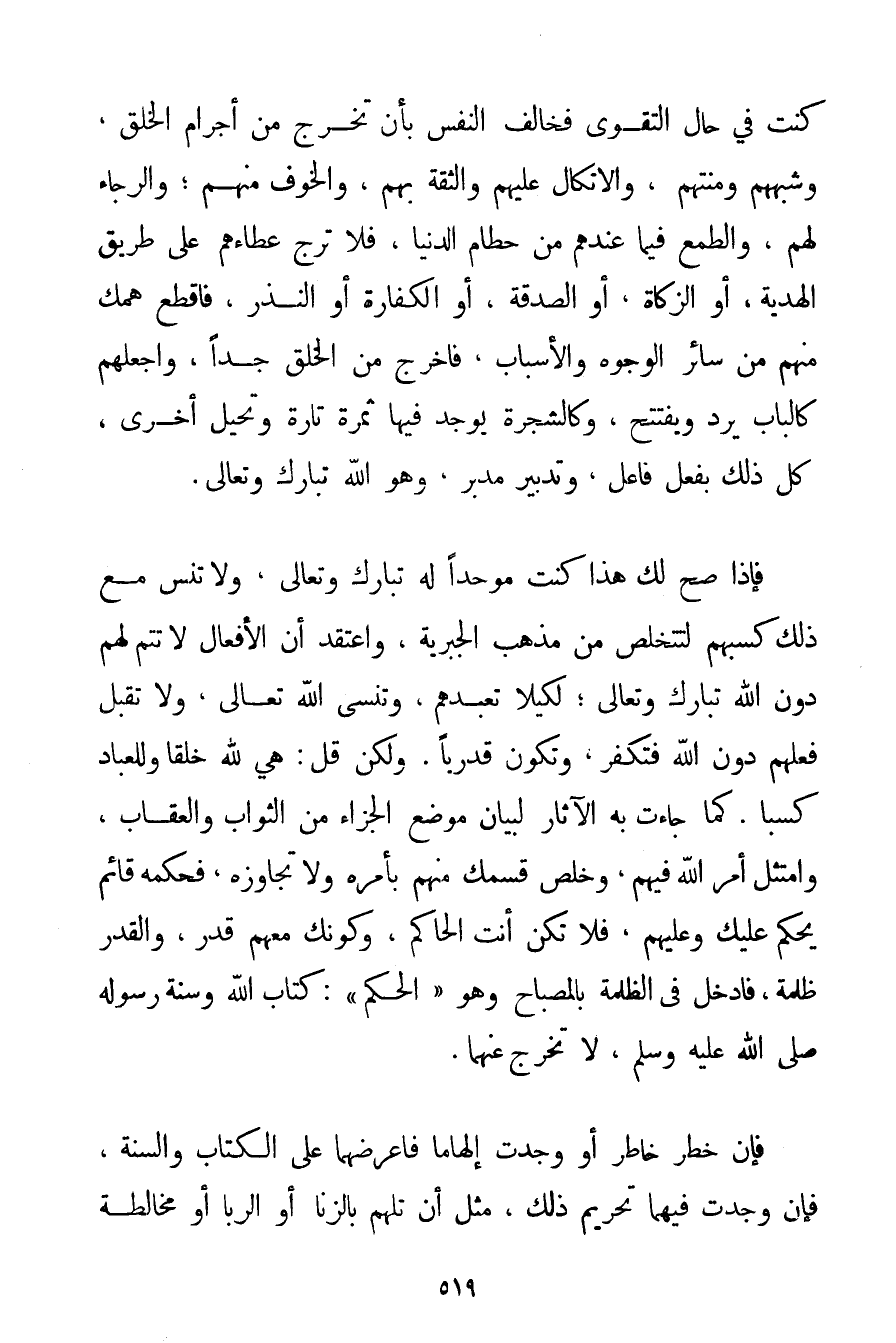 كُنْت فِي حَالِ التَّقْوَى فَخَالِفْ النَّفْسَ بِأَنْ تَخْرُجَ مِنْ إجْرَامِ الْخَلْقِ وَشَبَهِهِمْ وَمِنَّتِهِمْ وَالِاتِّكَالِ عَلَيْهِمْ وَالثِّقَةِ بِهِمْ وَالْخَوْفِ مِنْهُمْ؛ وَالرَّجَاءِ لَهُمْ وَالطَّمَعِ فِيمَا عِنْدَهُمْ مِنْ حُطَامِ الدُّنْيَا فَلَا تَرْجُ عَطَاءَهُمْ عَلَى طَرِيقِ الْهَدِيَّةِ أَوْ الزَّكَاةِ أَوْ الصَّدَقَةِ أَوْ الْكَفَّارَةِ أَوْ النَّذْرِ فَاقْطَعْ هَمَّك مِنْهُمْ مَنْ سَائِرِ الْوُجُوهِ وَالْأَسْبَابِ فَاخْرُجْ مِنْ الْخَلْقِ جِدًّا وَاجْعَلْهُمْ كَالْبَابِ يُرَدُّ وَيُفْتَتَحُ وَكَالشَّجَرَةِ يُوجَدُ فِيهَا ثَمَرَةٌ تَارَةً وَتُحِيلُ أُخْرَى كُلُّ ذَلِكَ بِفِعْلِ فَاعِلٍ وَتَدْبِيرِ مُدَبِّرٍ، وَهُوَ اللَّهُ تَبَارَكَ وَتَعَالَى. فَإِذَا صَحَّ لَك هَذَا كُنْت مُوَحِّدًا لَهُ - تَبَارَكَ وَتَعَالَى - وَلَا تَنْسَ مَعَ ذَلِكَ كَسْبَهُمْ لِتَتَخَلَّصَ مِنْ مَذْهَبِ الْجَبْرِيَّةِ وَأَعْتَقِدُ أَنَّ الْأَفْعَالَ لَا تَتِمُّ لَهُمْ دُونَ اللَّهِ - تَبَارَكَ وَتَعَالَى - لِكَيْلَا تَعْبُدَهُمْ وَتَنْسَى اللَّهَ تَعَالَى وَلَا تَقْبَلْ فِعْلَهُمْ دُونَ اللَّهِ فَتَكْفُرَ وَتَكُونَ قَدَرِيًّا. وَلَكِنْ قُلْ: هِيَ لِلَّهِ خَلْقًا وَلِلْعِبَادِ كَسْبًا. كَمَا جَاءَتْ بِهِ الْآثَارُ لِبَيَانِ مَوْضِعِ الْجَزَاءِ مِنْ الثَّوَابِ وَالْعِقَابِ، وَامْتَثِلْ أَمْرَ اللَّهِ فِيهِمْ وَخَلِّصْ قِسْمَك مِنْهُمْ بِأَمْرِهِ وَلَا تُجَاوِزْهُ فَحُكْمُهُ قَائِمٌ يُحْكَمُ عَلَيْك وَعَلَيْهِمْ فَلَا تَكُنْ أَنْتَ الْحَاكِمُ وَكَوْنُك مَعَهُمْ قَدَرٌ وَالْقَدَرُ ظُلْمَةٌ فَادْخُلْ فِي الظُّلْمَةِ بِالْمِصْبَاحِ وَهُوَ " الْحُكْمُ ": كِتَابُ اللَّهِ وَسُنَّةُ رَسُولِهِ صَلَّى اللَّهُ عَلَيْهِ وَسَلَّمَ لَا تَخْرُجْ عَنْهُمَا. فَإِنْ خَطَرَ خَاطِرٌ أَوْ وَجَدْت إلْهَامًا فَاعْرِضْهُمَا عَلَى الْكِتَابِ وَالسُّنَّةِ فَإِنْ وَجَدْت فِيهِمَا تَحْرِيمَ ذَلِكَ مِثْلَ أَنْ تُلْهَمَ بِالزِّنَا أَوْ الرِّبَا أَوْ مُخَالَطَةِ