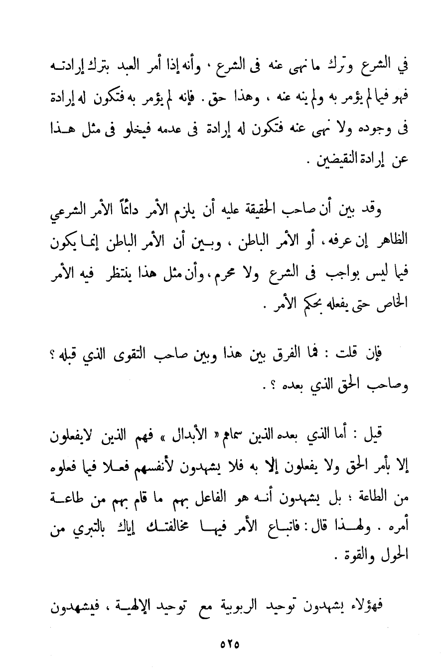 فِي الشَّرْعِ، وَتَرْكَ مَا نُهِيَ عَنْهُ فِي الشَّرْعِ وَأَنَّهُ إذَا أُمِرَ الْعَبْدُ بِتَرْكِ إرَادَتِهِ فَهُوَ فِيمَا لَمْ يُؤْمَرْ بِهِ وَلَمْ يُنْهَ عَنْهُ وَهَذَا حَقٌّ. فَإِنَّهُ لَمْ يُؤْمَرْ بِهِ فَتَكُونُ لَهُ إرَادَةٌ فِي وُجُودِهِ وَلَا نُهِيَ عَنْهُ فَتَكُونُ لَهُ إرَادَةٌ فِي عَدَمِهِ فَيَخْلُو فِي مِثْلِ هَذَا عَنْ إرَادَةِ النَّقِيضَيْنِ. وَقَدْ بُيِّنَ أَنَّ صَاحِبَ الْحَقِيقَةِ عَلَيْهِ أَنْ يَلْزَمَ الْأَمْرَ دَائِمًا الْأَمْرَ الشَّرْعِيَّ الظَّاهِرَ إنْ عَرَفَهُ أَوْ الْأَمْرَ الْبَاطِنَ، وَبُيِّنَ أَنَّ الْأَمْرَ الْبَاطِنَ إنَّمَا يَكُونُ فِيمَا لَيْسَ بِوَاجِبِ فِي الشَّرْعِ وَلَا مُحَرَّمٍ وَأَنَّ مِثْلَ هَذَا يُنْتَظَرُ فِيهِ الْأَمْرُ الْخَاصُّ حَتَّى يَفْعَلَهُ بِحُكْمِ الْأَمْرِ. فَإِنْ قُلْت: فَمَا الْفَرْقُ بَيْنَ هَذَا وَبَيْنَ صَاحِبِ التَّقْوَى الَّذِي قَبْلَهُ؟ وَصَاحِبِ الْحَقِّ الَّذِي بَعْدَهُ؟ . قِيلَ: أَمَّا الَّذِي بَعْدَهُ الَّذِينَ سَمَّاهُمْ " الْأَبْدَالَ " فَهُمْ الَّذِينَ لَا يَفْعَلُونَ إلَّا بِأَمْرِ الْحَقِّ، وَلَا يَفْعَلُونَ إلَّا بِهِ فَلَا يَشْهَدُونَ لِأَنْفُسِهِمْ فِعْلًا فِيمَا فَعَلُوهُ مِنْ الطَّاعَةِ؛ بَلْ يَشْهَدُونَ أَنَّهُ هُوَ الْفَاعِلُ بِهِمْ مَا قَامَ بِهِمْ مِنْ طَاعَةِ أَمْرِهِ. وَلِهَذَا قَالَ: فَاتِّبَاعُ الْأَمْرِ فِيهَا مُخَالَفَتُك إيَّاكَ بِالتَّبَرِّي مِنْ الْحَوْلِ وَالْقُوَّةِ. فَهَؤُلَاءِ يَشْهَدُونَ تَوْحِيدَ الرُّبُوبِيَّةِ مَعَ تَوْحِيدِ الْإِلَهِيَّةِ فَيَشْهَدُونَ