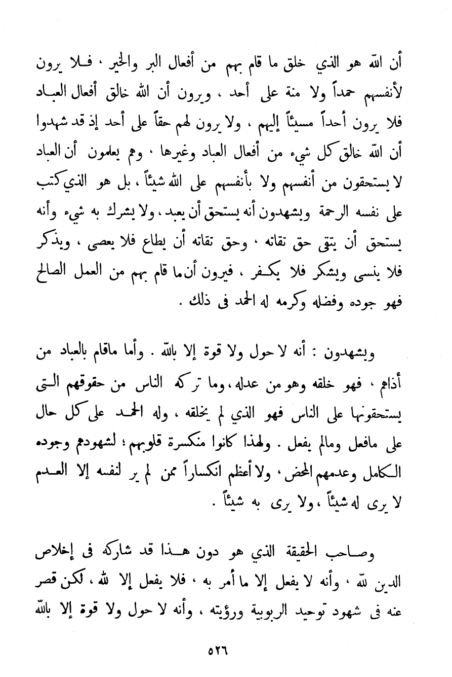 أَنَّ اللَّهَ هُوَ الَّذِي خَلَقَ مَا قَامَ بِهِمْ مِنْ أَفْعَالِ الْبِرِّ وَالْخَيْرِ فَلَا يَرَوْنَ لِأَنْفُسِهِمْ حَمْدًا وَلَا مِنَّةً عَلَى أَحَدٍ، وَيَرَوْنَ أَنَّ اللَّهَ خَالِقُ أَفْعَالِ الْعِبَادِ فَلَا يَرَوْنَ أَحَدًا مُسِيئًا إلَيْهِمْ وَلَا يَرَوْنَ لَهُمْ حَقًّا عَلَى أَحَدٍ إذْ قَدْ شَهِدُوا أَنَّ اللَّهَ خَالِقُ كُلِّ شَيْءٍ مِنْ أَفْعَالِ الْعِبَادِ وَغَيْرِهَا وَهُمْ يَعْلَمُونَ أَنَّ الْعِبَادَ لَا يَسْتَحِقُّونَ مِنْ أَنْفُسِهِمْ وَلَا بِأَنْفُسِهِمْ عَلَى اللَّهِ شَيْئًا بَلْ هُوَ الَّذِي كَتَبَ عَلَى نَفْسِهِ الرَّحْمَةَ وَيَشْهَدُونَ أَنَّهُ يَسْتَحِقُّ أَنْ يُعْبَدَ وَلَا يُشْرَكَ بِهِ شَيْءٌ، وَأَنَّهُ يَسْتَحِقُّ أَنْ يُتَّقَى حَقَّ تُقَاتِهِ، وَحَقُّ تُقَاتِهِ أَنْ يُطَاعَ فَلَا يُعْصَى، وَيُذْكَرَ فَلَا يُنْسَى، وَيُشْكَرَ فَلَا يُكْفَرَ فَيَرَوْنَ أَنَّ مَا قَامَ بِهِمْ مِنْ الْعَمَلِ الصَّالِحِ فَهُوَ جُودُهُ وَفَضْلُهُ وَكَرَمُهُ لَهُ الْحَمْدُ فِي ذَلِكَ. وَيَشْهَدُونَ: أَنَّهُ لَا حَوْلَ وَلَا قُوَّةَ إلَّا بِاَللَّهِ. وَأَمَّا مَا قَامَ بِالْعِبَادِ مِنْ أَذَاهُمْ فَهُوَ خَلَقَهُ وَهُوَ مِنْ عَدْلِهِ، وَمَا تَرَكَهُ النَّاسُ مِنْ حُقُوقِهِمْ الَّتِي يَسْتَحِقُّونَهَا عَلَى النَّاسِ فَهُوَ الَّذِي لَمْ يَخْلُقْهُ وَلَهُ الْحَمْدُ عَلَى كُلِّ حَالٍ عَلَى مَا فَعَلَ وَمَا لَمْ يَفْعَلْ. وَلِهَذَا كَانُوا مُنْكَسِرَةً قُلُوبُهُمْ؛ لِشُهُودِهِمْ وُجُودَهُ الْكَامِلَ، وَعَدَمَهُمْ الْمَحْضَ، وَلَا أَعْظَمَ انْكِسَارًا مِمَّنْ لَمْ يَرَ لِنَفْسِهِ إلَّا الْعَدَمَ لَا يَرَى لَهُ شَيْئًا وَلَا يَرَى بِهِ شَيْئًا. وَصَاحِبُ الْحَقِيقَةِ الَّذِي هُوَ دُونَ هَذَا قَدْ شَارَكَهُ فِي إخْلَاصِ الدِّينِ لِلَّهِ وَأَنَّهُ لَا يَفْعَلُ إلَّا مَا أُمِرَ بِهِ فَلَا يَفْعَلُ إلَّا لِلَّهِ لَكِنْ قُصِرَ عَنْهُ فِي شُهُودِ تَوْحِيدِ الرُّبُوبِيَّةِ وَرُؤْيَتِهِ وَأَنَّهُ لَا حَوْلَ وَلَا قُوَّةَ إلَّا بِاَللَّهِ