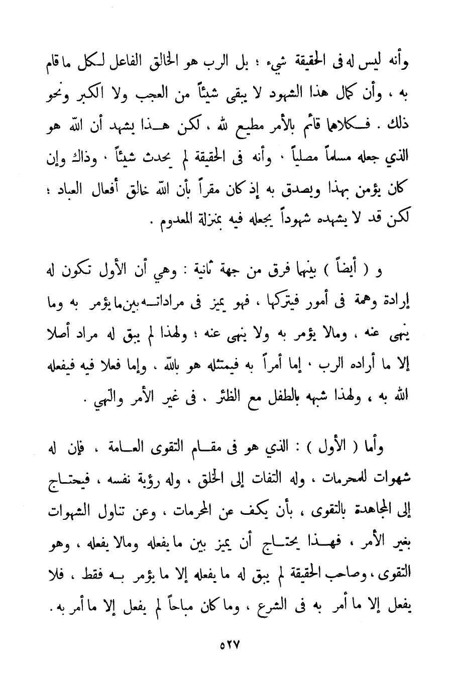 وَأَنَّهُ لَيْسَ لَهُ فِي الْحَقِيقَةِ شَيْءٌ. بَلْ الرَّبُّ هُوَ الْخَالِقُ الْفَاعِلُ لِكُلِّ مَا قَامَ بِهِ وَأَنَّ كَمَالَ هَذَا الشُّهُودِ لَا يُبْقِي شَيْئًا مِنْ الْعَجَبِ وَلَا الْكِبَرِ وَنَحْوِ ذَلِكَ. فَكِلَاهُمَا قَائِمٌ بِالْأَمْرِ مُطِيعٌ لِلَّهِ لَكِنْ هَذَا يَشْهَدُ أَنَّ اللَّهَ هُوَ الَّذِي جَعَلَهُ مُسْلِمًا مُصَلِّيًا وَأَنَّهُ فِي الْحَقِيقَةِ لَمْ يُحْدِثْ شَيْئًا، وَذَاكَ وَإِنْ كَانَ يُؤْمِنُ بِهَذَا وَيُصَدِّقُ بِهِ إذْ كَانَ مُقِرًّا بِأَنَّ اللَّهَ خَالِقُ أَفْعَالِ الْعِبَادِ؛ لَكِنْ قَدْ لَا يَشْهَدُهُ شُهُودًا يَجْعَلُهُ فِيهِ بِمَنْزِلَةِ الْمَعْدُومِ. وَأَيْضًا بَيْنَهُمَا فَرْقٌ مِنْ جِهَةٍ ثَانِيَةٍ: وَهِيَ أَنَّ الْأَوَّلَ تَكُونُ لَهُ إرَادَةٌ وَهِمَّةٌ فِي أُمُورٍ فَيَتْرُكُهَا فَهُوَ يُمَيِّزُ فِي مُرَادَاتِهِ بَيْنَمَا يُؤْمَرُ بِهِ وَمَا يُنْهَى عَنْهُ وَمَا لَا يُؤْمَرُ بِهِ وَلَا يُنْهَى عَنْهُ؛ وَلِهَذَا لَمْ يَبْقَ لَهُ مُرَادٌ أَصْلًا إلَّا مَا أَرَادَهُ الرَّبُّ إمَّا أَمْرًا بِهِ فَيَمْتَثِلُهُ هُوَ بِاَللَّهِ وَإِمَّا فِعْلًا فِيهِ فَيَفْعَلُهُ اللَّهُ بِهِ وَلِهَذَا شَبَّهَهُ بِالطِّفْلِ مَعَ الظِّئْرِ فِي غَيْرِ الْأَمْرِ وَالنَّهْيِ. وَأَمَّا (الْأَوَّلُ: الَّذِي هُوَ فِي مَقَامِ التَّقْوَى الْعَامَّةِ فَإِنَّ لَهُ شَهَوَاتٍ لِلْمُحَرَّمَاتِ وَلَهُ الْتِفَاتٌ إلَى الْخَلْقِ وَلَهُ رُؤْيَةُ نَفْسِهِ فَيَحْتَاجُ إلَى الْمُجَاهَدَةِ بِالتَّقْوَى بِأَنْ يَكُفَّ عَنْ الْمُحَرَّمَاتِ وَعَنْ تَنَاوُلِ الشَّهَوَاتِ بِغَيْرِ الْأَمْرِ فَهَذَا يَحْتَاجُ أَنْ يُمَيِّزَ بَيْنَ مَا يَفْعَلُهُ وَمَا لَا يَفْعَلُهُ وَهُوَ التَّقْوَى وَصَاحِبُ الْحَقِيقَةِ لَمْ يَبْقَ لَهُ مَا يَفْعَلُهُ إلَّا مَا يُؤْمَرُ بِهِ فَقَطْ فَلَا يَفْعَلُ إلَّا مَا أُمِرَ بِهِ فِي الشَّرْعِ وَمَا كَانَ مُبَاحًا لَمْ يَفْعَلْ إلَّا مَا أُمِرَ بِهِ.