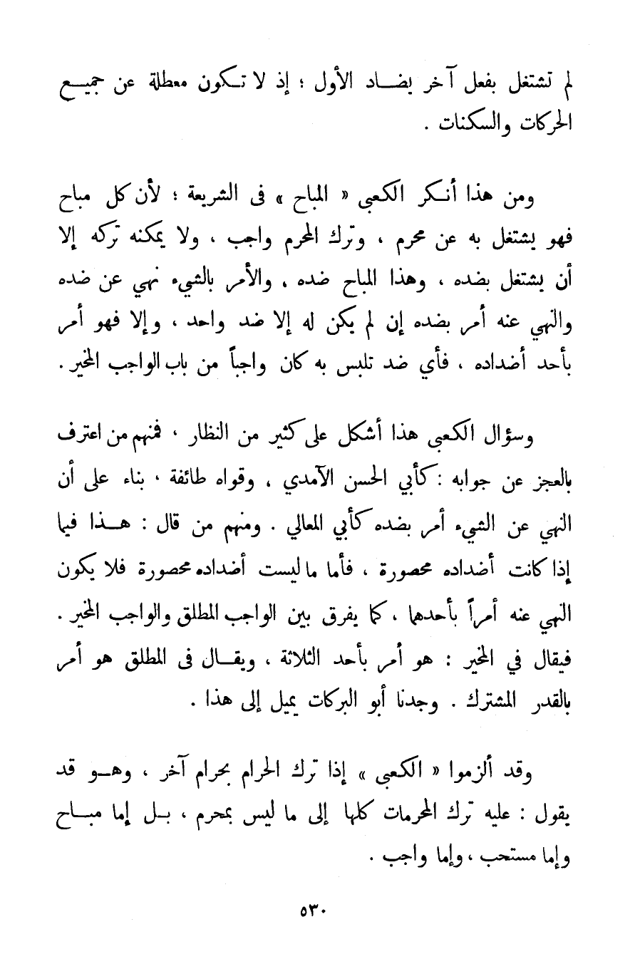 لَمْ تَشْتَغِلْ بِفِعْلِ آخَرَ يُضَادُّ الْأَوَّلَ؛ إذْ لَا تَكُونُ مُعَطَّلَةً عَنْ جَمِيعِ الْحَرَكَاتِ وَالسَّكَنَاتِ. وَمِنْ هَذَا أَنْكَرَ الْكَعْبِيُّ " الْمُبَاحَ " فِي الشَّرِيعَةِ لِأَنَّ كُلَّ مُبَاحٍ فَهُوَ يُشْتَغَلُ بِهِ عَنْ مُحَرَّمٍ، وَتَرْكُ الْمُحَرَّمِ وَاجِبٌ وَلَا يُمْكِنُهُ تَرْكُهُ إلَّا أَنْ يُشْتَغَلَ بِضِدِّهِ وَهَذَا الْمُبَاحُ ضِدُّهُ، وَالْأَمْرُ بِالشَّيْءِ نَهْيٌ عَنْ ضِدِّهِ، وَالنَّهْيُ عَنْهُ أَمْرٌ بِضِدِّهِ إنْ لَمْ يَكُنْ لَهُ إلَّا ضِدٌّ وَاحِدٌ وَإِلَّا فَهُوَ أَمْرٌ بِأَحَدِ أَضْدَادِهِ فَأَيُّ ضِدٍّ تَلَبَّسَ بِهِ كَانَ وَاجِبًا مِنْ بَابِ الْوَاجِبِ الْمُخَيَّرِ. وَسُؤَالُ الْكَعْبِيِّ هَذَا أَشْكَلَ عَلَى كَثِيرٍ مِنْ النُّظَّارِ فَمِنْهُمْ مَنْ اعْتَرَفَ بِالْعَجْزِ عَنْ جَوَابِهِ: كَأَبِي الْحَسَنِ الآمدي، وَقَوَّاهُ طَائِفَة بِنَاءً عَلَى أَنَّ النَّهْيَ عَنْ الشَّيْءِ أَمْرٌ بِضِدِّهِ كَأَبِي الْمَعَالِي وَمِنْهُمْ مَنْ قَالَ: هَذَا فِيمَا إذَا كَانَتْ أَضْدَادُهُ مَحْصُورَةً فَأَمَّا مَا لَيْسَتْ أَضْدَادُهُ مَحْصُورَةً فَلَا يَكُونُ النَّهْيُ عَنْهُ أَمْرًا بِأَحَدِهِمَا كَمَا يُفَرَّقُ بَيْنَ الْوَاجِبِ الْمُطْلَقِ، وَالْوَاجِبِ الْمُخَيَّرِ. فَيُقَالُ فِي الْمُخَيَّرِ: هُوَ أَمْرٌ بِأَحَدِ الثَّلَاثَةِ وَيُقَالُ فِي الْمُطْلَقِ هُوَ أَمْرٌ بِالْقَدَرِ الْمُشْتَرَكِ. وَجَدْنَا أَبُو الْبَرَكَاتِ يَمِيلُ إلَى هَذَا. وَقَدْ أَلْزَمُوا " الْكَعْبِيَّ " إذَا تَرَكَ الْحَرَامَ بِحَرَامِ آخَرَ وَهُوَ قَدْ يَقُولُ: عَلَيْهِ تَرْكُ الْمُحَرَّمَاتِ كُلِّهَا إلَى مَا لَيْسَ بِمُحَرَّمِ بَلْ إمَّا مُبَاحٌ وَإِمَّا مُسْتَحَبٌّ وَإِمَّا وَاجِبٌ.