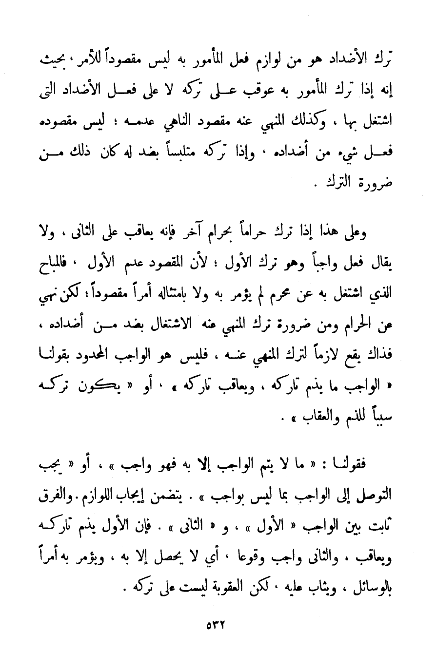 تَرْكُ الْأَضْدَادِ هُوَ مِنْ لَوَازِمَ فِعْلِ الْمَأْمُورِ بِهِ لَيْسَ مَقْصُودًا لِلْأَمْرِ بِحَيْثُ إنَّهُ إذَا تَرَكَ الْمَأْمُورَ بِهِ عُوقِبَ عَلَى تَرْكِهِ لَا عَلَى فِعْلِ الْأَضْدَادِ الَّتِي اشْتَغَلَ بِهَا وَكَذَلِكَ الْمَنْهِيُّ عَنْهُ مَقْصُودُ النَّاهِي عَدَمَهُ؛ لَيْسَ مَقْصُودُهُ فِعْلَ شَيْءٍ مِنْ أَضْدَادِهِ وَإِذَا تَرَكَهُ مُتَلَبِّسًا بِضِدِّ لَهُ كَانَ ذَلِكَ مِنْ ضَرُورَةِ التَّرْكِ. وَعَلَى هَذَا إذَا تَرَكَ حَرَامًا بِحَرَامِ آخَرَ فَإِنَّهُ يُعَاقَبُ عَلَى الثَّانِي وَلَا يُقَالُ فَعَلَ وَاجِبًا وَهُوَ تَرْكُ الْأَوَّلِ؛ لِأَنَّ الْمَقْصُودَ عَدَمُ الْأَوَّلِ، فَالْمُبَاحُ الَّذِي اشْتَغَلَ بِهِ عَنْ مُحَرَّمٍ لَمْ يُؤْمَرْ بِهِ وَلَا بِامْتِثَالِهِ أَمْرًا مَقْصُودًا؛ لَكِنْ نُهِيَ عَنْ الْحَرَامِ وَمِنْ ضَرُورَةِ تَرْكِ الْمَنْهِيِّ عَنْهُ الِاشْتِغَالُ بِضِدِّ مِنْ أَضْدَادِهِ فَذَاكَ يَقَعُ لَازِمًا لِتَرْكِ الْمَنْهِيِّ عَنْهُ فَلَيْسَ هُوَ الْوَاجِبُ الْمَحْدُودُ بِقَوْلِنَا " الْوَاجِبُ مَا يُذَمُّ تَارِكُهُ وَيُعَاقَبُ تَارِكُهُ " أَوْ " يَكُونُ تَرْكُهُ سَبَبًا لِلذَّمِّ وَالْعِقَابِ ". فَقَوْلُنَا: " مَا لَا يَتِمُّ الْوَاجِبُ إلَّا بِهِ فَهُوَ وَاجِبٌ " أَوْ " يَجِبُ التَّوَصُّلُ إلَى الْوَاجِبِ بِمَا لَيْسَ بِوَاجِبِ " يَتَضَمَّنُ إيجَابَ اللَّوَازِمِ. وَالْفَرْقُ ثَابِتٌ بَيْنَ الْوَاجِبِ " الْأَوَّلِ " وَ " الثَّانِي ". فَإِنَّ الْأَوَّلَ يُذَمُّ تَارِكُهُ وَيُعَاقَبُ، وَالثَّانِي وَاجِبٌ وُقُوعًا أَيْ لَا يَحْصُلُ إلَّا بِهِ وَيُؤْمَرُ بِهِ أَمْرًا بِالْوَسَائِلِ وَيُثَابُ عَلَيْهِ لَكِنْ الْعُقُوبَةُ لَيْسَتْ عَلَى تَرْكِهِ.