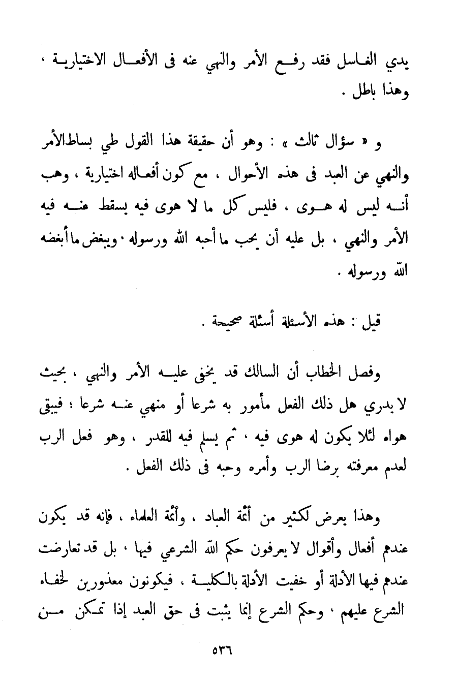 يَدَيْ الْغَاسِلِ - فَقَدْ رَفَعَ الْأَمْرَ وَالنَّهْيَ عَنْهُ فِي الْأَفْعَالِ الِاخْتِيَارِيَّةِ وَهَذَا بَاطِلٌ. وَ " سُؤَالٌ ثَالِثٌ ": وَهُوَ أَنَّ حَقِيقَةَ هَذَا الْقَوْلِ طَيُّ بِسَاطِ الْأَمْرِ وَالنَّهْيِ عَنْ الْعَبْدِ فِي هَذِهِ الْأَحْوَالِ مَعَ كَوْنِ أَفْعَالِهِ اخْتِيَارِيَّةً، وَهَبْ أَنَّهُ لَيْسَ لَهُ هَوَى فَلَيْسَ كُلُّ مَا لَا هَوَى فِيهِ يَسْقُطُ عَنْهُ فِيهِ الْأَمْرُ وَالنَّهْيُ بَلْ عَلَيْهِ أَنْ يُحِبَّ مَا أَحَبَّهُ اللَّهُ وَرَسُولُهُ وَيُبْغِضَ مَا أَبْغَضَهُ اللَّهُ وَرَسُولُهُ. قِيلَ: هَذِهِ الْأَسْئِلَةُ أَسْئِلَةٌ صَحِيحَةٌ. وَفَصْلُ الْخِطَابِ أَنَّ السَّالِكَ قَدْ يَخْفَى عَلَيْهِ الْأَمْرُ وَالنَّهْيُ بِحَيْثُ لَا يَدْرِي هَلْ ذَلِكَ الْفِعْلُ مَأْمُورٌ بِهِ شَرْعًا أَوْ مَنْهِيٌّ عَنْهُ شَرْعًا؛ فَيَبْقَى هَوَاهُ لِئَلَّا يَكُونَ لَهُ هَوَى فِيهِ ثُمَّ يُسَلِّمُ فِيهِ لِلْقَدَرِ، وَهُوَ فِعْلُ الرَّبِّ لِعَدَمِ مَعْرِفَتِهِ بِرِضَا الرَّبِّ وَأَمْرِهِ وَحُبِّهِ فِي ذَلِكَ الْفِعْلِ. وَهَذَا يَعْرِضُ لِكَثِيرِ مِنْ أَئِمَّةِ الْعُبَّادِ وَأَئِمَّةِ الْعُلَمَاءِ فَإِنَّهُ قَدْ يَكُونُ عِنْدَهُمْ أَفْعَالٌ وَأَقْوَالٌ لَا يَعْرِفُونَ حُكْمَ اللَّهِ الشَّرْعِيَّ فِيهَا بَلْ قَدْ تَعَارَضَتْ عِنْدَهُمْ فِيهَا الْأَدِلَّةُ أَوْ خَفِيَتْ الْأَدِلَّةُ بِالْكُلِّيَّةِ فَيَكُونُونَ مَعْذُورِينَ لِخَفَاءِ الشَّرْعِ عَلَيْهِمْ وَحُكْمُ الشَّرْعِ إنَّمَا يَثْبُتُ فِي حَقِّ الْعَبْدِ إذَا تَمَكَّنَ مِنْ