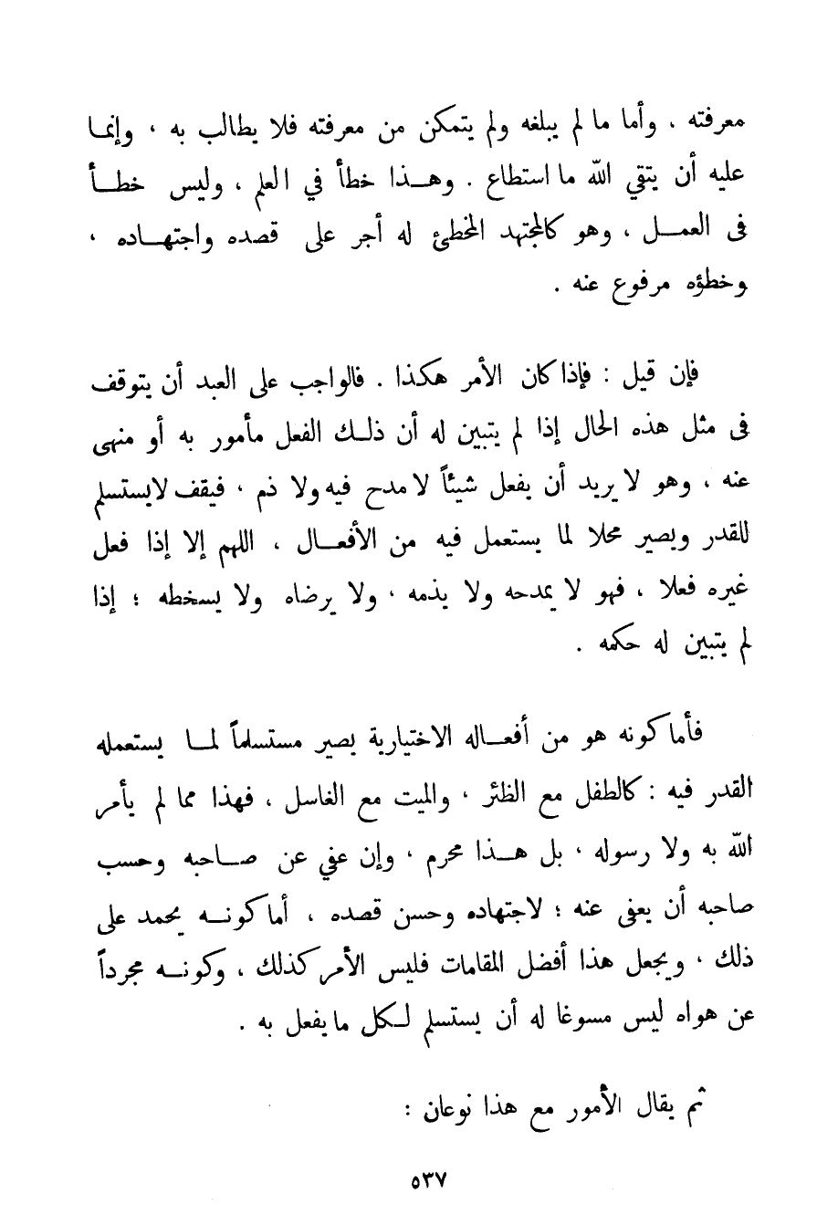 مَعْرِفَتِهِ وَأَمَّا مَا لَمْ يَبْلُغْهُ وَلَمْ يَتَمَكَّنْ مِنْ مَعْرِفَتِهِ فَلَا يُطَالَبُ بِهِ وَإِنَّمَا عَلَيْهِ أَنْ يَتَّقِيَ اللَّهَ مَا اسْتَطَاعَ. وَهَذَا خَطَأٌ فِي الْعِلْمِ وَلَيْسَ خَطَأً فِي الْعَمَلِ وَهُوَ كَالْمُجْتَهِدِ الْمُخْطِئِ لَهُ أَجْرٌ عَلَى قَصْدِهِ وَاجْتِهَادِهِ، وَخَطَؤُهُ مَرْفُوعٌ عَنْهُ. فَإِنْ قِيلَ: فَإِذَا كَانَ الْأَمْرُ هَكَذَا. فَالْوَاجِبُ عَلَى الْعَبْدِ أَنَّ يَتَوَقَّفَ فِي مِثْلِ هَذِهِ الْحَالِ إذَا لَمْ يَتَبَيَّنْ لَهُ أَنَّ ذَلِكَ الْفِعْلَ مَأْمُورٌ بِهِ أَوْ مَنْهِيٌّ عَنْهُ وَهُوَ لَا يُرِيدُ أَنْ يَفْعَلَ شَيْئًا لَا مَدْحَ فِيهِ وَلَا ذَمَّ فَيَقِفُ لَا يَسْتَسْلِمُ لِلْقَدَرِ وَيَصِيرُ مَحَلًّا لِمَا يُسْتَعْمَلُ فِيهِ مِنْ الْأَفْعَالِ اللَّهُمَّ إلَّا إذَا فَعَلَ غَيْرُهُ فِعْلًا فَهُوَ لَا يَمْدَحُهُ وَلَا يَذُمُّهُ وَلَا يَرْضَاهُ وَلَا يَسْخَطُهُ؛ إذَا لَمْ يَتَبَيَّنْ لَهُ حُكْمُهُ. فَأَمَّا كَوْنُهُ هُوَ مِنْ أَفْعَالِهِ الِاخْتِيَارِيَّةِ يَصِيرُ مُسْتَسْلِمًا لِمَا يَسْتَعْمِلُهُ الْقَدَرُ فِيهِ: كَالطِّفْلِ مَعَ الظِّئْرِ وَالْمَيِّتِ مَعَ الْغَاسِلِ فَهَذَا مِمَّا لَمْ يَأْمُرْ اللَّهُ بِهِ وَلَا رَسُولُهُ بَلْ هَذَا مُحَرَّمٌ، وَإِنْ عفى عَنْ صَاحِبِهِ وَحَسْبُ صَاحِبِهِ أَنْ يعفي عَنْهُ؛ لِاجْتِهَادِهِ وَحُسْنِ قَصْدِهِ أَمَّا كَوْنُهُ يُحْمَدُ عَلَى ذَلِكَ وَيَجْعَلُ هَذَا أَفْضَلَ الْمَقَامَاتِ فَلَيْسَ الْأَمْرُ كَذَلِكَ، وَكَوْنُهُ مُجَرَّدًا عَنْ هَوَاهُ لَيْسَ مُسَوَّغًا لَهُ أَنْ يَسْتَسْلِمَ لِكُلِّ مَا يُفْعَلُ بِهِ. ثُمَّ يُقَالُ الْأُمُورُ مَعَ هَذَا نَوْعَانِ: