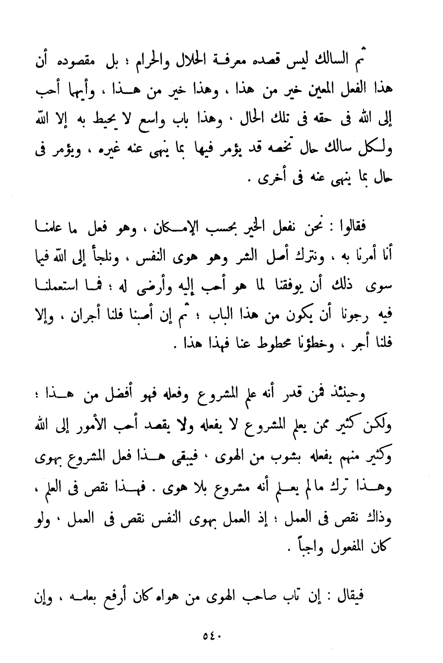 ثُمَّ السَّالِكُ لَيْسَ قَصْدُهُ مَعْرِفَةَ الْحَلَالِ وَالْحَرَامِ؛ بَلْ مَقْصُودُهُ أَنَّ هَذَا الْفِعْلَ الْمُعَيَّنَ خَيْرٌ مِنْ هَذَا وَهَذَا خَيْرٌ مِنْ هَذَا وَأَيُّهُمَا أَحَبُّ إلَى اللَّهِ فِي حَقِّهِ فِي تِلْكَ الْحَالِ وَهَذَا بَابٌ وَاسِعٌ لَا يُحِيطُ بِهِ إلَّا اللَّهُ وَلِكُلِّ سَالِكٍ حَالٌ تَخُصُّهُ قَدْ يُؤْمَرُ فِيهَا بِمَا يَنْهَى عَنْهُ غَيْرَهُ وَيُؤْمَرُ فِي حَالٍ بِمَا يَنْهَى عَنْهُ فِي أُخْرَى. فَقَالُوا: نَحْنُ نَفْعَلُ الْخَيْرَ بِحَسَبِ الْإِمْكَانِ وَهُوَ فِعْلُ مَا عَلِمْنَا أَنَّا أُمِرْنَا بِهِ وَنَتْرُكُ أَصْلَ الشَّرِّ وَهُوَ هَوَى النَّفْسِ وَنَلْجَأُ إلَى اللَّهِ فِيمَا سِوَى ذَلِكَ أَنْ يُوَفِّقَنَا لِمَا هُوَ أَحَبّ إلَيْهِ وَأَرْضَى لَهُ؛ فَمَا اسْتَعْمَلْنَا فِيهِ رَجَوْنَا أَنَّ يَكُونَ مِنْ هَذَا الْبَابِ؛ ثُمَّ إنْ أَصَبْنَا فَلَنَا أَجْرَانِ وَإِلَّا فَلَنَا أَجْرٌ وَخَطَؤُنَا مَحْطُوطٌ عَنَّا فَهَذَا هَذَا. وَحِينَئِذٍ فَمَنْ قَدَّرَ أَنَّهُ عَلِمَ الْمَشْرُوعَ وَفَعَلَهُ فَهُوَ أَفْضَلُ مِنْ هَذَا؛ وَلَكِنْ كَثِيرٌ مِمَّنْ يَعْلَمُ الْمَشْرُوعَ لَا يَفْعَلُهُ وَلَا يَقْصِدُ أَحَبّ الْأُمُورِ إلَى اللَّهِ، وَكَثِيرٌ مِنْهُمْ يَفْعَلُهُ بِشَوْبِ مِنْ الْهَوَى فَيَبْقَى، هَذَا فَعَلَ الْمَشْرُوعَ بِهَوَى، وَهَذَا تَرَكَ مَا لَمْ يَعْلَمْ أَنَّهُ مَشْرُوعٌ بِلَا هَوَى. فَهَذَا نَقْصٌ فِي الْعِلْمِ، وَذَاكَ نَقْصٌ فِي الْعَمَلِ؛ إذْ الْعَمَلُ بِهَوَى النَّفْسِ نَقْصٌ فِي الْعَمَلِ وَلَوْ كَانَ الْمَفْعُولُ وَاجِبًا. فَيُقَالُ: إنْ تَابَ صَاحِبُ الْهَوَى مِنْ هَوَاهُ كَانَ أَرْفَعَ بِعِلْمِهِ وَإِنْ
