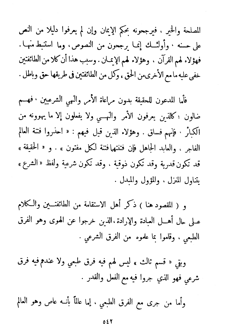 وَالْمَقْصُودُ هُنَا ذِكْرُ أَهْلِ الِاسْتِقَامَةِ مِنْ الطَّائِفَتَيْنِ، وَالْكَلَامُ عَلَى حَالِ أَهْل الْعِبَادَةِ وَالْإِرَادَةِ الَّذِينَ خَرَجُوا عَنْ الْهَوَى وَهُوَ الْفَرْقُ الطَّبْعِيُّ وَقَامُوا بِمَا عَلِمُوهُ مِنْ الْفَرْقِ الشَّرْعِيِّ. وَبَقِيَ " قِسْمٌ ثَالِثٌ " لَيْسَ لَهُمْ فِيهِ فَرْقٌ طَبْعِيٌّ وَلَا عِنْدَهُمْ فِيهِ فَرْقٌ شَرْعِيٌّ فَهُوَ الَّذِي جَرَوْا فِيهِ مَعَ الْفِعْلِ وَالْقَدَرِ. وَأَمَّا مَنْ جَرَى مَعَ الْفَرْقِ الطَّبْعِيِّ إمَّا عَالِمًا بِأَنَّهُ عَاصٍ وَهُوَ الْعَالِمُ