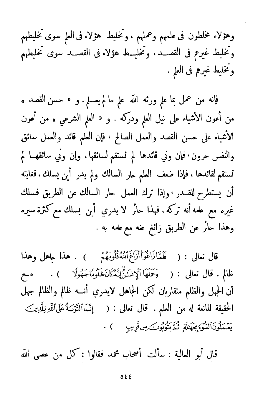 وَهَؤُلَاءِ مخلطون فِي عِلْمِهِمْ وَعَمَلِهِمْ وَتَخْلِيطُ هَؤُلَاءِ فِي الْعِلْمِ سِوَى تَخْلِيطِهِمْ وَتَخْلِيطِ غَيْرِهِمْ فِي الْقَصْدِ، وَتَخْلِيطُ هَؤُلَاءِ فِي الْقَصْدِ سِوَى تَخْلِيطِهِمْ وَتَخْلِيطِ غَيْرِهِمْ فِي الْعِلْمِ فَإِنَّهُ مَنْ عَمِلَ بِمَا عَلِمَ وَرَّثَهُ اللَّهُ عِلْمَ مَا لَمْ يَعْلَمْ. وَ " حُسْنُ الْقَصْدِ " مِنْ أَعْوَنِ الْأَشْيَاءِ عَلَى نَيْلِ الْعِلْمِ وَدَرْكِهِ. وَ " الْعِلْمُ الشَّرْعِيُّ " مِنْ أَعْوَنِ الْأَشْيَاءِ عَلَى حُسْنِ الْقَصْدِ وَالْعَمَلِ الصَّالِحِ فَإِنَّ الْعِلْمَ قَائِدٌ وَالْعَمَلَ سَائِقٌ، وَالنَّفْسَ حَرُونٌ فَإِنْ وَنَى قَائِدُهَا لَمْ تَسْتَقِمْ لِسَائِقِهَا وَإِنْ وَنَى سَائِقُهَا لَمْ تَسْتَقِمْ لِقَائِدِهَا فَإِذَا ضَعُفَ الْعِلْمُ حَارَ السَّالِكُ وَلَمْ يَدْرِ أَيْنَ يَسْلُكُ فَغَايَتُهُ أَنْ يستطرح لِلْقَدَرِ وَإِذَا تَرَكَ الْعَمَلَ حَارَ السَّالِكُ عَنْ الطَّرِيقِ فَسَلَكَ غَيْرَهُ مَعَ عِلْمِهِ أَنَّهُ تَرَكَهُ فَهَذَا حَائِرٌ لَا يَدْرِي أَيْنَ يَسْلُكُ مَعَ كَثْرَةِ سَيْرِهِ وَهَذَا حَائِرٌ عَنْ الطَّرِيقِ زَائِغٌ عَنْهُ مَعَ عِلْمِهِ بِهِ. قَالَ تَعَالَى: {فَلَمَّا زَاغُوا أَزَاغَ اللَّهُ قُلُوبَهُمْ} . هَذَا جَاهِلٌ وَهَذَا ظَالِمٌ. قَالَ تَعَالَى: {وَحَمَلَهَا الْإِنْسَانُ إنَّهُ كَانَ ظَلُومًا جَهُولًا} . مَعَ أَنَّ الْجَهْلَ وَالظُّلْمَ مُتَقَارِبَانِ لَكِنَّ الْجَاهِلَ لَا يَدْرِي أَنَّهُ ظَالِمٌ وَالظَّالِمُ جَهِلَ الْحَقِيقَةَ الْمَانِعَةَ لَهُ مِنْ الْعِلْمِ. قَالَ تَعَالَى {إنَّمَا التَّوْبَةُ عَلَى اللَّهِ لِلَّذِينَ يَعْمَلُونَ السُّوءَ بِجَهَالَةٍ ثُمَّ يَتُوبُونَ مِنْ قَرِيبٍ} قَالَ أَبُو الْعَالِيَةِ: سَأَلْت أَصْحَابَ مُحَمَّدٍ فَقَالُوا: كُلُّ مَنْ عَصَى اللَّهَ