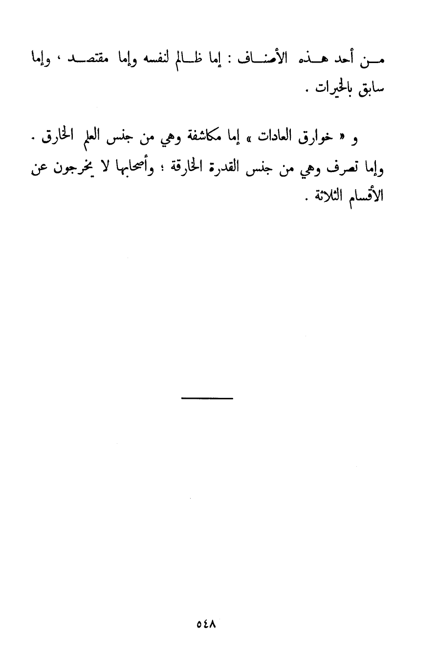 مِنْ أَحَدِ هَذِهِ الْأَصْنَافِ: إمَّا ظَالِمٌ لِنَفْسِهِ وَإِمَّا مُقْتَصِدٌ وَإِمَّا سَابِقٌ بِالْخَيِّرَاتِ. وَ " خَوَارِقُ الْعَادَاتِ " إمَّا مُكَاشَفَةٌ وَهِيَ مِنْ جِنْسِ الْعِلْمِ الْخَارِقِ وَإِمَّا تَصَرُّفٌ وَهِيَ مِنْ جِنْسِ الْقُدْرَةِ الْخَارِقَةِ؛ وَأَصْحَابُهَا لَا يَخْرُجُونَ عَنْ الْأَقْسَامِ الثَّلَاثَةِ.