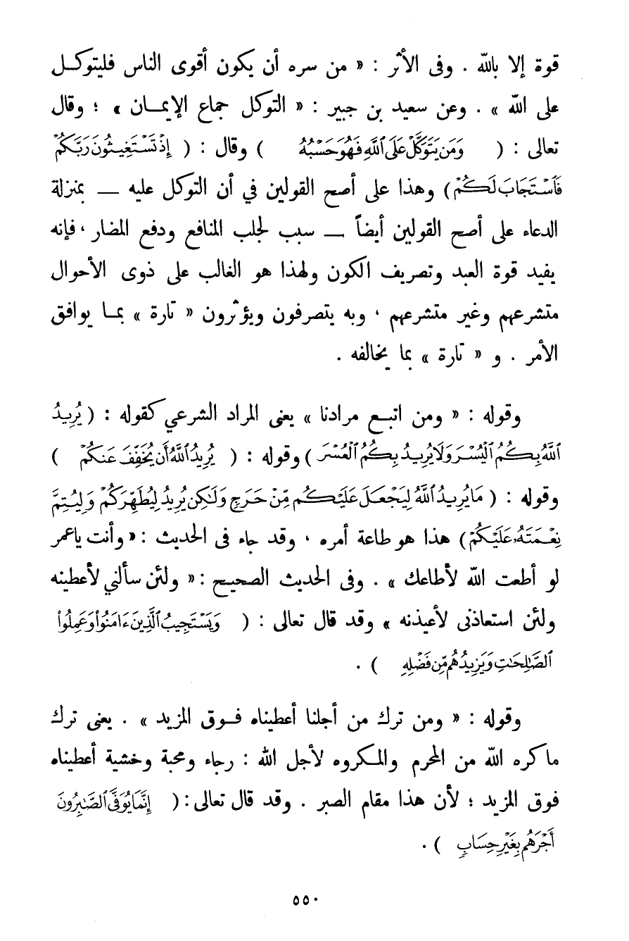 قُوَّةَ إلَّا بِاَللَّهِ. وَفِي الْأَثَرِ: " {مَنْ سَرَّهُ أَنْ يَكُونَ أَقْوَى النَّاسِ فَلْيَتَوَكَّلْ عَلَى اللَّهِ} ". وَعَنْ سَعِيدِ بْنِ جُبَيْرٍ: " التَّوَكُّلُ جِمَاعُ الْإِيمَانِ " وَقَالَ تَعَالَى: {وَمَنْ يَتَوَكَّلْ عَلَى اللَّهِ فَهُوَ حَسْبُهُ} وَقَالَ: {إذْ تَسْتَغِيثُونَ رَبَّكُمْ فَاسْتَجَابَ لَكُمْ} وَهَذَا عَلَى أَصَحِّ الْقَوْلَيْنِ فِي أَنَّ التَّوَكُّلَ عَلَيْهِ - بِمَنْزِلَةِ الدُّعَاءِ عَلَى أَصَحِّ الْقَوْلَيْنِ أَيْضًا - سَبَبٌ لِجَلْبِ الْمَنَافِعِ وَدَفْعِ الْمَضَارِّ فَإِنَّهُ يُفِيدُ قُوَّةَ الْعَبْدِ وَتَصْرِيفَ الْكَوْنِ وَلِهَذَا هُوَ الْغَالِبُ عَلَى ذَوِي الْأَحْوَالِ متشرعهم وَغَيْرِ متشرعهم وَبِهِ يَتَصَرَّفُونَ وَيُؤْثِرُونَ " تَارَةً " بِمَا يُوَافِقُ الْأَمْرَ. و " تَارَةً " بِمَا يُخَالِفُهُ. وَقَوْلُهُ: " وَمَنْ اتَّبَعَ مُرَادَنَا " يَعْنِي الْمُرَادَ الشَّرْعِيَّ كَقَوْلِهِ: {يُرِيدُ اللَّهُ بِكُمُ الْيُسْرَ وَلَا يُرِيدُ بِكُمُ الْعُسْرَ} وَقَوْلِهِ: {يُرِيدُ اللَّهُ أَنْ يُخَفِّفَ عَنْكُمْ} وَقَوْلِهِ: {مَا يُرِيدُ اللَّهُ لِيَجْعَلَ عَلَيْكُمْ مِنْ حَرَجٍ وَلَكِنْ يُرِيدُ لِيُطَهِّرَكُمْ وَلِيُتِمَّ نِعْمَتَهُ عَلَيْكُمْ} هَذَا هُوَ طَاعَةُ أَمْرِهِ وَقَدْ جَاءَ فِي الْحَدِيثِ: " {وَأَنْتَ يَا عُمَرُ لَوْ أَطَعْت اللَّهَ لَأَطَاعَك} ". وَفِي الْحَدِيثِ الصَّحِيحِ: " {وَلَئِنْ سَأَلَنِي لَأُعْطِيَنَّهُ وَلَئِنْ اسْتَعَاذَنِي لَأُعِيذَنَّهُ} " وَقَدْ قَالَ تَعَالَى: {وَيَسْتَجِيبُ الَّذِينَ آمَنُوا وَعَمِلُوا الصَّالِحَاتِ وَيَزِيدُهُمْ مِنْ فَضْلِهِ} . وَقَوْلُهُ: " وَمَنْ تَرَكَ مِنْ أَجْلِنَا أَعْطَيْنَا فَوْقَ الْمَزِيدِ " يَعْنِي تَرَكَ مَا كَرِهَ اللَّهُ مِنْ الْمُحَرَّمِ وَالْمَكْرُوهِ لِأَجْلِ اللَّهِ: رَجَاءً وَمَحَبَّةً وَخَشْيَةً أَعْطَيْنَاهُ. فَوْقَ الْمَزِيدِ؛ لِأَنَّ هَذَا مَقَامَ الصَّبْرِ. وَقَدْ قَالَ تَعَالَى: {إنَّمَا يُوَفَّى الصَّابِرُونَ أَجْرَهُمْ بِغَيْرِ حِسَابٍ} .