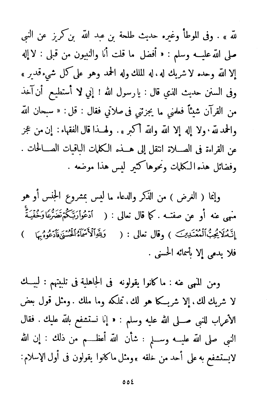 لِلَّهِ} . وَفِي الْمُوَطَّأِ وَغَيْرِهِ حَدِيثُ طَلْحَةَ بْنِ عَبْدِ اللَّهِ بْنِ كَرِيزٍ عَنْ النَّبِيِّ صَلَّى اللَّهُ عَلَيْهِ وَسَلَّمَ {أَفْضَلُ مَا قُلْت أَنَا وَالنَّبِيُّونَ مِنْ قَبْلِي: لَا إلَهَ إلَّا اللَّهُ وَحْدَهُ لَا شَرِيكَ لَهُ، لَهُ الْمُلْكُ وَلَهُ الْحَمْدُ وَهُوَ عَلَى كُلِّ شَيْءٍ قَدِيرٌ} وَفِي السُّنَنِ {حَدِيثُ الَّذِي قَالَ: يَا رَسُولَ اللَّهِ إنِّي لَا أَسْتَطِيعُ أَنْ آخُذَ مِنْ الْقُرْآنِ شَيْئًا فَعَلِّمْنِي مَا يُجْزِئُنِي فِي صَلَاتِي فَقَالَ: قُلْ: سُبْحَانَ اللَّهِ وَالْحَمْدُ لِلَّهِ وَلَا إلَهَ إلَّا اللَّهُ وَاَللَّهُ أَكْبَرُ} . وَلِهَذَا قَالَ الْفُقَهَاءُ: إنَّ مَنْ عَجَزَ عَنْ الْقِرَاءَةِ فِي الصَّلَاةِ انْتَقَلَ إلَى هَذِهِ الْكَلِمَاتِ الْبَاقِيَاتِ الصَّالِحَاتِ. وَفَضَائِلُ هَذِهِ الْكَلِمَاتِ وَنَحْوُهَا كَثِيرٌ لَيْسَ هَذَا مَوْضِعَهُ. وَإِنَّمَا الْغَرَضُ مِنْ الذِّكْرِ وَالدُّعَاءِ مَا لَيْسَ بِمَشْرُوعِ الْجِنْسِ أَوْ هُوَ مَنْهِيٌّ عَنْهُ أَوْ عَنْ صِفَتِهِ. كَمَا قَالَ تَعَالَى: {ادْعُوا رَبَّكُمْ تَضَرُّعًا وَخُفْيَةً إنَّهُ لَا يُحِبُّ الْمُعْتَدِينَ} وَقَالَ تَعَالَى: {وَلِلَّهِ الْأَسْمَاءُ الْحُسْنَى فَادْعُوهُ بِهَا} فَلَا يُدْعَى إلَّا بِأَسْمَائِهِ الْحُسْنَى. وَمِنْ الْمَنْهِيِّ عَنْهُ: مَا كَانُوا يَقُولُونَهُ فِي الْجَاهِلِيَّةِ فِي تَلْبِيَتِهِمْ: لَبَّيْكَ لَا شَرِيكَ لَك إلَّا شَرِيكًا هُوَ لَك تَمْلِكُهُ وَمَا مَلَكَ. وَمِثْلَ {قَوْلِ بَعْضِ الْأَعْرَابِ لِلنَّبِيِّ صَلَّى اللَّهُ عَلَيْهِ وَسَلَّمَ إنَّا نَسْتَشْفِعُ بِاَللَّهِ عَلَيْك. فَقَالَ النَّبِيُّ صَلَّى اللَّهُ عَلَيْهِ وَسَلَّمَ شَأْنُ اللَّهِ أَعْظَمُ مِنْ ذَلِكَ: إنَّ اللَّهَ لا يَسْتَشْفِعُ به على أحد من خلقه} وَمِثْلَ مَا كَانُوا يَقُولُونَ فِي أَوَّلِ الْإِسْلَامِ: