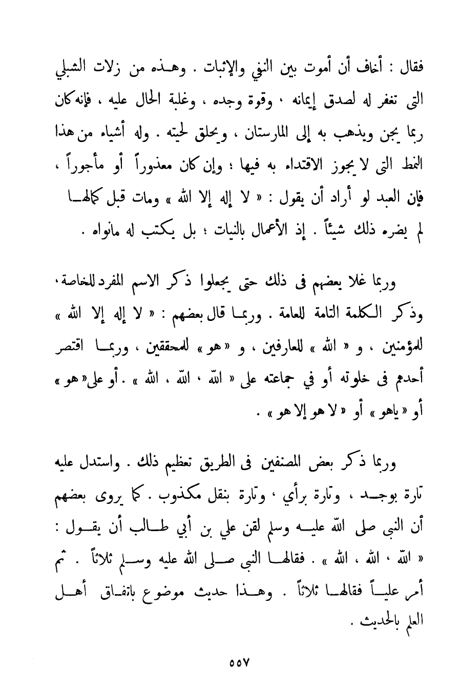فَقَالَ: أَخَافُ أَنْ أَمُوتَ بَيْنَ النَّفْيِ وَالْإِثْبَاتِ. وَهَذِهِ مِنْ زَلَّاتِ الشِّبْلِيِّ الَّتِي تُغْفَرُ لَهُ لِصِدْقِ إيمَانِهِ وَقُوَّةِ وَجْدِهِ وَغَلَبَةِ الْحَالِ عَلَيْهِ فَإِنَّهُ كَانَ رُبَّمَا يُجَنُّ وَيُذْهَبُ بِهِ إلَى الْمَارَسْتَانِ وَيَحْلِقُ لِحْيَتَهُ. وَلَهُ أَشْيَاءُ مِنْ هَذَا النَّمَطِ الَّتِي لَا يَجُوزُ الِاقْتِدَاءُ بِهِ فِيهَا؛ وَإِنْ كَانَ مَعْذُورًا أَوْ مَأْجُورًا فَإِنَّ الْعَبْدَ لَوْ أَرَادَ أَنْ يَقُولَ: " لَا إلَهَ إلَّا اللَّهُ " وَمَاتَ قَبْلَ كَمَالِهَا لَمْ يَضُرّهُ ذَلِكَ شَيْئًا. إذْ الْأَعْمَالُ بِالنِّيَّاتِ؛ بَلْ يُكْتَبُ لَهُ مَا نَوَاهُ. وَرُبَّمَا غَلَا بَعْضُهُمْ فِي ذَلِكَ حَتَّى يَجْعَلُوا ذِكْرَ الِاسْمِ الْمُفْرَدِ لِلْخَاصَّةِ وَذِكْرَ الْكَلِمَةِ التَّامَّةِ لِلْعَامَّةِ. وَرُبَّمَا قَالَ بَعْضُهُمْ: " لَا إلَهَ إلَّا اللَّهُ " لِلْمُؤْمِنِينَ و " اللَّهُ " لِلْعَارِفِينَ و " هُوَ " لِلْمُحَقِّقِينَ وَرُبَّمَا اقْتَصَرَ أَحَدُهُمْ فِي خَلْوَتِهِ أَوْ فِي جَمَاعَتِهِ عَلَى " اللَّهُ اللَّهُ اللَّهُ " أَوْ عَلَى " هُوَ " أَوْ " يَا هُوَ " أَوْ " لَا هُوَ إلَّا هُوَ ". وَرُبَّمَا ذَكَرَ بَعْضُ الْمُصَنِّفِينَ فِي الطَّرِيقِ تَعْظِيمَ ذَلِكَ. وَاسْتَدَلَّ عَلَيْهِ تَارَةً بِوَجْدِ وَتَارَةً بِرَأْيٍ وَتَارَةً بِنَقْلِ مَكْذُوبٍ. كَمَا يَرْوِي بَعْضُهُمْ {أَنَّ النَّبِيَّ صَلَّى اللَّهُ عَلَيْهِ وَسَلَّمَ لَقَّنَ عَلِيَّ بْنَ أَبِي طَالِبٍ أَنْ يَقُولَ: اللَّهُ اللَّهُ اللَّهُ} . فَقَالَهَا النَّبِيُّ صَلَّى اللَّهُ عَلَيْهِ وَسَلَّمَ ثَلَاثًا. ثُمَّ أَمَرَ عَلِيًّا فَقَالَهَا ثَلَاثًا. وَهَذَا حَدِيثٌ مَوْضُوعٌ بِاتِّفَاقِ أَهْلِ الْعِلْمِ بِالْحَدِيثِ.