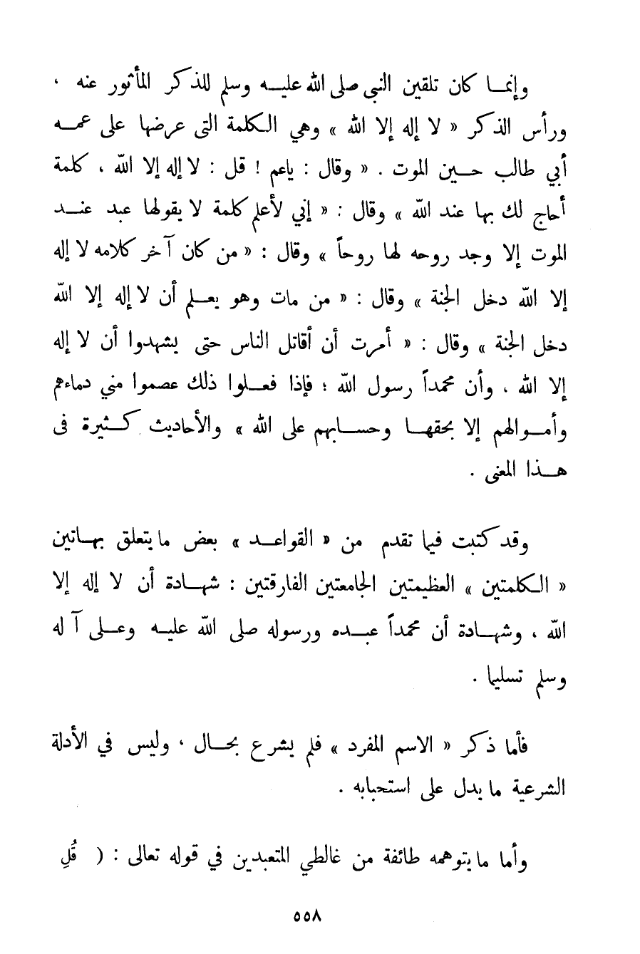 وَإِنَّمَا كَانَ تَلْقِينُ النَّبِيِّ صَلَّى اللَّهُ عَلَيْهِ وَسَلَّمَ لِلذِّكْرِ الْمَأْثُورِ عَنْهُ وَرَأْسُ الذِّكْرِ " لَا إلَهَ إلَّا اللَّهُ " وَهِيَ الْكَلِمَةُ الَّتِي عَرَضَهَا عَلَى عَمِّهِ أَبِي طَالِبٍ حِينَ الْمَوْتِ. {وَقَالَ: يَا عَمِّ قُلْ: لَا إلَهَ إلَّا اللَّهُ كَلِمَةً أُحَاجُّ لَك بِهَا عِنْدَ اللَّهِ} وَقَالَ: {إنِّي لَأَعْلَمُ كَلِمَةً لَا يَقُولُهَا عَبْدٌ عِنْدَ الْمَوْتِ إلَّا وَجَدَ رُوحَهُ لَهَا رُوحًا} وَقَالَ: {مَنْ كَانَ آخِرُ كَلَامِهِ لَا إلَهَ إلَّا اللَّهُ دَخَلَ الْجَنَّةَ} وَقَالَ: {مَنْ مَاتَ وَهُوَ يَعْلَمُ أَنْ لَا إلَهَ إلَّا اللَّهُ دَخَلَ الْجَنَّةَ} وَقَالَ: {أُمِرْت أَنْ أُقَاتِلَ النَّاسَ حَتَّى يَشْهَدُوا أَنْ لَا إلَهَ إلَّا اللَّهُ وَأَنَّ مُحَمَّدًا رَسُولُ اللَّهِ؛ فَإِذَا فَعَلُوا ذَلِكَ عَصَمُوا مِنِّي دِمَاءَهُمْ وَأَمْوَالَهُمْ إلَّا بِحَقِّهَا وَحِسَابُهُمْ عَلَى اللَّهِ} وَالْأَحَادِيثُ كَثِيرَةٌ فِي هَذَا الْمَعْنَى. وَقَدْ كَتَبْت فِيمَا تَقَدَّمَ مِنْ " الْقَوَاعِدِ " بَعْضَ مَا يَتَعَلَّقُ بِهَاتَيْنِ " الْكَلِمَتَيْنِ " الْعَظِيمَتَيْنِ الْجَامِعَتَيْنِ الْفَارِقَتَيْنِ: شَهَادَةِ أَنْ لَا إلَهَ إلَّا اللَّهُ، وَشَهَادَةِ أَنَّ مُحَمَّدًا عَبْدُهُ وَرَسُولُهُ صَلَّى اللَّهُ عَلَيْهِ وَعَلَى آلِهِ وَسَلَّمَ تَسْلِيمًا. فَأَمَّا ذِكْرُ " الِاسْمِ الْمُفْرَدِ " فَلَمْ يُشْرَعْ بِحَالِ وَلَيْسَ فِي الْأَدِلَّةِ الشَّرْعِيَّةِ مَا يَدُلُّ عَلَى اسْتِحْبَابِهِ. وَأَمَّا مَا يَتَوَهَّمُهُ طَائِفَة مِنْ غَالِطِي الْمُتَعَبِّدِينَ فِي قَوْله تَعَالَى {قُلِ