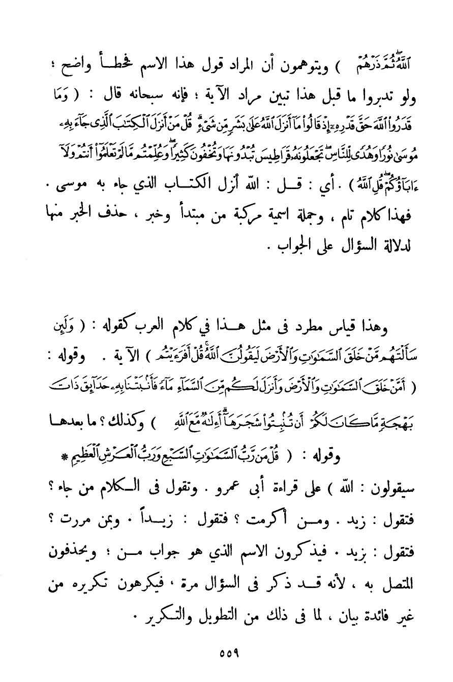اللَّهُ ثُمَّ ذَرْهُمْ} وَيَتَوَهَّمُونَ أَنَّ الْمُرَادَ قَوْلُ هَذَا الِاسْمِ فَخَطَأٌ وَاضِحٌ؛ وَلَوْ تَدَبَّرُوا مَا قَبْلَ هَذَا تَبَيَّنَ مُرَادُ الْآيَةِ؛ فَإِنَّهُ سُبْحَانَهُ قَالَ: {وَمَا قَدَرُوا اللَّهَ حَقَّ قَدْرِهِ إذْ قَالُوا مَا أَنْزَلَ اللَّهُ عَلَى بَشَرٍ مِنْ شَيْءٍ قُلْ مَنْ أَنْزَلَ الْكِتَابَ الَّذِي جَاءَ بِهِ مُوسَى نُورًا وَهُدًى لِلنَّاسِ تَجْعَلُونَهُ قَرَاطِيسَ تُبْدُونَهَا وَتُخْفُونَ كَثِيرًا وَعُلِّمْتُمْ مَا لَمْ تَعْلَمُوا أَنْتُمْ وَلَا آبَاؤُكُمْ قُلِ اللَّهُ} . أَيْ: قُلْ: اللَّهُ أَنْزَلَ الْكِتَابَ الَّذِي جَاءَ بِهِ مُوسَى. فَهَذَا كَلَامٌ تَامٌّ وَجُمْلَةٌ اسْمِيَّةٌ مُرَكَّبَةٌ مِنْ مُبْتَدَأٍ وَخَبَرٍ حُذِفَ الْخَبَرُ مِنْهَا لِدَلَالَةِ السُّؤَالِ عَلَى الْجَوَابِ. وَهَذَا قِيَاسٌ مُطَّرِدٌ فِي مِثْلِ هَذَا فِي كَلَامِ الْعَرَبِ كَقَوْلِهِ: {وَلَئِنْ سَأَلْتَهُمْ مَنْ خَلَقَ السَّمَاوَاتِ وَالْأَرْضَ لَيَقُولُنَّ اللَّهُ قُلْ أَفَرَأَيْتُمْ} الْآيَةُ. وَقَوْلُهُ: {أَمَّنْ خَلَقَ السَّمَاوَاتِ وَالْأَرْضَ وَأَنْزَلَ لَكُمْ مِنَ السَّمَاءِ مَاءً فَأَنْبَتْنَا بِهِ حَدَائِقَ ذَاتَ بَهْجَةٍ مَا كَانَ لَكُمْ أَنْ تُنْبِتُوا شَجَرَهَا أَإِلَهٌ مَعَ اللَّهِ} وَكَذَلِكَ؟ مَا بَعْدَهَا وَقَوْلُهُ: {قُلْ مَنْ رَبُّ السَّمَوَاتِ السَّبْعِ وَرَبُّ الْعَرْشِ الْعَظِيمِ سَيَقُولُونَ اللَّهُ} عَلَى قِرَاءَةِ أَبِي عَمْرٍو. وَتَقُولُ فِي الْكَلَامِ مَنْ جَاءَ؟ فَتَقُولُ: زَيْدٌ. وَمَنْ أَكَرَمْت؟ فَتَقُولُ: زَيْدًا. وَبِمَنْ مَرَرْت؟ فَتَقُولُ: بِزَيْدِ. فَيَذْكُرُونَ الِاسْمَ الَّذِي هُوَ جَوَابُ مَنْ؛ وَيَحْذِفُونَ الْمُتَّصِلَ بِهِ لِأَنَّهُ قَدْ ذُكِرَ فِي السُّؤَالِ مَرَّةً فَيَكْرَهُونَ تَكْرِيرَهُ مِنْ غَيْرِ فَائِدَةِ بَيَانٍ لِمَا فِي ذَلِكَ مِنْ التَّطْوِيلِ وَالتَّكْرِيرِ.