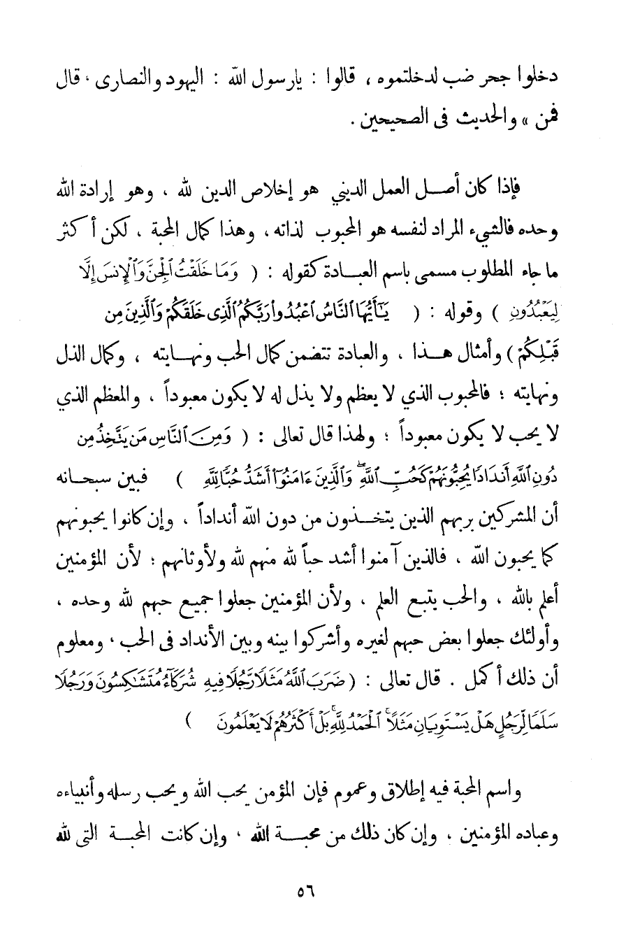 دَخَلُوا جُحْرَ ضَبٍّ لَدَخَلْتُمُوهُ قَالُوا: يَا رَسُولَ اللَّهِ: الْيَهُودُ وَالنَّصَارَى قَالَ فَمَنْ} وَالْحَدِيثُ فِي الصَّحِيحَيْنِ. فَإِذَا كَانَ أَصْلُ الْعَمَلِ الدِّينِيِّ هُوَ إخْلَاصَ الدِّينِ لِلَّهِ وَهُوَ إرَادَةَ اللَّهِ وَحْدَهُ فَالشَّيْءُ الْمُرَادُ لِنَفْسِهِ هُوَ الْمَحْبُوبُ لِذَاتِهِ وَهَذَا كَمَالُ الْمَحَبَّةِ لَكِنَّ أَكْثَرَ مَا جَاءَ الْمَطْلُوبُ مُسَمًّى بِاسْمِ الْعِبَادَةِ كَقَوْلِهِ: {وَمَا خَلَقْتُ الْجِنَّ وَالْإِنْسَ إلَّا لِيَعْبُدُونِ} وَقَوْلُهُ: {يَا أَيُّهَا النَّاسُ اعْبُدُوا رَبَّكُمُ الَّذِي خَلَقَكُمْ وَالَّذِينَ مِنْ قَبْلِكُمْ} وَأَمْثَالُ هَذَا وَالْعِبَادَةُ تَتَضَمَّنُ كَمَالَ الْحُبِّ وَنِهَايَتَهُ وَكَمَالَ الذُّلِّ وَنِهَايَتَهُ؛ فَالْمَحْبُوبُ الَّذِي لَا يُعَظَّمُ وَلَا يُذَلُّ لَهُ لَا يَكُونُ مَعْبُودًا وَالْمُعَظَّمُ الَّذِي لَا يُحَبُّ لَا يَكُونُ مَعْبُودًا؛ وَلِهَذَا قَالَ تَعَالَى: {وَمِنَ النَّاسِ مَنْ يَتَّخِذُ مِنْ دُونِ اللَّهِ أَنْدَادًا يُحِبُّونَهُمْ كَحُبِّ اللَّهِ وَالَّذِينَ آمَنُوا أَشَدُّ حُبًّا لِلَّهِ} فَبَيَّنَ سُبْحَانَهُ أَنَّ الْمُشْرِكِينَ بِرَبِّهِمْ الَّذِينَ يَتَّخِذُونَ مِنْ دُونِ اللَّهِ أَنْدَادًا وَإِنْ كَانُوا يُحِبُّونَهُمْ كَمَا يُحِبُّونَ اللَّهَ فَاَلَّذِينَ آمَنُوا أَشَدُّ حُبًّا لِلَّهِ مِنْهُمْ لِلَّهِ وَلِأَوْثَانِهِمْ؛ لِأَنَّ الْمُؤْمِنِينَ أَعْلَمُ بِاَللَّهِ وَالْحُبُّ يَتْبَعُ الْعِلْمَ وَلِأَنَّ الْمُؤْمِنِينَ جَعَلُوا جَمِيعَ حُبِّهِمْ لِلَّهِ وَحْدَهُ وَأُولَئِكَ جَعَلُوا بَعْضَ حُبِّهِمْ لِغَيْرِهِ وَأَشْرَكُوا بَيْنَهُ وَبَيْنَ الْأَنْدَادِ فِي الْحُبِّ وَمَعْلُومٌ أَنَّ ذَلِكَ أَكْمَلُ. قَالَ تَعَالَى: {ضَرَبَ اللَّهُ مَثَلًا رَجُلًا فِيهِ شُرَكَاءُ مُتَشَاكِسُونَ وَرَجُلًا سَلَمًا لِرَجُلٍ هَلْ يَسْتَوِيَانِ مَثَلًا الْحَمْدُ لِلَّهِ بَلْ أَكْثَرُهُمْ لَا يَعْلَمُونَ} وَاسْمُ الْمَحَبَّةِ فِيهِ إطْلَاقٌ وَعُمُومٌ فَإِنَّ الْمُؤْمِنَ يُحِبُّ اللَّهَ وَيُحِبُّ رُسُلَهُ وَأَنْبِيَاءَهُ وَعِبَادَهُ الْمُؤْمِنِينَ وَإِنْ كَانَ ذَلِكَ مِنْ مَحَبَّةِ اللَّهِ وَإِنْ كَانَتْ الْمَحَبَّةُ الَّتِي لِلَّهِ