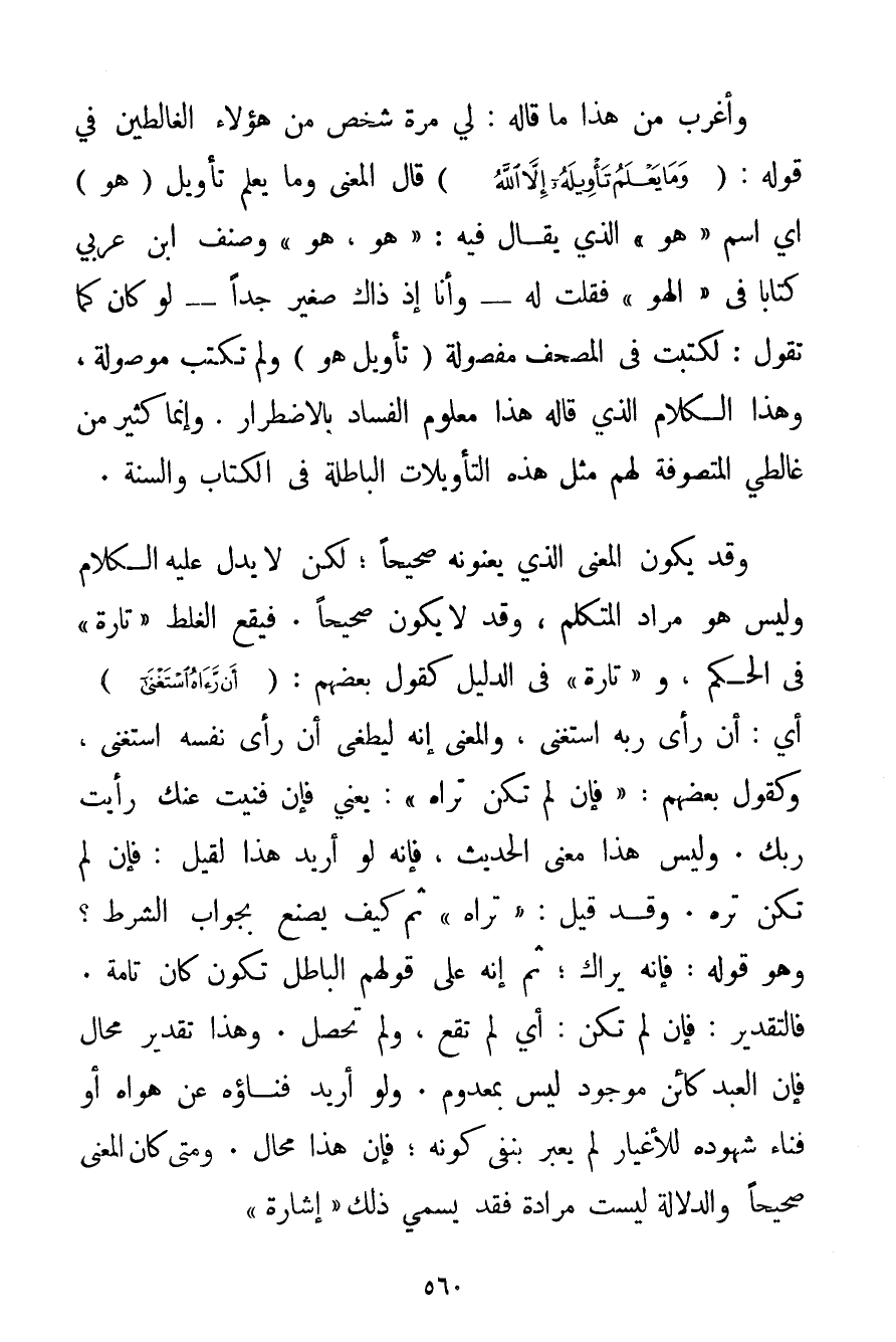 وَأَغْرَبُ مِنْ هَذَا مَا قَالَهُ: لِي مَرَّةً شَخْصٌ مِنْ هَؤُلَاءِ الغالطين فِي قَوْلِهِ: {وَمَا يَعْلَمُ تَأْوِيلَهُ إلَّا اللَّهُ} قَالَ الْمَعْنَى وَمَا يَعْلَمُ تَأْوِيلَ (هُوَ أَيْ اسْمُ " هُوَ " الَّذِي يُقَالُ فِيهِ: " هُوَ هُوَ " وَصَنَّفَ ابْنُ عَرَبِيٍّ كِتَابًا فِي " الهو " فَقُلْت لَهُ - وَأَنَا إذْ ذَاكَ صَغِيرٌ جِدًّا - لَوْ كَانَ كَمَا تَقُولُ: لَكُتِبَتْ فِي الْمُصْحَفِ مَفْصُولَةً تَأْوِيلُ هُوَ وَلَمْ تُكْتَبْ مَوْصُولَةً وَهَذَا الْكَلَامُ الَّذِي قَالَهُ هَذَا مَعْلُومُ الْفَسَادِ بِالِاضْطِرَارِ. وَإِنَّمَا كَثِيرٌ مِنْ غَالِطِي الْمُتَصَوِّفَةِ لَهُمْ مِثْلُ هَذِهِ التَّأْوِيلَاتِ الْبَاطِلَةِ فِي الْكِتَابِ وَالسُّنَّة. وَقَدْ يَكُونُ الْمَعْنَى الَّذِي يَعْنُونَهُ صَحِيحًا؛ لَكِنْ لَا يَدُلُّ عَلَيْهِ الْكَلَامُ وَلَيْسَ هُوَ مُرَادَ الْمُتَكَلِّمِ وَقَدْ لَا يَكُونُ صَحِيحًا. فَيَقَعَ الْغَلَطُ " تَارَةً " فِي الْحُكْمِ و " تَارَةً " فِي الدَّلِيلِ كَقَوْلِ بَعْضِهِمْ: {أَنْ رَآهُ اسْتَغْنَى} أَيْ: أَنْ رَأَى رَبَّهُ اسْتَغْنَى وَالْمَعْنَى إنَّهُ لَيَطْغَى أَنْ رَأَى نَفْسَهُ اسْتَغْنَى، وَكَقَوْلِ بَعْضِهِمْ: " فَإِنْ لَمْ تَكُنْ تَرَاهُ ": يَعْنِي فَإِنْ فَنِيَتْ عَنْك رَأَيْت رَبَّك. وَلَيْسَ هَذَا مَعْنَى الْحَدِيثِ فَإِنَّهُ لَوْ أُرِيدَ هَذَا لَقِيلَ: فَإِنْ لَمْ تَكُنْ تَرَهُ. وَقَدْ قِيلَ: " تَرَاهُ " ثُمَّ كَيْفَ يَصْنَعُ بِجَوَابِ الشَّرْطِ؟ وَهُوَ قَوْلُهُ: فَإِنَّهُ يَرَاك؛ ثُمَّ إنَّهُ عَلَى قَوْلِهِمْ الْبَاطِلِ تَكُونُ كَانَ تَامَّةً. فَالتَّقْدِيرُ: فَإِنْ لَمْ تَكُنْ: أَيْ لَمْ تَقَعْ وَلَمْ تَحْصُلْ. وَهَذَا تَقْدِيرٌ مُحَالٌ فَإِنَّ الْعَبْدَ كَائِنٌ مَوْجُودٌ لَيْسَ بِمَعْدُومِ. وَلَوْ أُرِيدُ فَنَاؤُهُ عَنْ هَوَاهُ أَوْ فَنَاءِ شُهُودِهِ لِلْأَغْيَارِ لَمْ يُعَبِّرْ بِنَفْيِ كَوْنِهِ؛ فَإِنَّ هَذَا مِحَالٌ. وَمَتَى كَانَ الْمَعْنَى صَحِيحًا وَالدَّلَالَةُ لَيْسَتْ مُرَادَةً فَقَدْ يُسَمَّى ذَلِكَ " إشَارَةً "
