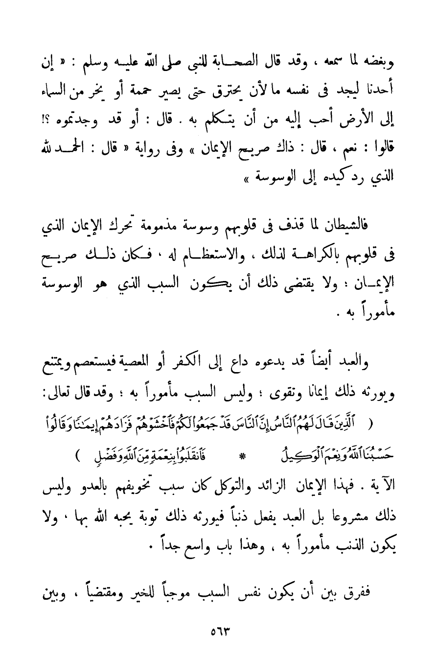 وَبُغْضِهِ لِمَا سَمِعَهُ. وَقَدْ قَالَ الصَّحَابَةُ لِلنَّبِيِّ صَلَّى اللَّهُ عَلَيْهِ وَسَلَّمَ {إنَّ أَحَدَنَا لَيَجِدُ فِي نَفْسِهِ مَا لَأَنْ يَحْتَرِقَ حَتَّى يَصِيرَ حُمَمَةً أَوْ يَخِرَّ مِنْ السَّمَاءِ إلَى الْأَرْضِ أَحَبّ إلَيْهِ مِنْ أَنْ يَتَكَلَّمَ بِهِ. قَالَ: أو قَدْ وَجَدْتُمُوهُ؟ قَالُوا: نَعَمْ قَالَ: ذَاكَ صَرِيحُ الْإِيمَانِ وَفِي رِوَايَةٍ قَالَ: الْحَمْدُ لِلَّهِ الَّذِي رَدَّ كَيْدَهُ إلَى الْوَسْوَسَةِ} فَالشَّيْطَانُ لَمَّا قَذَفَ فِي قُلُوبِهِمْ وَسُوسَةً مَذْمُومَةً تَحَرَّكَ الْإِيمَانُ الَّذِي فِي قُلُوبِهِمْ بِالْكَرَاهَةِ لِذَلِكَ وَالِاسْتِعْظَامِ لَهُ فَكَانَ ذَلِكَ صَرِيحَ الْإِيمَانِ؛ وَلَا يَقْتَضِي ذَلِكَ أَنْ يَكُونَ السَّبَبُ الَّذِي هُوَ الْوَسْوَسَةُ مَأْمُورًا بِهِ. وَالْعَبْدُ أَيْضًا قَدْ يَدْعُوهُ دَاعٍ إلَى الْكُفْرِ أَوْ الْمَعْصِيَةِ فَيَسْتَعْصِمُ وَيَمْتَنِعُ وَيُورِثُهُ ذَلِكَ إيمَانًا وَتَقْوَى؛ وَلَيْسَ السَّبَبُ مَأْمُورًا بِهِ؛ وَقَدْ قَالَ تَعَالَى: {الَّذِينَ قَالَ لَهُمُ النَّاسُ إنَّ النَّاسَ قَدْ جَمَعُوا لَكُمْ فَاخْشَوْهُمْ فَزَادَهُمْ إيمَانًا وَقَالُوا حَسْبُنَا اللَّهُ وَنِعْمَ الْوَكِيلُ} {فَانْقَلَبُوا بِنِعْمَةٍ مِنَ اللَّهِ وَفَضْلٍ} الْآيَةَ. فَهَذَا الْإِيمَانُ الزَّائِدُ وَالتَّوَكُّلُ كَانَ سَبَبَ تَخْوِيفِهِمْ بِالْعَدُوِّ وَلَيْسَ ذَلِكَ مَشْرُوعًا بَلْ الْعَبْدُ يَفْعَلُ ذَنْبًا فَيُورِثُهُ ذَلِكَ تَوْبَةً يُحِبُّهُ اللَّهُ بِهَا وَلَا يَكُونُ الذَّنْبُ مَأْمُورًا بِهِ وَهَذَا بَابٌ وَاسِعٌ جِدًّا. فَفَرَّقَ بَيْنَ أَنْ يَكُونَ نَفْسُ السَّبَبِ مُوجِبًا لِلْخَيْرِ وَمُقْتَضِيًا وَبَيْنَ
