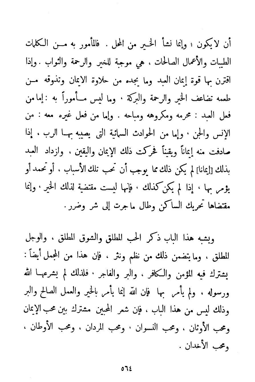 أَنْ لَا يَكُونَ؛ وَإِنَّمَا نَشَأَ الْخَيْرُ مِنْ الْمَحَلِّ. فَالْمَأْمُورُ بِهِ مِنْ الْكَلِمَاتِ الطَّيِّبَاتِ وَالْأَعْمَالِ الصَّالِحَاتِ هِيَ مُوجِبَةٌ لِلْخَيْرِ وَالرَّحْمَةِ وَالثَّوَابِ. وَإِذَا اقْتَرَنَ بِهَا قُوَّةُ إيمَانِ الْعَبْدِ وَمَا يَجِدُهُ مِنْ حَلَاوَةِ الْإِيمَانِ وَتَذَوُّقِهِ مِنْ طَعْمِهِ تَضَاعَفَ الْخَيْرُ وَالرَّحْمَةُ وَالْبَرَكَةُ وَمَا لَيْسَ مَأْمُورًا بِهِ: إمَّا مِنْ فِعْلِ الْعَبْدِ: مُحَرَّمِهِ وَمَكْرُوهِهِ وَمُبَاحِهِ. وَإِمَّا مِنْ فِعْلِ غَيْرِهِ مَعَهُ: مِنْ الْإِنْسِ وَالْجِنِّ وَإِمَّا مِنْ الْحَوَادِثِ السمائية الَّتِي يُصِيبُهُ بِهَا الرَّبُّ إذَا صَادَفَتْ مِنْهُ إيمَانًا وَيَقِينًا فَحَرَّكَتْ ذَلِكَ الْإِيمَانَ وَالْيَقِينَ وَازْدَادَ الْعَبْدُ بِذَلِكَ إيمَانًا لَمْ يَكُنْ ذَلِكَ مِمَّا يُوجِبُ أَنْ تُحَبَّ تِلْكَ الْأَسْبَابُ أَوْ تُحْمَدَ أَوْ يُؤْمَرَ بِهَا إذَا لَمْ يَكُنْ كَذَلِكَ فَإِنَّهَا لَيْسَتْ مُقْتَضِيَةً لِذَلِكَ الْخَيْرِ وَإِنَّمَا مُقْتَضَاهَا تَحْرِيكُ السَّاكِنِ وَطَالَ مَا جَرَتْ إلَى شَرٍّ وَضَرَرٍ. وَيُشْبِهُ هَذَا الْبَابُ ذِكْرَ الْحُبِّ الْمُطْلَقِ وَالشَّوْقِ الْمُطْلَقِ وَالْوَجَلِ الْمُطْلَقِ وَمَا يَتَضَمَّنُ ذَلِكَ مِنْ نَظْمٍ وَنَثْرٍ فَإِنَّ هَذَا مِنْ الْمُجْمَلِ أَيْضًا: يَشْتَرِكُ فِيهِ الْمُؤْمِنُ وَالْكَافِرُ وَالْبَرُّ وَالْفَاجِرُ فَلِذَلِكَ لَمَّ يُشَرِّعْهَا اللَّهُ وَرَسُولُهُ وَلَمْ يَأْمُرْ بِهَا فَإِنَّ اللَّهَ إنَّمَا يَأْمُرُ بِالْخَيْرِ، وَالْعَمَلِ الصَّالِحِ وَالْبِرِّ وَذَلِكَ لَيْسَ مِنْ هَذَا الْبَابِ فَإِنَّ شِعْرَ الْمُحِبِّينَ مُشْتَرِكٌ بَيْنَ مُحِبِّ الْإِيمَانِ وَمُحِبِّ الْأَوْثَانِ وَمُحِبِّ النِّسْوَانِ وَمُحِبِّ المردان وَمُحِبِّ الْأَوْطَانِ وَمُحِبِّ الْأَخْدَانِ.