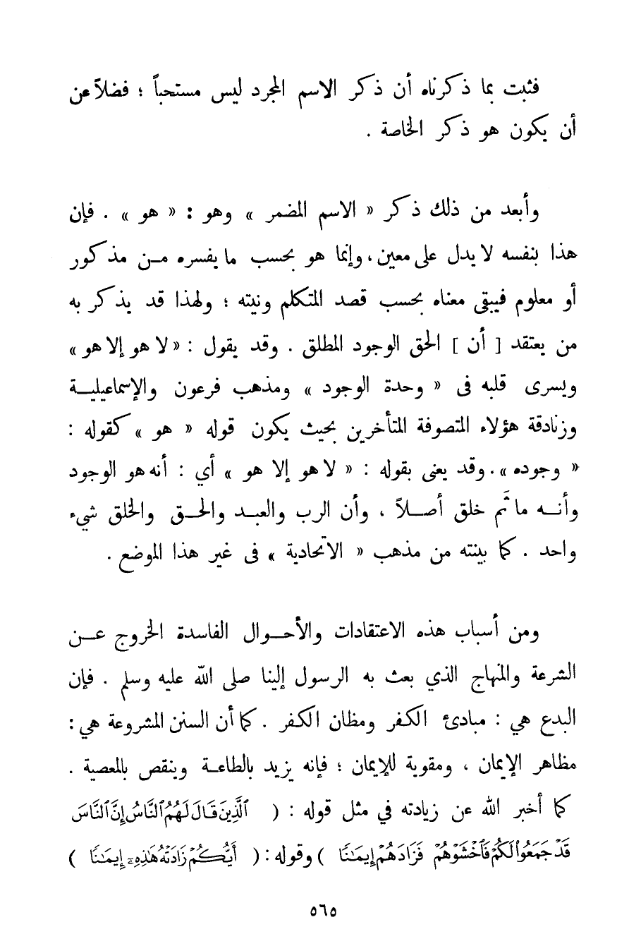 فَثَبَتَ بِمَا ذَكَرْنَاهُ أَنَّ ذِكْرَ الِاسْمِ الْمُجَرَّدِ لَيْسَ مُسْتَحَبًّا؛ فَضْلًا عَنْ أَنْ يَكُونَ هُوَ ذِكْرَ الْخَاصَّةِ. وَأَبْعَدُ مِنْ ذَلِكَ ذِكْرُ " الِاسْمِ الْمُضْمَرِ " وَهُوَ: " هُوَ ". فَإِنَّ هَذَا بِنَفْسِهِ لَا يَدُلُّ عَلَى مُعَيَّنٍ وَإِنَّمَا هُوَ بِحَسَبِ مَا يُفَسِّرُهُ مِنْ مَذْكُورٍ أَوْ مَعْلُومٍ فَيَبْقَى مَعْنَاهُ بِحَسَبِ قَصْدِ الْمُتَكَلِّمِ وَنِيَّتِهِ؛ وَلِهَذَا قَدْ يَذْكُرُ بِهِ مَنْ يَعْتَقِدُ أَنَّ الْحَقَّ الْوُجُودُ الْمُطْلَقُ. وَقَدْ يَقُولُ: " لَا هُوَ إلَّا هُوَ " وَيَسْرِي قَلْبُهُ فِي " وَحْدَةِ الْوُجُودِ " وَمَذْهَبُ فِرْعَوْنَ والْإِسْمَاعِيلِيَّة وَزَنَادِقَةِ هَؤُلَاءِ الْمُتَصَوِّفَةِ الْمُتَأَخِّرِينَ بِحَيْثُ يَكُونُ قَوْلُهُ " هُوَ " كَقَوْلِهِ: " وُجُودُهُ ". وَقَدْ يَعْنِي بِقَوْلِهِ: " لَا هُوَ إلَّا هُوَ " أَيْ: أَنَّهُ هُوَ الْوُجُودُ وَأَنَّهُ مَا ثَمَّ خَلْقٌ أَصْلًا، وَأَنَّ الرَّبَّ وَالْعَبْدَ وَالْحَقَّ وَالْخَلْقَ شَيْءٌ وَاحِدٌ. كَمَا بَيَّنْتُهُ مِنْ مَذْهَبِ " الِاتِّحَادِيَّةِ " فِي غَيْرِ هَذَا الْمَوْضِعِ. وَمِنْ أَسْبَابِ هَذِهِ الِاعْتِقَادَاتِ وَالْأَحْوَالِ الْفَاسِدَةِ الْخُرُوجُ عَنْ الشِّرْعَةِ وَالْمِنْهَاجِ الَّذِي بُعِثَ بِهِ الرَّسُولُ إلَيْنَا صَلَّى اللَّهُ عَلَيْهِ وَسَلَّمَ. فَإِنَّ الْبِدَعَ هِيَ: مَبَادِئُ الْكُفْرِ وَمَظَانُّ الْكُفْرِ. كَمَا أَنَّ السُّنَنَ الْمَشْرُوعَةَ هِيَ: مَظَاهِرُ الْإِيمَانِ وَمُقَوِّيَةٌ لِلْإِيمَانِ؛ فَإِنَّهُ يَزِيدُ بِالطَّاعَةِ وَيَنْقُصُ بِالْمَعْصِيَةِ. كَمَا أَخْبَرَ اللَّهُ عَنْ زِيَادَتِهِ فِي مِثْلِ قَوْلِهِ: {الَّذِينَ قَالَ لَهُمُ النَّاسُ إنَّ النَّاسَ قَدْ جَمَعُوا لَكُمْ فَاخْشَوْهُمْ فَزَادَهُمْ إيمَانًا} وَقَوْلِهِ: {أَيُّكُمْ زَادَتْهُ هَذِهِ إيمَانًا}