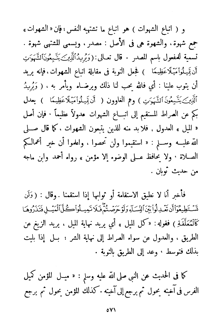 وَاتِّبَاعُ الشَّهَوَاتِ هُوَ اتِّبَاعُ مَا تَشْتَهِيهِ النَّفْسُ؛ فَإِنَّ " الشَّهَوَاتِ " جَمْعُ شَهْوَةٍ وَالشَّهْوَةُ هِيَ فِي الْأَصْلِ: مَصْدَرٌ وَيُسَمَّى الْمُشْتَهَى شَهْوَةً. تَسْمِيَةٌ لِلْمَفْعُولِ بِاسْمِ الْمَصْدَرِ. قَالَ تَعَالَى {وَيُرِيدُ الَّذِينَ يَتَّبِعُونَ الشَّهَوَاتِ أَنْ تَمِيلُوا مَيْلًا عَظِيمًا} فَجَعَلَ التَّوْبَةَ فِي مُقَابَلَةِ اتِّبَاعِ الشَّهَوَاتِ فَإِنَّهُ يُرِيدُ أَنْ يَتُوبَ عَلَيْنَا: أَيْ فَاَللَّهُ يُحِبُّ لَنَا ذَلِكَ وَيَرْضَاهُ وَيَأْمُرُ بِهِ {وَيُرِيدُ الَّذِينَ يَتَّبِعُونَ الشَّهَوَاتِ} وَهُمْ الْغَاوُونَ {أَنْ تَمِيلُوا مَيْلًا عَظِيمًا} يَعْدِلُ بِكُمْ عَنْ الصِّرَاطِ الْمُسْتَقِيمِ إلَى اتِّبَاعِ الشَّهَوَاتِ عُدُولًا عَظِيمًا فَإِنَّ أَصْلَ " الْمَيْلِ " الْعُدُولُ فَلَا بُدَّ مِنْهُ لِلَّذِينَ يَتَّبِعُونَ الشَّهَوَاتِ كَمَا قَالَ صَلَّى اللَّهُ عَلَيْهِ وَسَلَّمَ {اسْتَقِيمُوا وَلَنْ تُحْصَوْا وَاعْلَمُوا أَنَّ خَيْرَ أَعْمَالِكُمْ الصَّلَاةُ وَلَا يُحَافِظُ عَلَى الْوُضُوءِ إلَّا مُؤْمِنٌ} رَوَاهُ أَحْمَد وَابْنُ مَاجَه مِنْ حَدِيثِ ثوبان. فَأَخْبَرُ أَنَّا لَا نُطِيقُ الِاسْتِقَامَةَ أَوْ ثَوَابَهَا إذَا اسْتَقَمْنَا. وَقَالَ {وَلَنْ تَسْتَطِيعُوا أَنْ تَعْدِلُوا بَيْنَ النِّسَاءِ وَلَوْ حَرَصْتُمْ فَلَا تَمِيلُوا كُلَّ الْمَيْلِ فَتَذَرُوهَا كَالْمُعَلَّقَةِ} فَقَوْلُهُ: {كُلَّ الْمَيْلِ} أَيْ يُرِيدُ نِهَايَةَ الْمَيْلِ يُرِيدُ الزَّيْغَ عَنْ الطَّرِيقِ وَالْعُدُولَ عَنْ سَوَاءِ الصِّرَاطِ إلَى نِهَايَةِ الشَّرِّ؛ بَلْ إذَا بُلِيت بِذَلِكَ فَتَوَسَّطْ وَعُدْ إلَى الطَّرِيقِ بِالتَّوْبَةِ. كَمَا فِي الْحَدِيثِ عَنْ النَّبِيِّ صَلَّى اللَّهُ عَلَيْهِ وَسَلَّمَ {مَيْلُ الْمُؤْمِنِ كَمَيْلِ الْفَرَسِ فِي آخِيَتِهِ يَحُولُ ثُمَّ يَرْجِعُ إلَى آخِيَتِهِ. كَذَلِكَ الْمُؤْمِنُ يَحُولُ ثُمَّ يَرْجِعُ