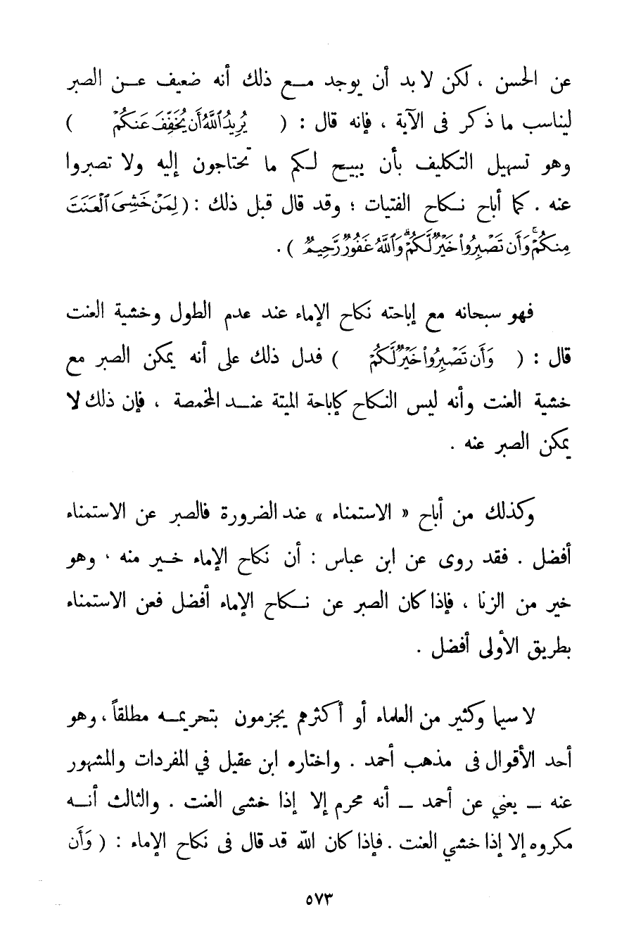 عَنْ الْحَسَنِ لَكِنْ لَا بُدَّ أَنْ يُوجَدَ مَعَ ذَلِكَ أَنَّهُ ضَعِيفٌ عَنْ الصَّبْرِ لِيُنَاسِبَ مَا ذُكِرَ فِي الْآيَةِ فَإِنَّهُ قَالَ: {يُرِيدُ اللَّهُ أَنْ يُخَفِّفَ عَنْكُمْ} وَهُوَ تَسْهِيلُ التَّكْلِيفِ بِأَنْ يُبِيحَ لَكُمْ مَا تَحْتَاجُونَ إلَيْهِ وَلَا تَصْبِرُوا عَنْهُ. كَمَا أَبَاحَ نِكَاحَ الْفَتَيَاتِ؛ وَقَدْ قَالَ قَبْلَ ذَلِكَ {لِمَنْ خَشِيَ الْعَنَتَ مِنْكُمْ وَأَنْ تَصْبِرُوا خَيْرٌ لَكُمْ وَاللَّهُ غَفُورٌ رَحِيمٌ} . فَهُوَ سُبْحَانَهُ مَعَ إبَاحَتِهِ نِكَاحَ الْإِمَاءِ عِنْدَ عَدَمِ الطَّوْلِ وَخَشْيَةِ الْعَنَتِ قَالَ: {وَأَنْ تَصْبِرُوا خَيْرٌ لَكُمْ} فَدَلَّ ذَلِكَ عَلَى أَنَّهُ يُمْكِنُ الصَّبْرُ مَعَ خَشْيَةِ الْعَنَتِ وَأَنَّهُ لَيْسَ النِّكَاحُ كَإِبَاحَةِ الْمَيْتَةِ عِنْدَ الْمَخْمَصَةِ فَإِنَّ ذَلِكَ لَا يُمْكِنُ الصَّبْرُ عَنْهُ. وَكَذَلِكَ مَنْ أَبَاحَ " الِاسْتِمْنَاءَ " عِنْدَ الضَّرُورَةِ فَالصَّبْرُ عَنْ الِاسْتِمْنَاءِ أَفْضَلُ. فَقَدْ رُوِيَ عَنْ ابْنِ عَبَّاسٍ: أَنَّ نِكَاحَ الْإِمَاءِ خَيْرٌ مِنْهُ وَهُوَ خَيْرٌ مِنْ الزِّنَا فَإِذَا كَانَ الصَّبْرُ عَنْ نِكَاحِ الْإِمَاءِ أَفْضَلَ فَعَنْ الِاسْتِمْنَاءِ بِطَرِيقِ الْأَوْلَى أَفْضَلُ. لَا سِيَّمَا وَكَثِيرٌ مِنْ الْعُلَمَاءِ أَوْ أَكْثَرُهُمْ يَجْزِمُونَ بِتَحْرِيمِهِ مُطْلَقًا وَهُوَ أَحَدُ الْأَقْوَالِ فِي مَذْهَبِ أَحْمَد. وَاخْتَارَهُ ابْنُ عَقِيلٍ فِي الْمُفْرَدَاتِ، وَالْمَشْهُورُ عَنْهُ - يَعْنِي عَنْ أَحْمَد - أَنَّهُ مُحَرَّمٌ إلَّا إذَا خَشِيَ الْعَنَتَ. وَالثَّالِثُ أَنَّهُ مَكْرُوهٌ إلَّا إذَا خَشِيَ الْعَنَتَ. فَإِذَا كَانَ اللَّهُ قَدْ قَالَ فِي نِكَاحِ الْإِمَاءِ: {وَأَنْ