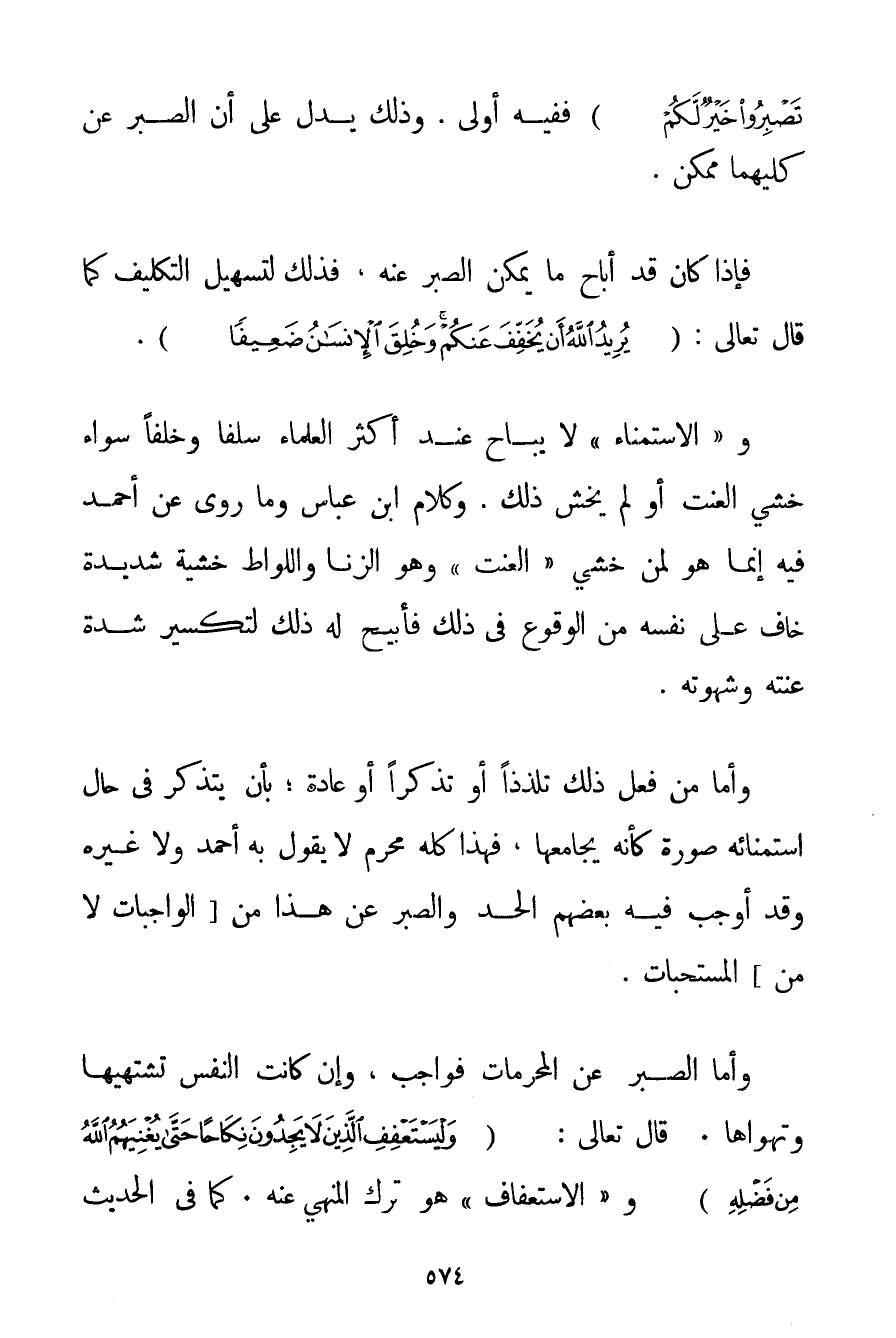 تَصْبِرُوا خَيْرٌ لَكُمْ} فَفِيهِ أَوْلَى. وَذَلِكَ يَدُلُّ عَلَى أَنَّ الصَّبْرَ عَنْ كِلَيْهِمَا مُمْكِنٌ. فَإِذَا كَانَ قَدْ أَبَاحَ مَا يُمْكِنُ الصَّبْرُ عَنْهُ فَذَلِكَ لِتَسْهِيلِ التَّكْلِيفِ كَمَا قَالَ تَعَالَى: {يُرِيدُ اللَّهُ أَنْ يُخَفِّفَ عَنْكُمْ وَخُلِقَ الْإِنْسَانُ ضَعِيفًا} . و " الِاسْتِمْنَاءُ " لَا يُبَاحُ عِنْدَ أَكْثَرِ الْعُلَمَاءِ سَلَفًا وَخَلَفًا سَوَاءٌ خُشِيَ الْعَنَتُ أَوْ لَمْ يُخْشَ ذَلِكَ. وَكَلَامُ ابْنِ عَبَّاسٍ وَمَا رُوِيَ عَنْ أَحْمَد فِيهِ إنَّمَا هُوَ لِمَنْ خَشِيَ " الْعَنَتَ " وَهُوَ الزِّنَا وَاللِّوَاطُ خَشْيَةً شَدِيدَةً خَافَ عَلَى نَفْسِهِ مِنْ الْوُقُوعِ فِي ذَلِكَ فَأُبِيحَ لَهُ ذَلِكَ لِتَكْسِيرِ شِدَّةِ عَنَتِهِ وَشَهْوَتِهِ. وَأَمَّا مَنْ فَعَلَ ذَلِكَ تَلَذُّذًا أَوْ تَذَكُّرًا أَوْ عَادَةً؛ بِأَنْ يَتَذَكَّرَ فِي حَالِ اسْتِمْنَائِهِ صُورَةً كَأَنَّهُ يُجَامِعُهَا فَهَذَا كُلُّهُ مُحَرَّمٌ لَا يَقُولُ بِهِ أَحْمَد وَلَا غَيْرُهُ وَقَدْ أَوْجَبَ فِيهِ بَعْضُهُمْ الْحَدَّ، وَالصَّبْرُ عَنْ هَذَا مِنْ الْوَاجِبَاتِ لَا مِنْ الْمُسْتَحَبَّاتِ.